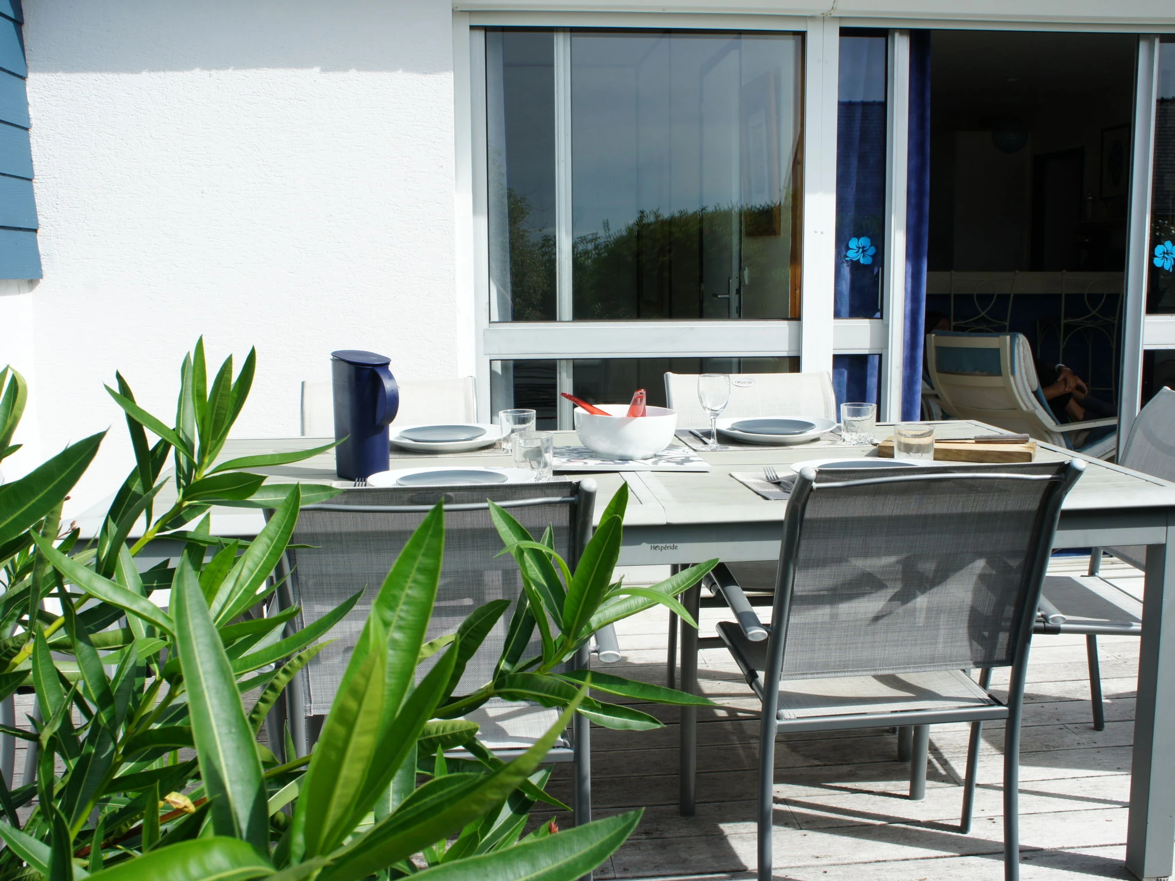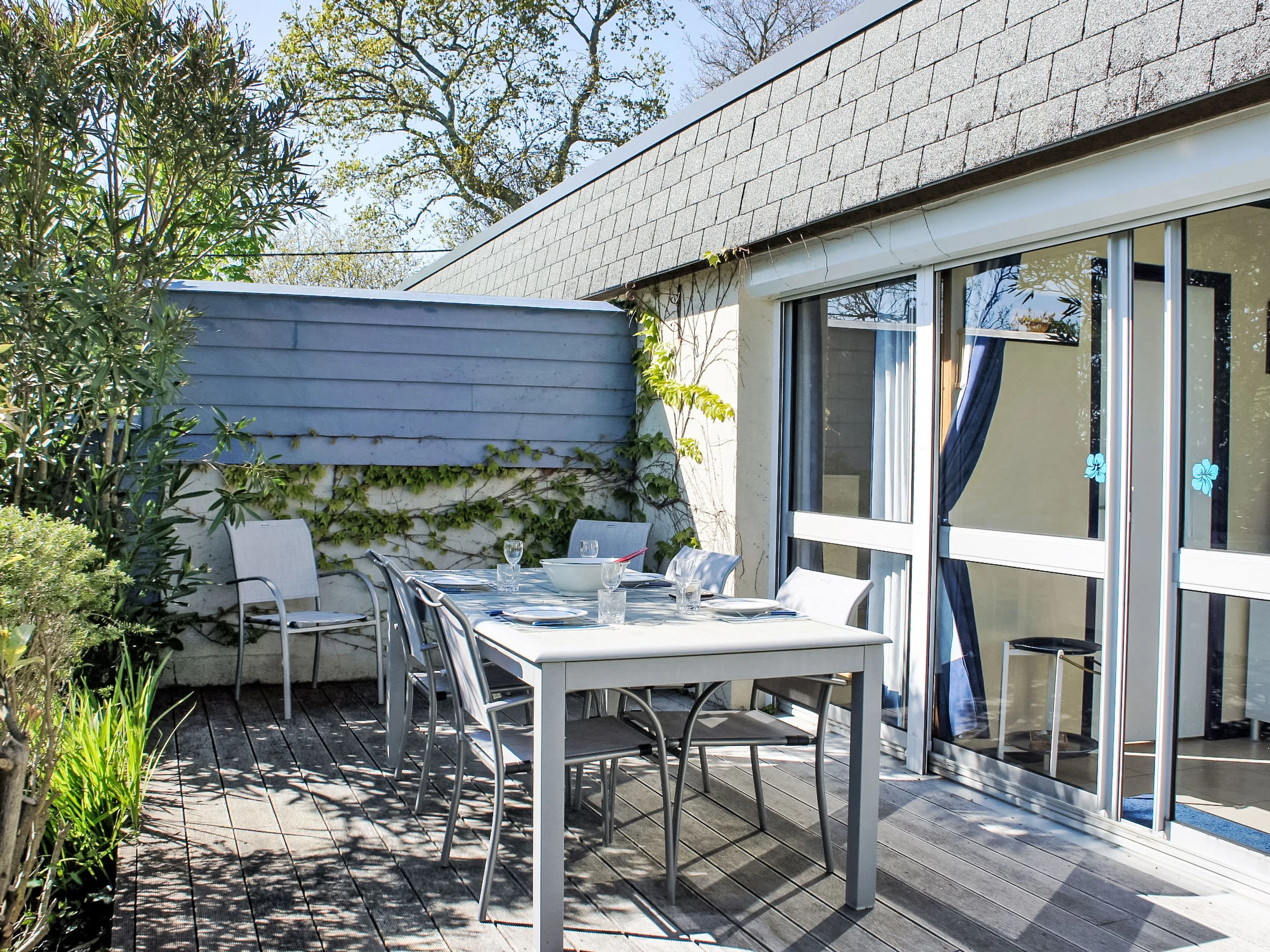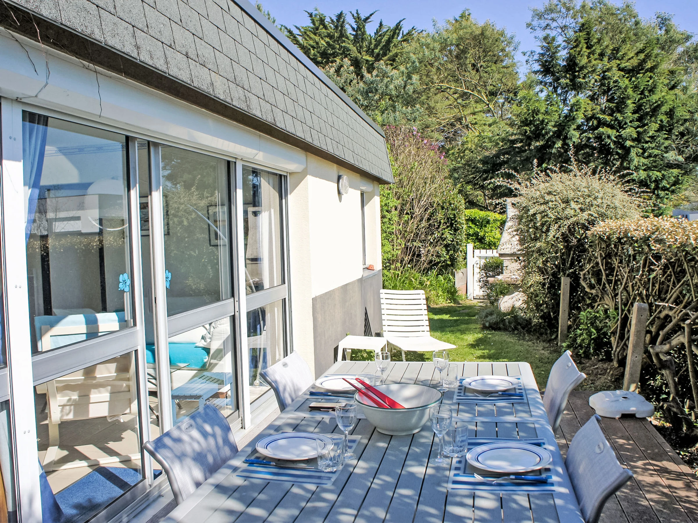 4-room house 60 m2, south facing position. Practical furnishings: living room 25 m2 with panoramic window with TV (flat screen). Exit to the terrace. 1 room 10 m2 with 1 french bed (140 cm, length 190 cm), electric shutters. 2 small children's rooms, each room with 1 bed (90 cm, length 190 cm). Kitchenette (mini-oven, dishwasher, 4 ceramic glass hob hotplates, toaster, kettle, microwave, freezer, electric coffee machine) with bar. Shower, sep. WC. Electric heating. Terrace 20 m2, south facing position. Terrace furniture, barbecue. View of the sea and the bay. Facilities: washing machine, hair dryer. Please note: non-smoking house. Maximum 1 pet/ dog allowed. Smoke alarm.