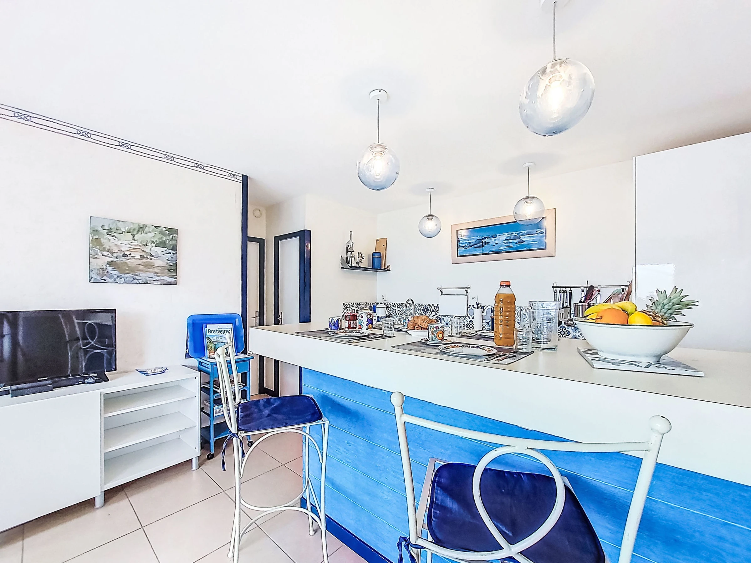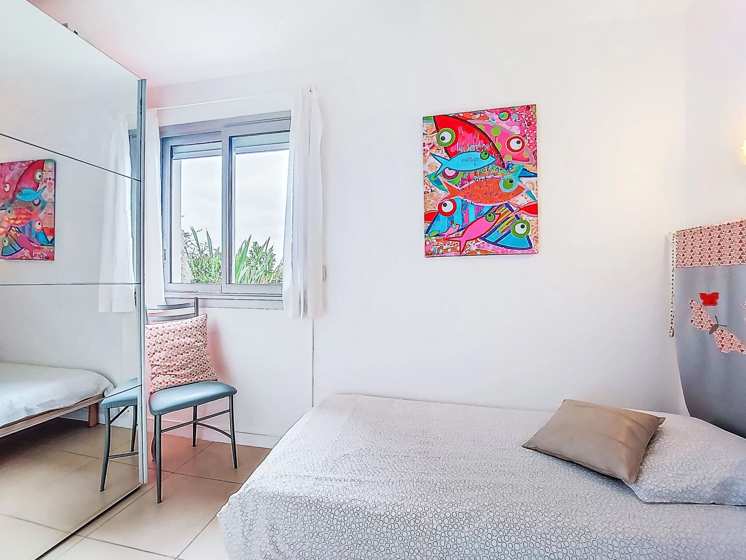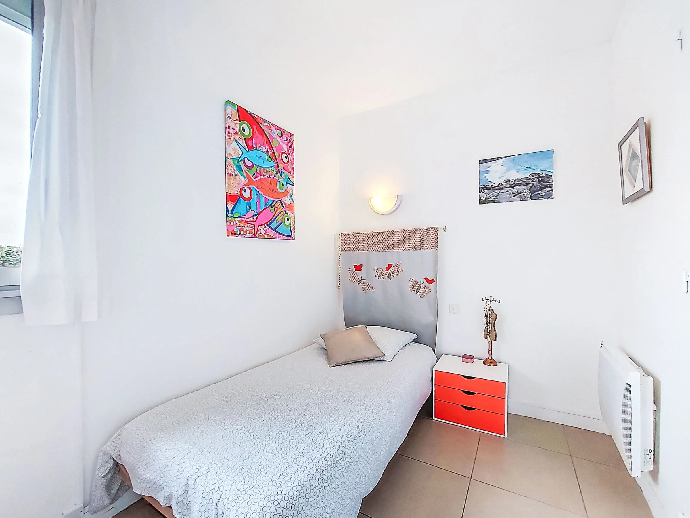 4-room house 60 m2, south facing position. Practical furnishings: living room 25 m2 with panoramic window with TV (flat screen). Exit to the terrace. 1 room 10 m2 with 1 french bed (140 cm, length 190 cm), electric shutters. 2 small children's rooms, each room with 1 bed (90 cm, length 190 cm). Kitchenette (mini-oven, dishwasher, 4 ceramic glass hob hotplates, toaster, kettle, microwave, freezer, electric coffee machine) with bar. Shower, sep. WC. Electric heating. Terrace 20 m2, south facing position. Terrace furniture, barbecue. View of the sea and the bay. Facilities: washing machine, hair dryer. Please note: non-smoking house. Maximum 1 pet/ dog allowed. Smoke alarm.