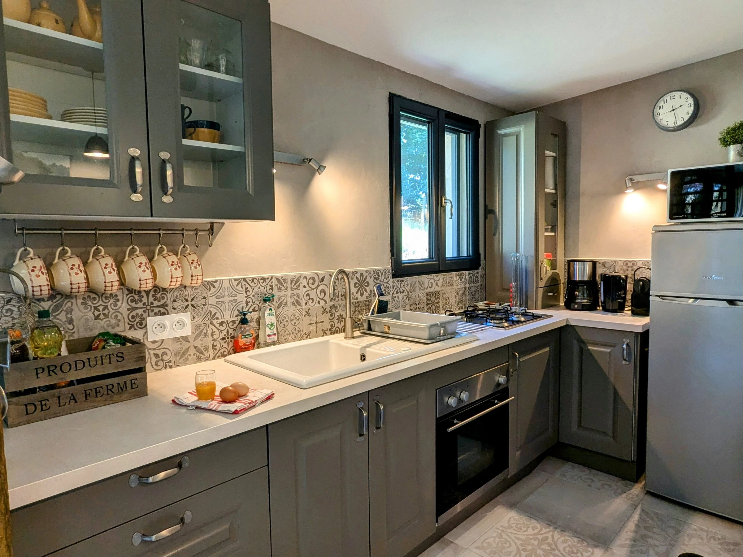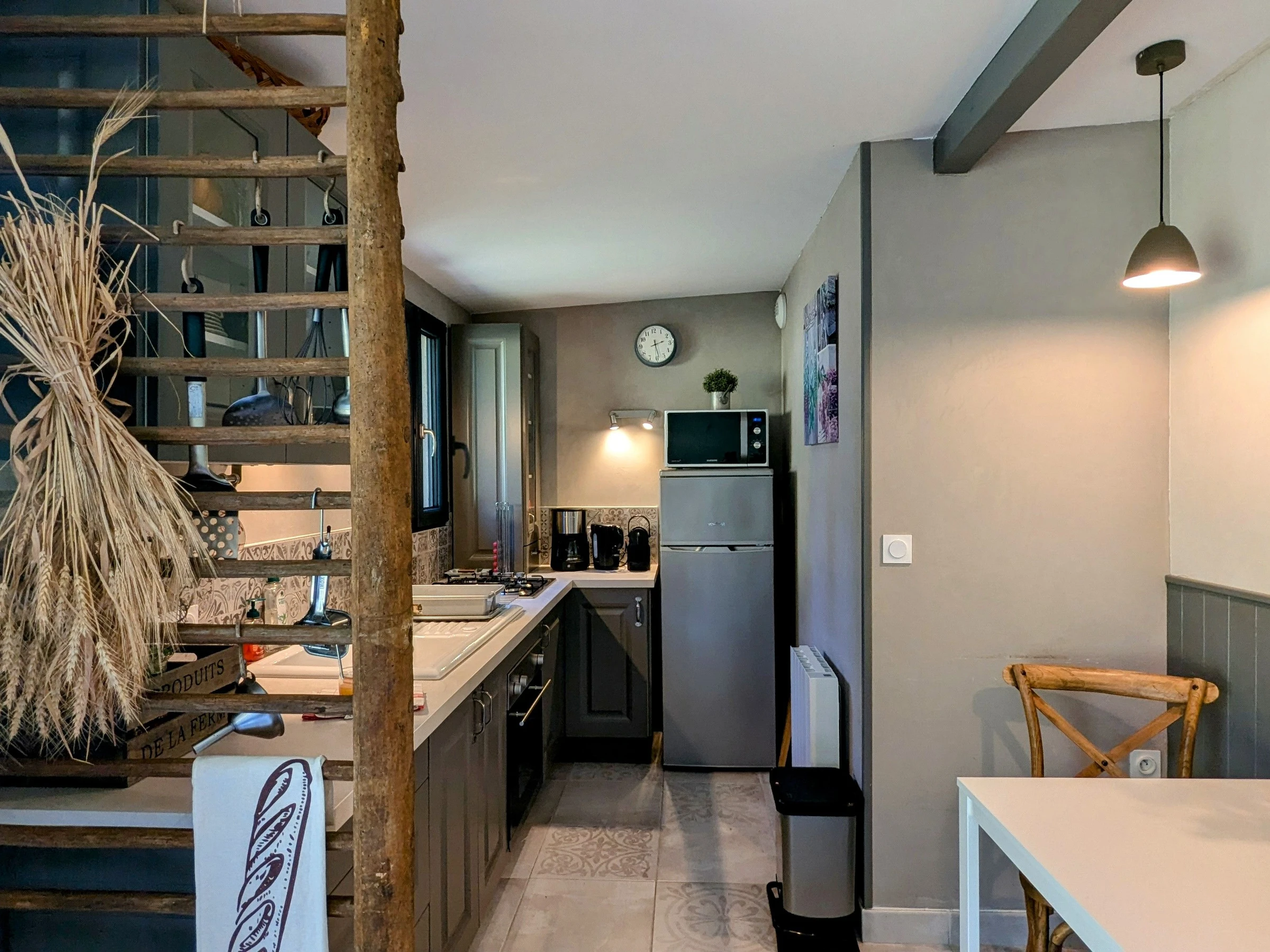 Living room with lounge, wood stove. Open equipped kitchen. A bedroom with a 160 bed. Shower room with Italian shower and separate toilet. Laundry room and bicycle shelter.