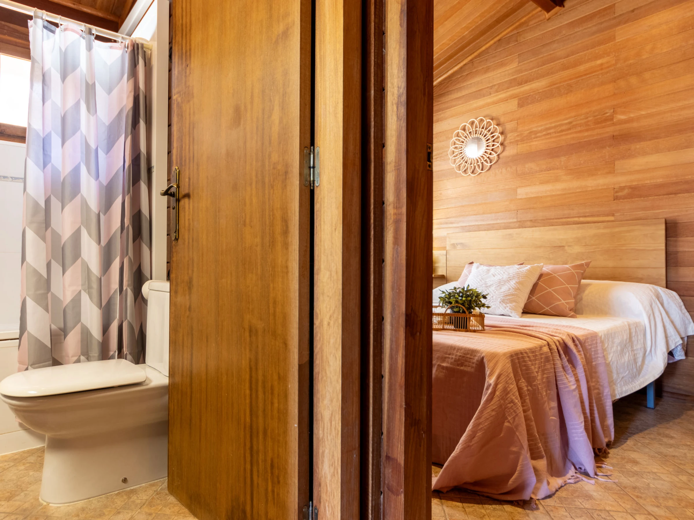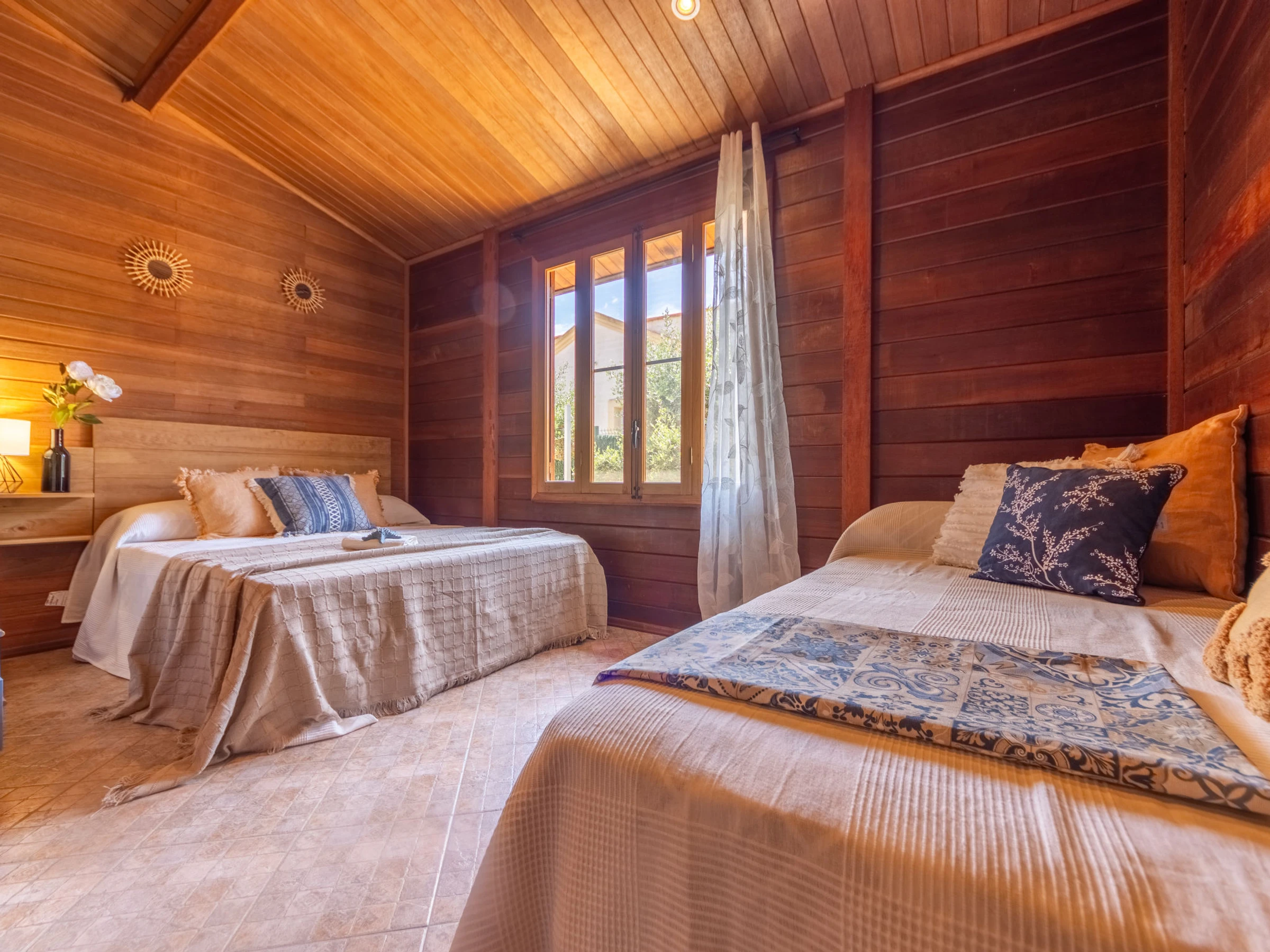 "Tropical 2", 2-room chalet 62 m2, on the ground floor. Comfortable and beautiful furnishings: living/dining room with dining table, digital TV, air conditioning and forced-air heating. Exit to the patio. 1 double bedroom with 1 double bed (1 x 150 cm, length 190 cm), 1 pull-out bed (2 pers. 2 x 90 cm, length 190 cm). 1 double bedroom with 1 french bed (150 cm, length 190 cm). Open kitchen in the entrance (4 hot plates, oven, toaster, microwave, freezer, electric coffee machine, pizza oven) with bar. Hip bath/WC. Air-conditioning, forced-air heating. Terrace furniture, barbecue, deck chairs, covered balcony. Facilities: washing machine, iron, mosquito net, hair dryer. Internet (WiFi, free). Parking at the house. Suitable for families. Maximum 2 pets/ dogs allowed. [hidden] // Reg. Nr.: ESFCT0000430190001019260000000000000000HUTTE000447