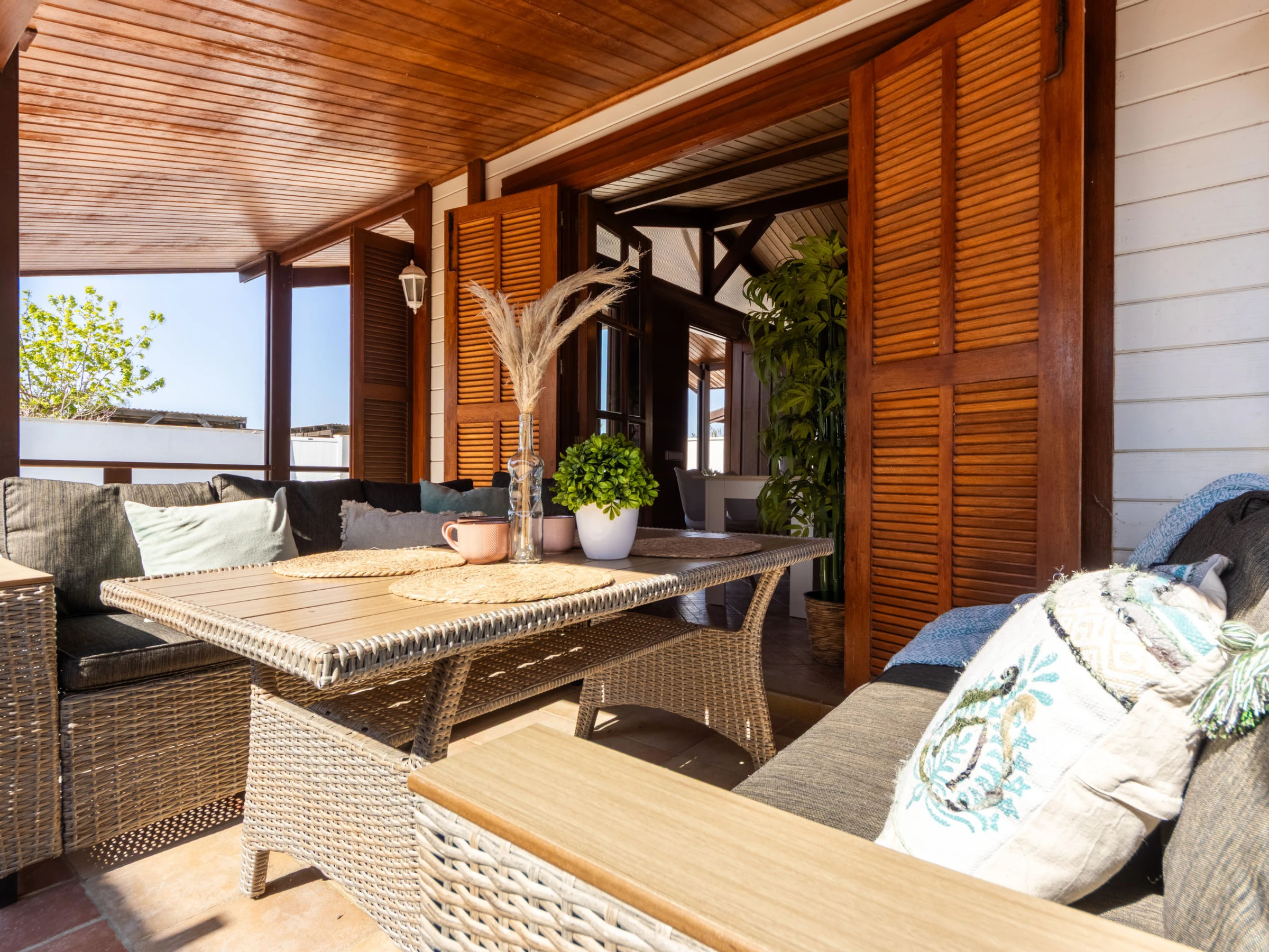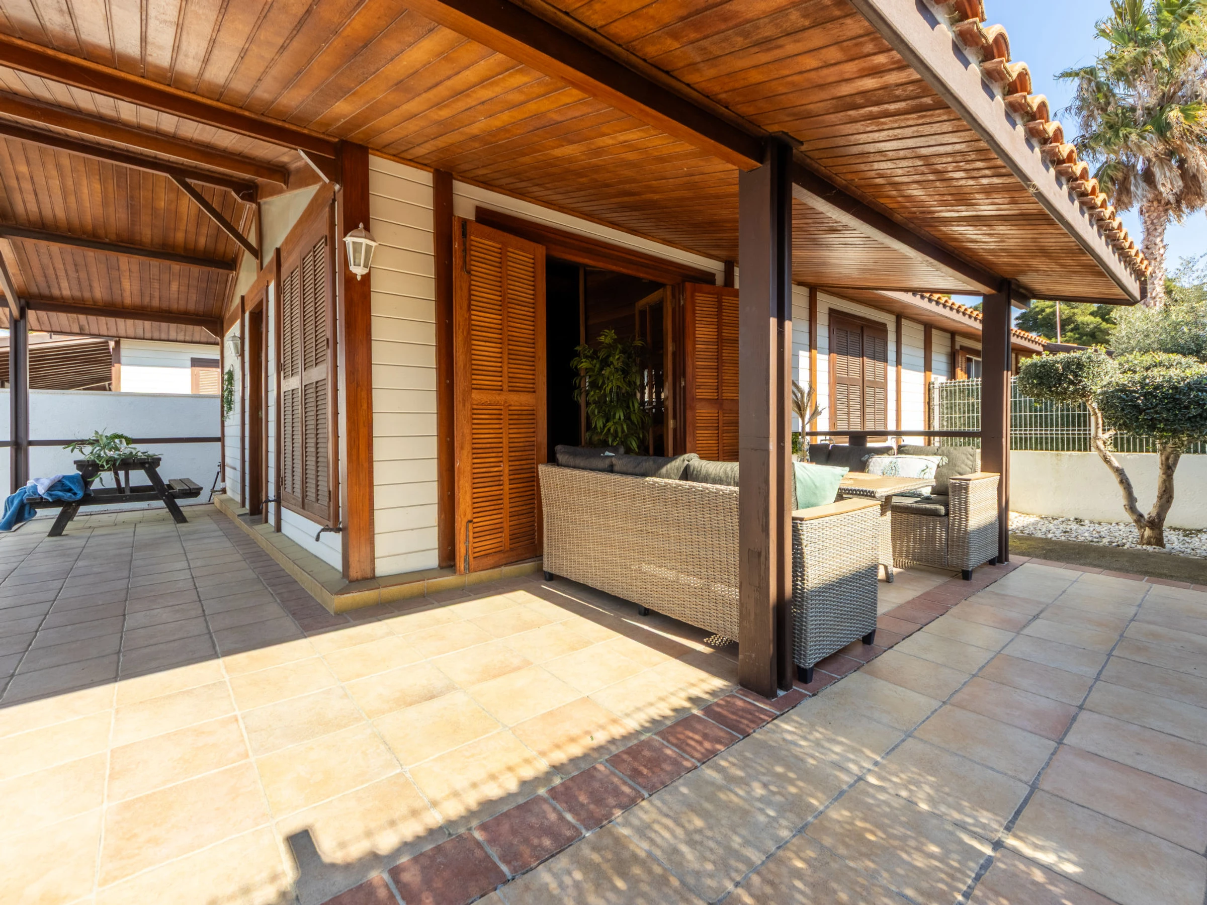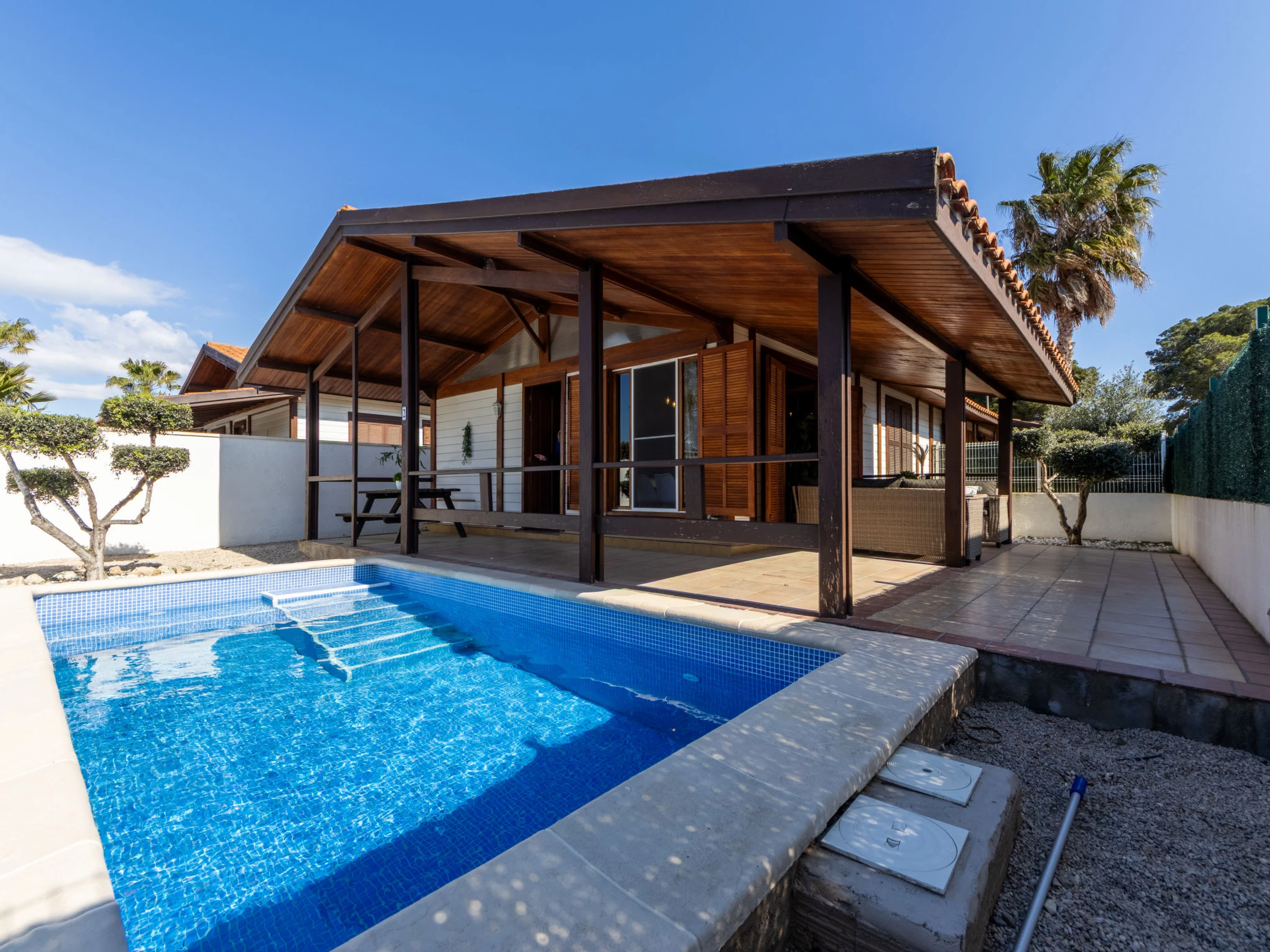 Riumar 10 km from Deltebre: Beautiful, cosy timber house "Tropical 2", semi-detached. In a quiet, sunny position, 500 m from the sea, 500 m from the beach. Private: property (fenced), natural garden, swimming pool angular (5 x 3 m, depth 1 - depth 60 cm, seasonal availability: [hidden] - [hidden] with internal staircase. Pergola, terrace, garden furniture, barbecue. In the house: WiFi, air conditioning. Parking at the house, public parking on the road. Supermarket 500 m, restaurant, bar 300 m, bakery 700 m, bus stop "Riumar" 650 m, railway station "Aldea- Amposta" 25 km, sandy beach "Riumar" 500 m. Sports harbour 1 km. Nearby attractions: Parque natural Delta del Ebro 2 km, Tortosa 35 km, Playa el Trabucador 29 km, Barcelona 190 km, Port Aventura 70 km. Hiking paths: Parque natural Puerto Tortosa Beseit 52 km, GR 92 15 km. Please note: car recommended. Suitable for families. Groups of teenagers on request only. The photo is just an example.