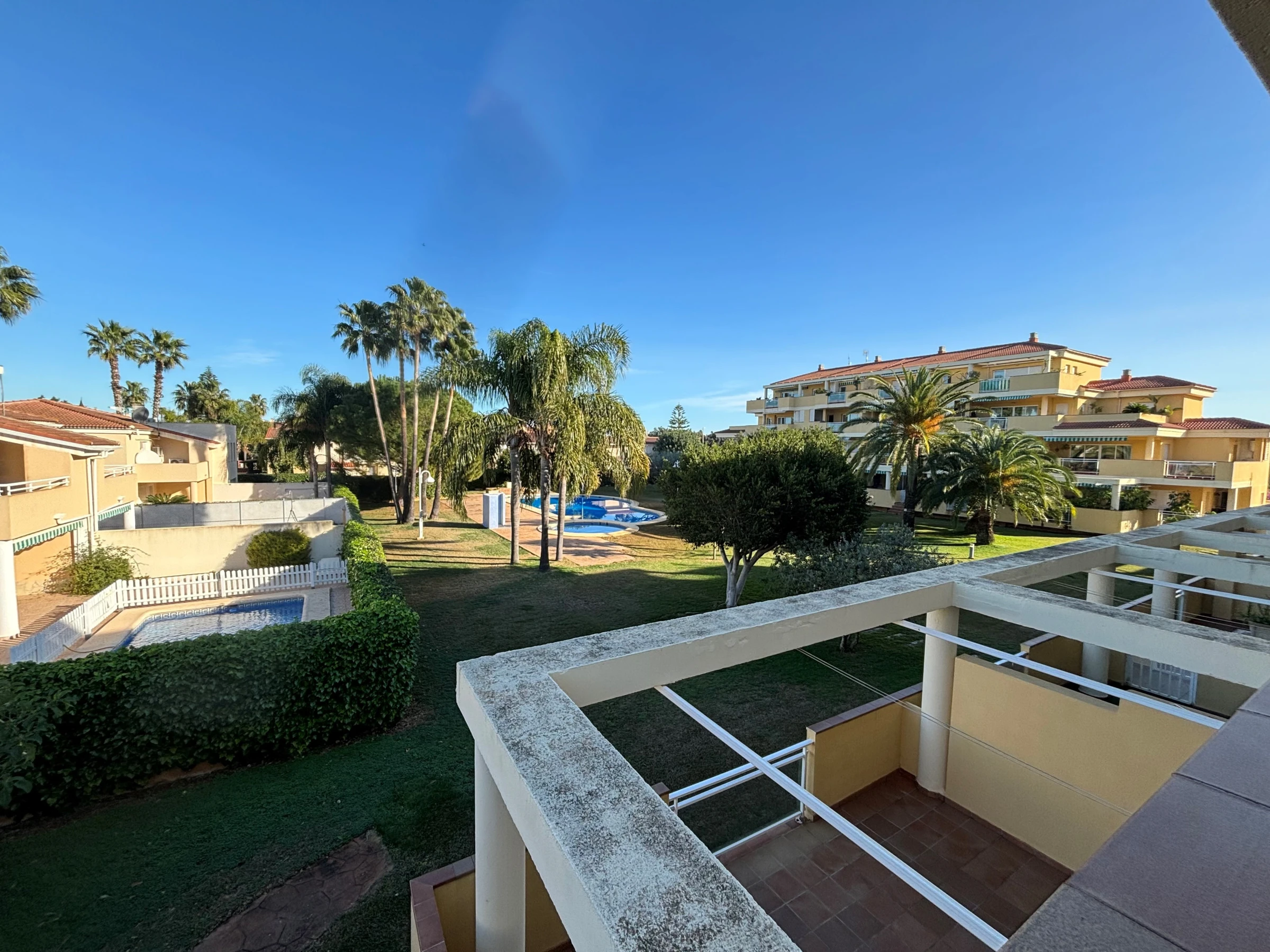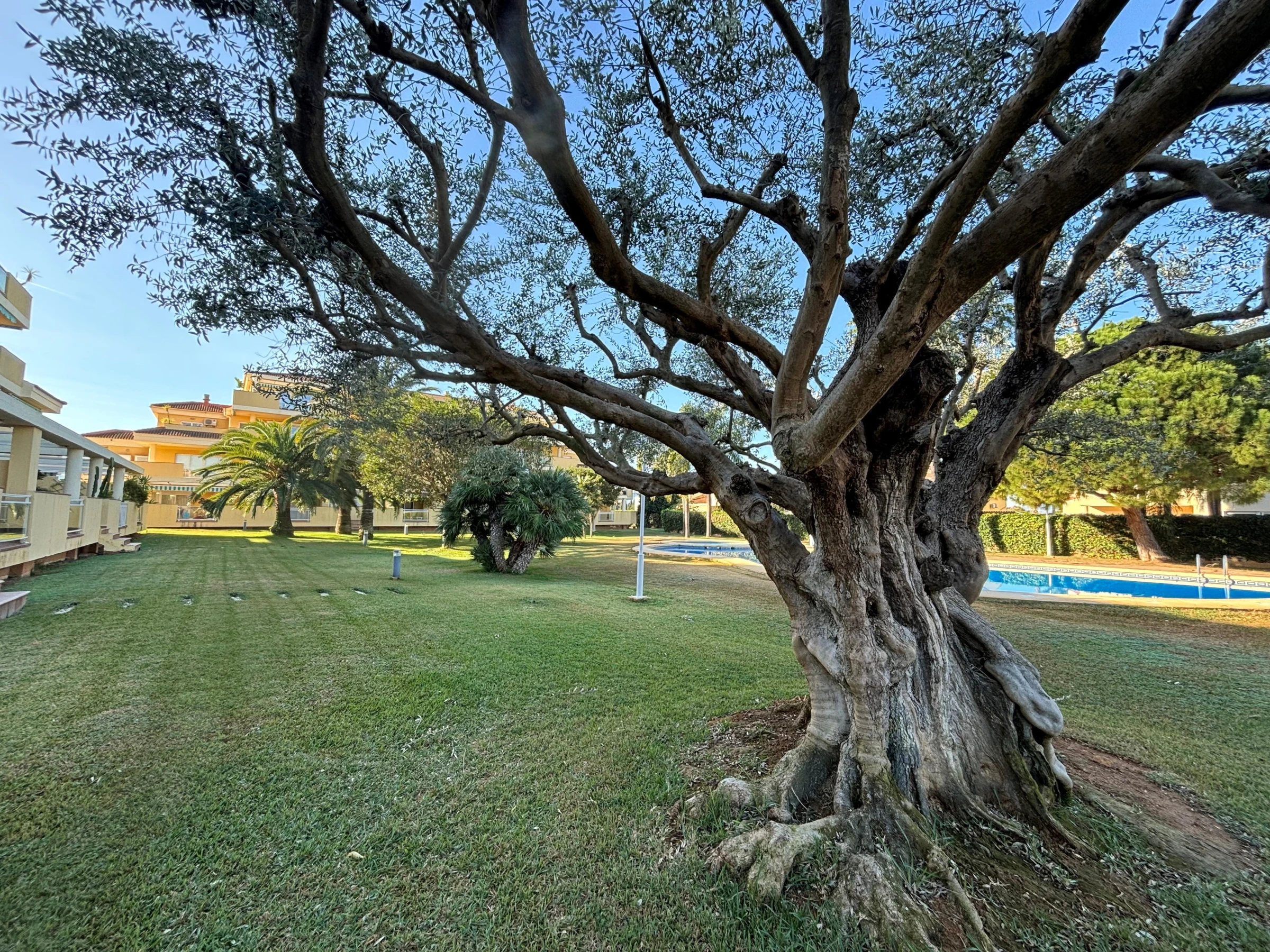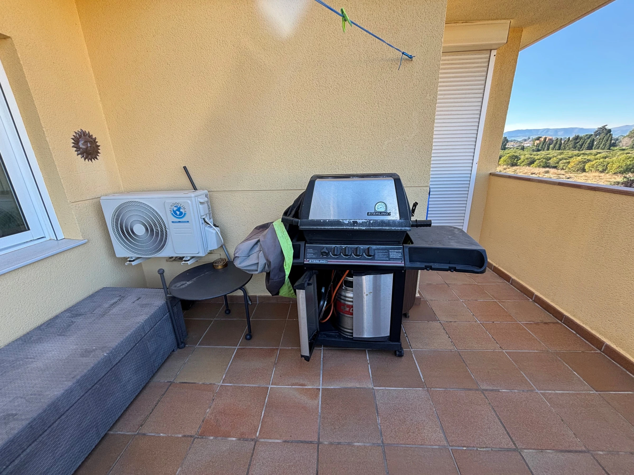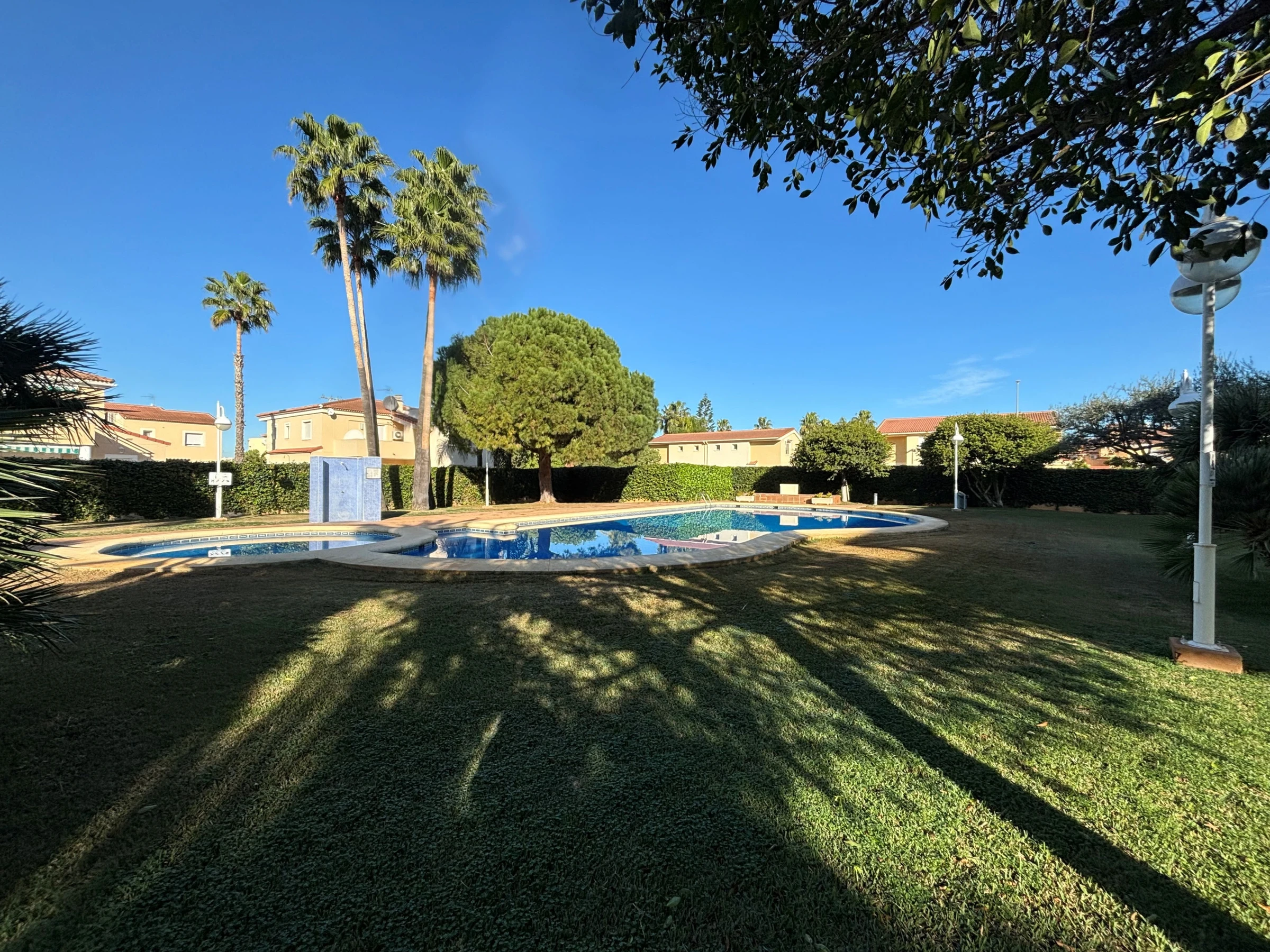 It has a garden, garden furniture, fenced plot, terrace, washing machine, iron, air conditioning, community+children's pool, covered parking in the same building, 1 TV.