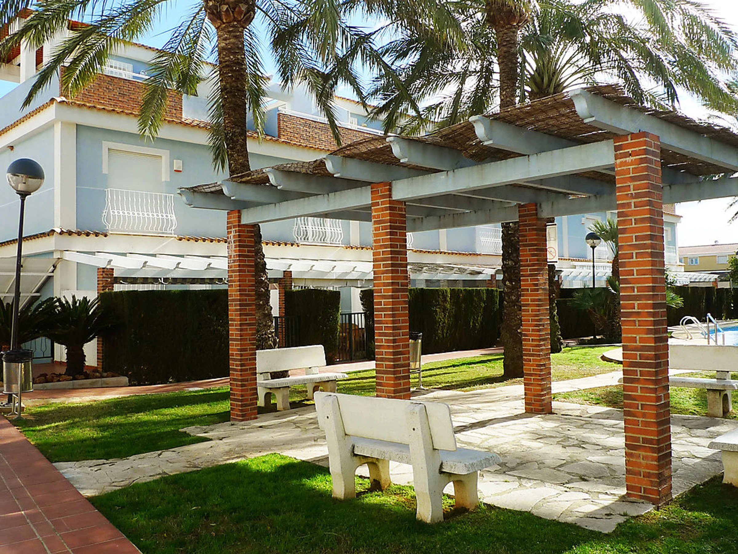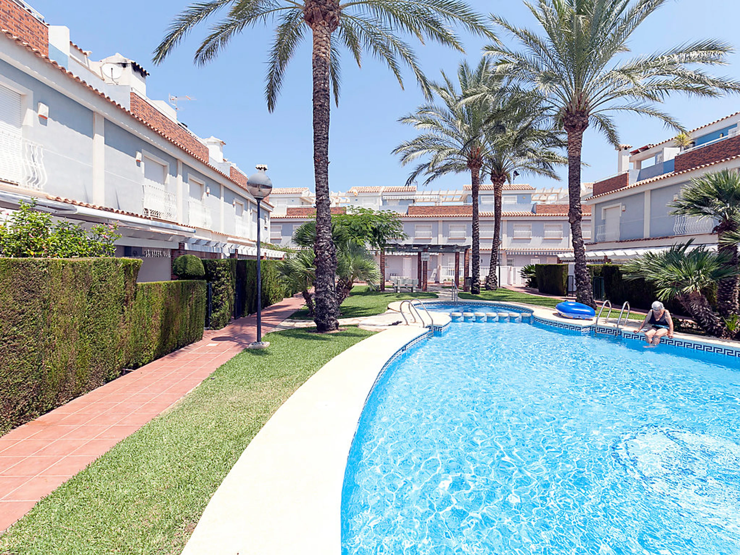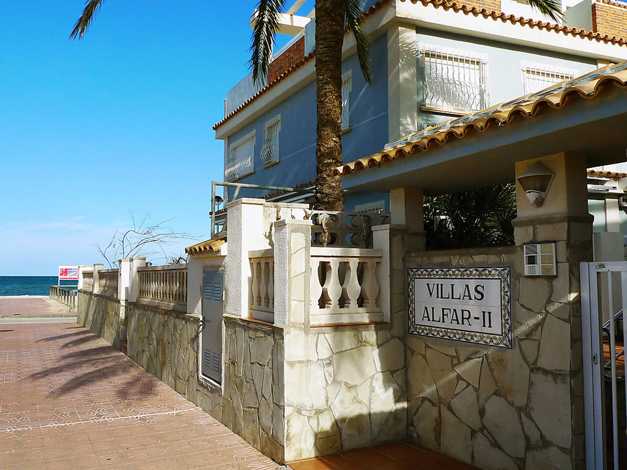 Terraced house "Villas Alfar II", 2 storeys, built in 2002. In the district of Playa Almadrava, Els Poblets, on the outskirts, 2 km from the centre of Els Poblets, 8.5 km from the centre of Dénia, 30 m from the sea. For shared use: well-kept garden (fenced) with lawn, plants, flowers and trees, swimming pool [hidden].). Children's pool, outdoor shower. Single garage at the house. Supermarket, restaurant, bar 450 m, bus stop 150 m, sandy beach 1 km, shingle beach 30 m. Golf course 12 km, tennis 6 km.