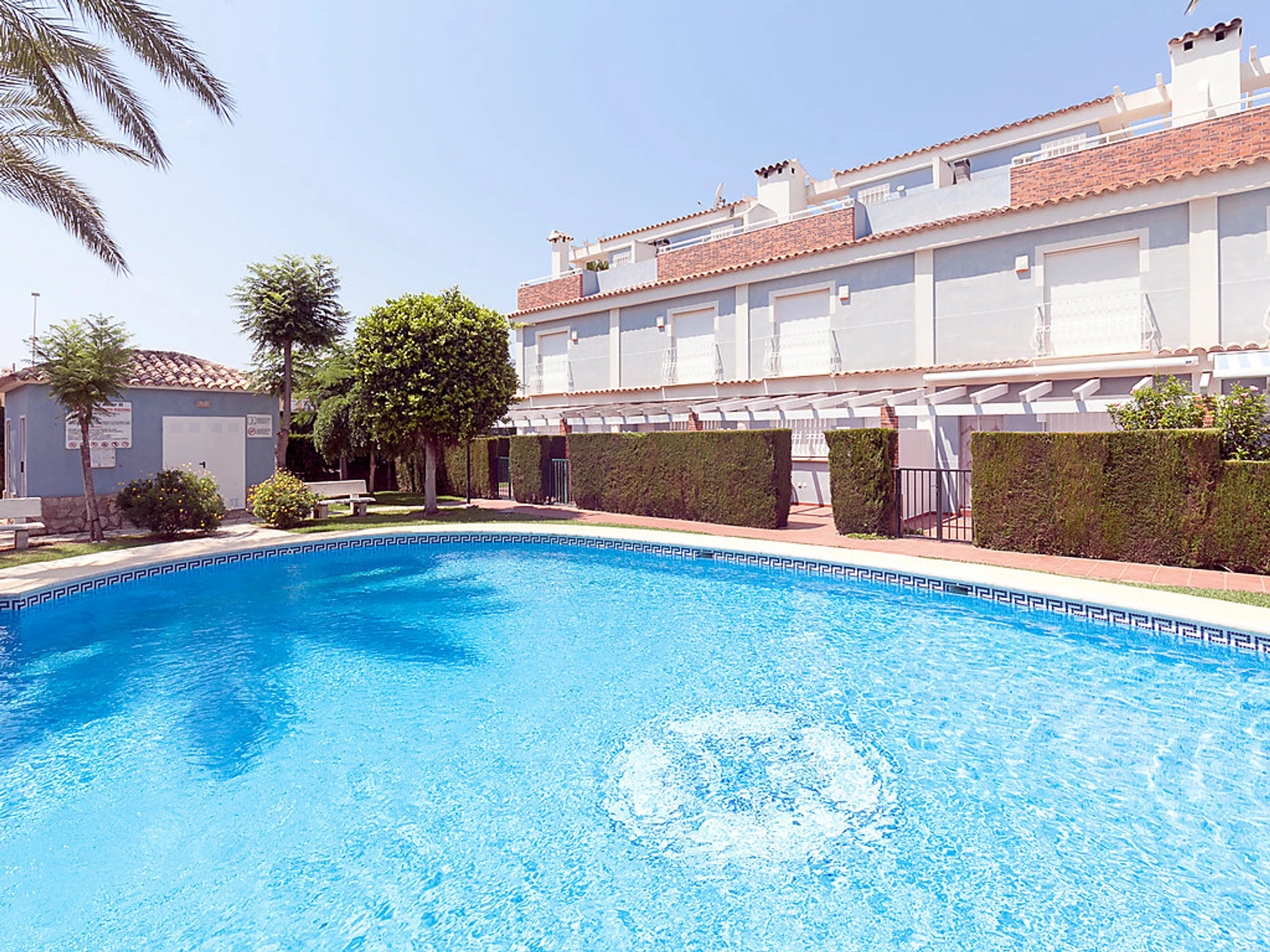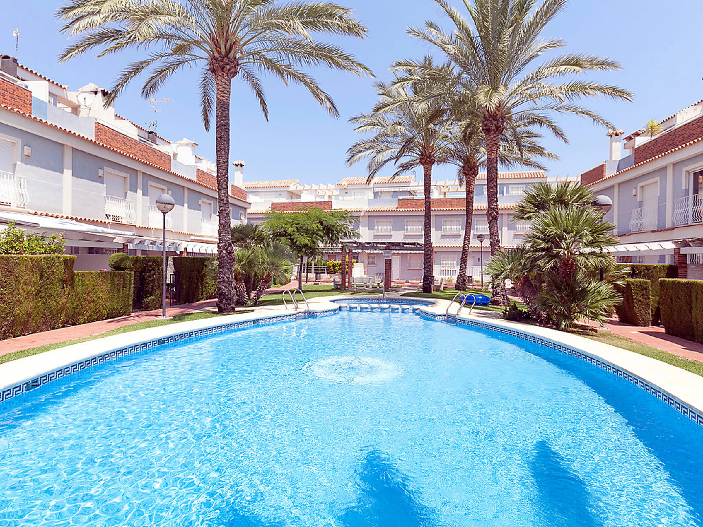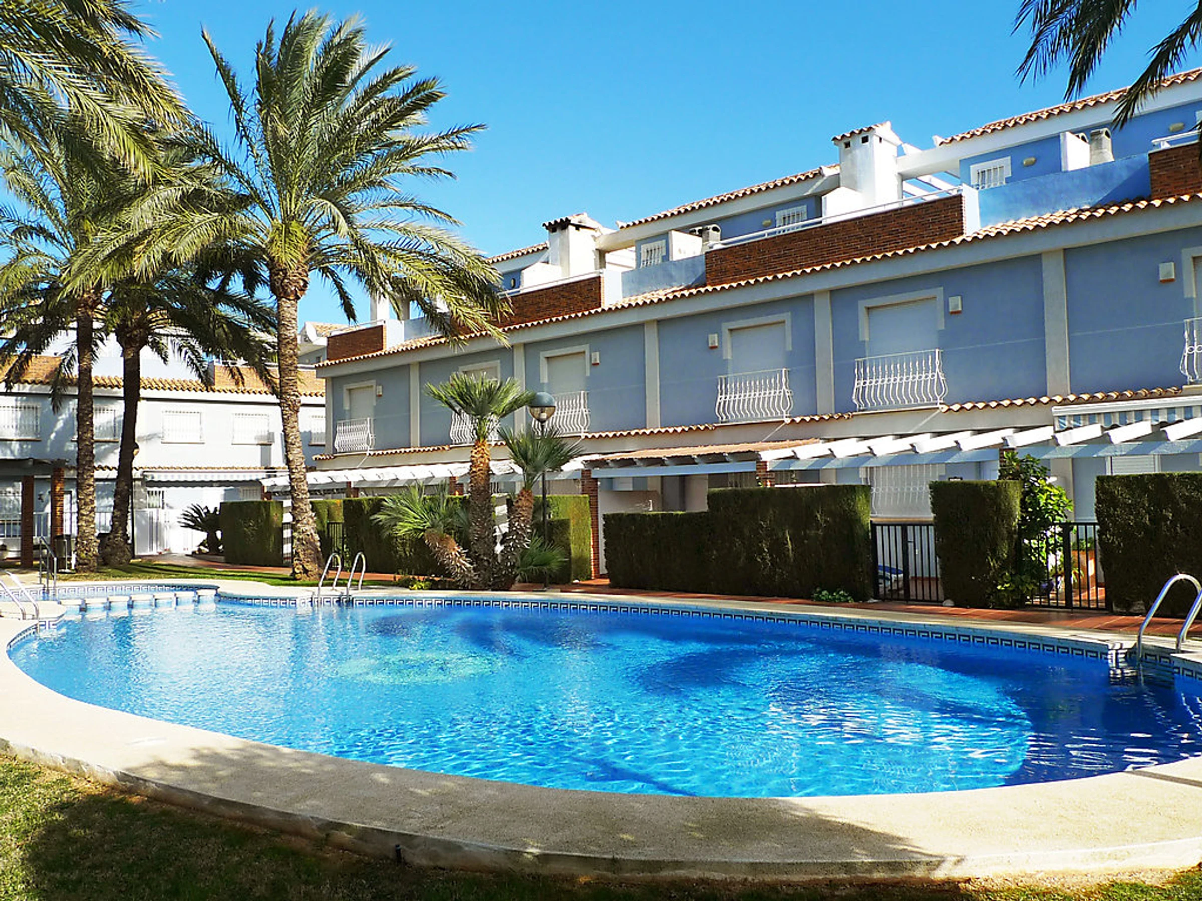 Terraced house "Villas Alfar II", 2 storeys, built in 2002. In the district of Playa Almadrava, Els Poblets, on the outskirts, 2 km from the centre of Els Poblets, 8.5 km from the centre of Dénia, 30 m from the sea. For shared use: well-kept garden (fenced) with lawn, plants, flowers and trees, swimming pool [hidden].). Children's pool, outdoor shower. Single garage at the house. Supermarket, restaurant, bar 450 m, bus stop 150 m, sandy beach 1 km, shingle beach 30 m. Golf course 12 km, tennis 6 km.