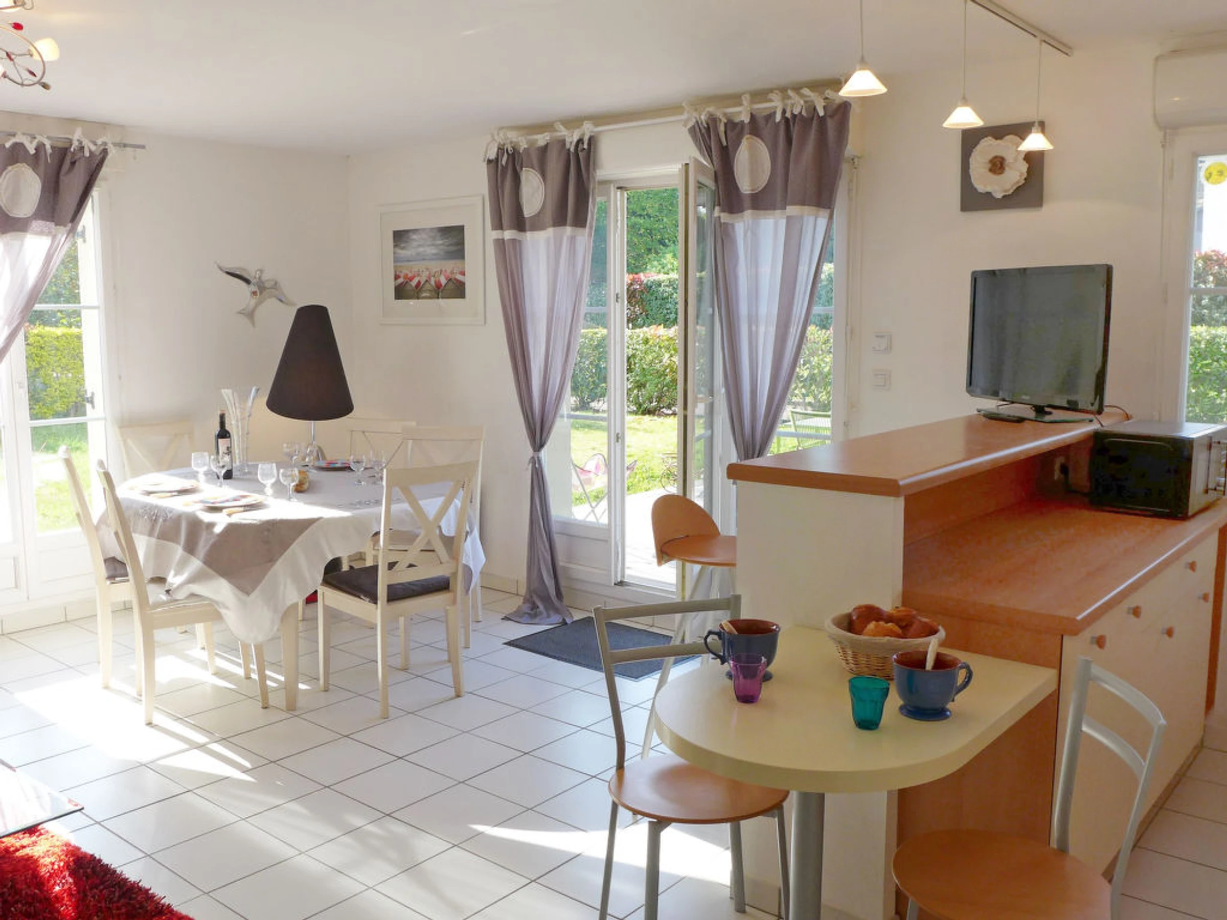 "Clos des orchidées", 3-room apartment 62 m2, on the ground floor. Bright, very beautiful and cosy furnishings: large living/dining room. 1 room with 1 french bed (1 x 140 cm, length 190 cm), TV (flat screen). Exit to the terrace. 1 room with 1 french bed (1 x 140 cm, length 190 cm). Exit to the terrace. Small, open kitchen (oven, dishwasher, 4 ceramic glass hob hotplates, microwave). Shower, sep. WC. Electric heating. Large terrace 50 m2, small garden 173 m2. Terrace furniture. Facilities: washing machine. Included: Final cleaning, Small pet Available on site with supplement: WIFI (3/4G wireless modem for max. 10 connecting devices – LIMIT 1 GB per day) 5.6EUR per day, Towels (initial supply) 5.0EUR per person, Bed linen (initial supply) 10.0EUR per person, Booster seat (for children) 3.0EUR per day, Cot (up to 2 years) 3.0EUR per day, Highchair 3.0EUR per day, Buggy 3.0EUR per day Mandatory extra services on site: Local tax 0.7EUR per person/day, Local tax babies (0-2) (per person/day), Local tax children (per person/day), Local tax 0.4EUR per person/day, Local tax 0.5EUR per person/day