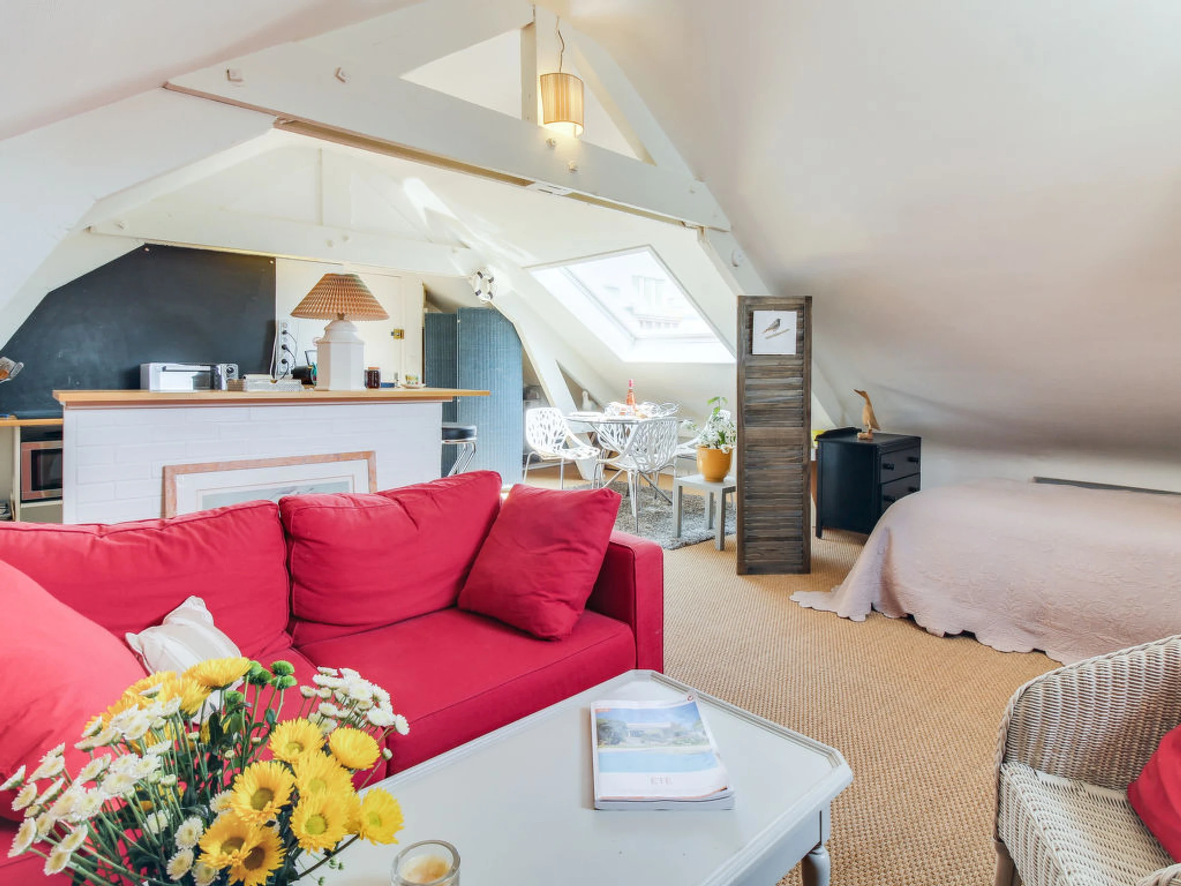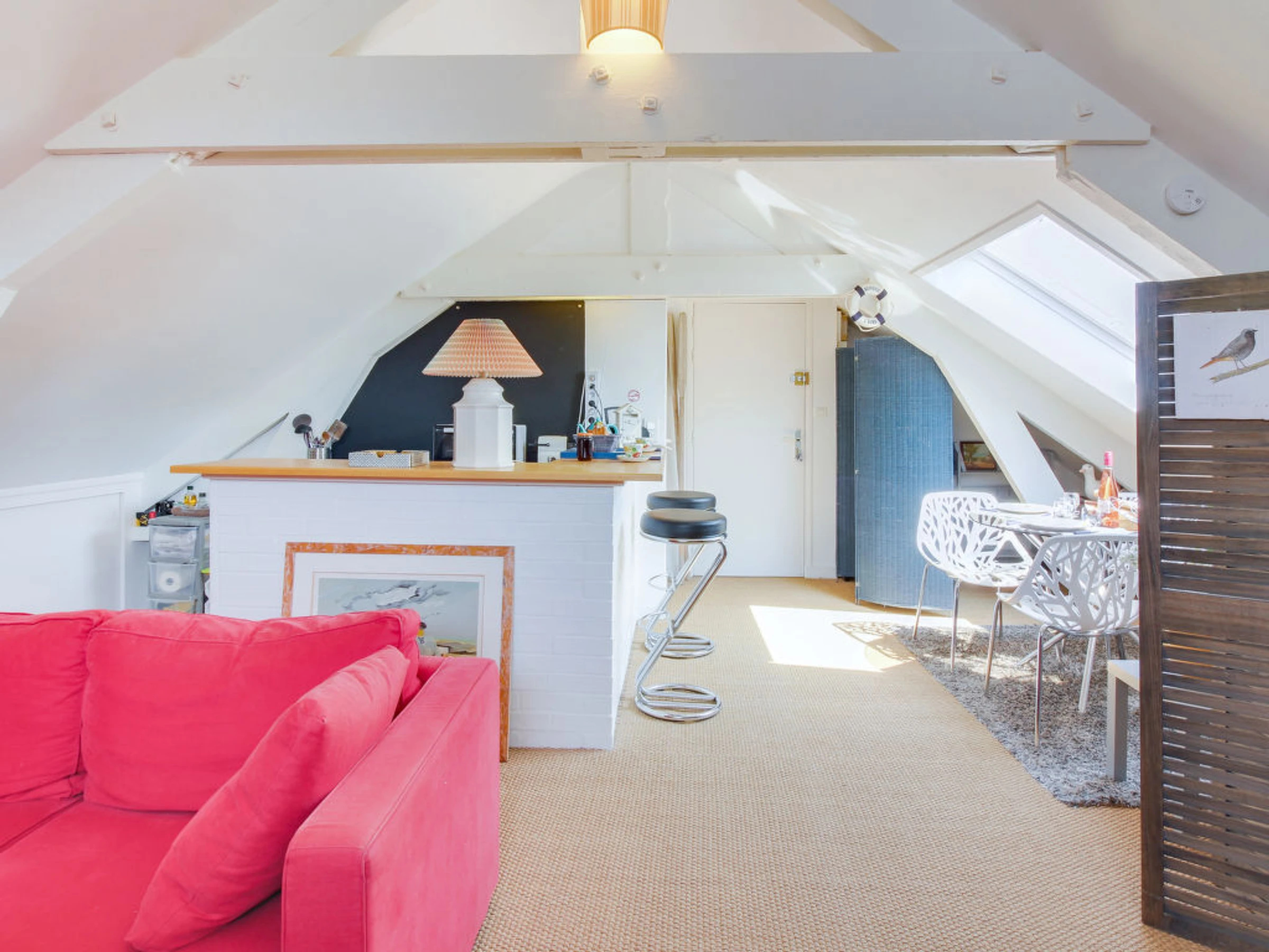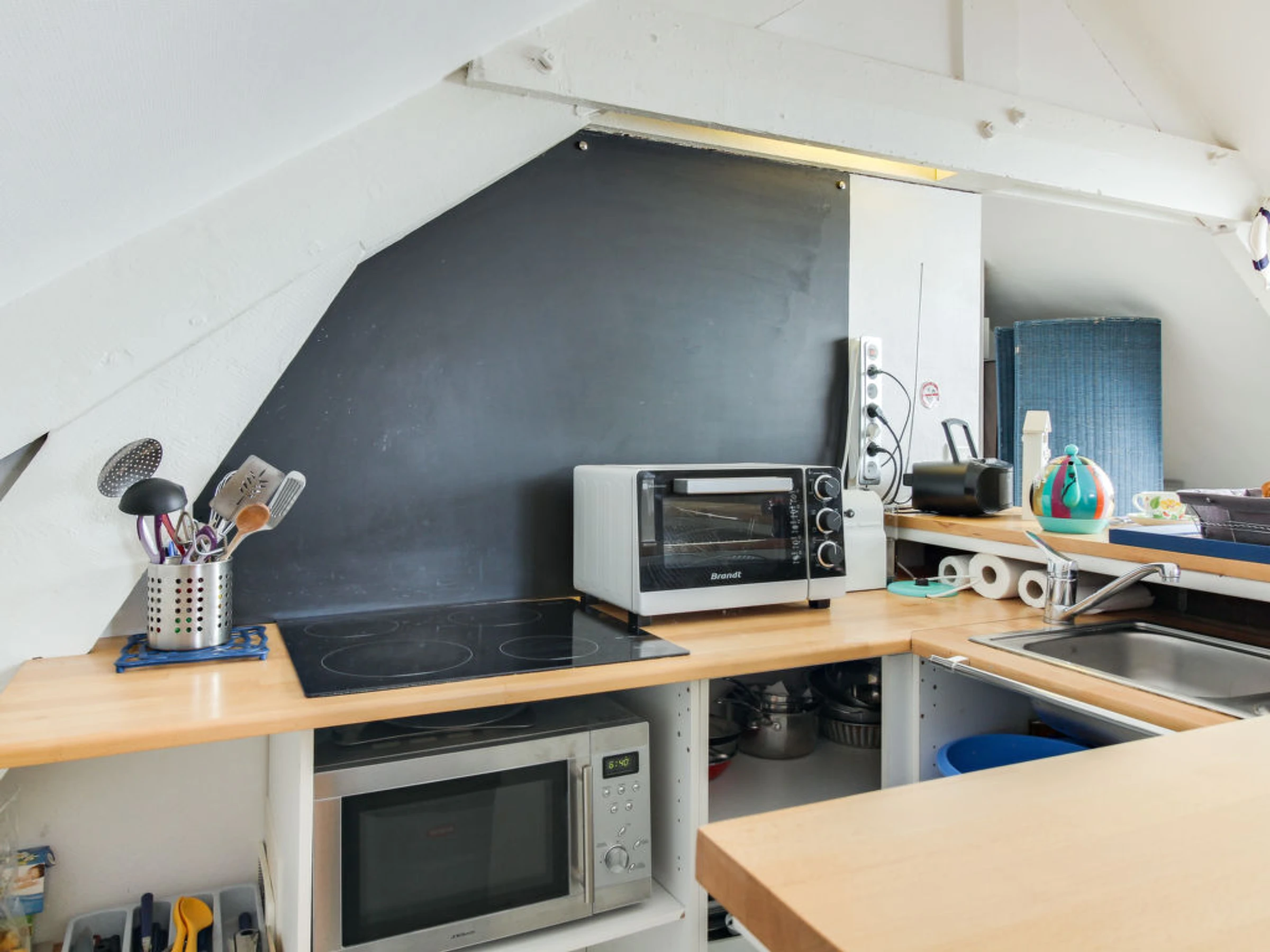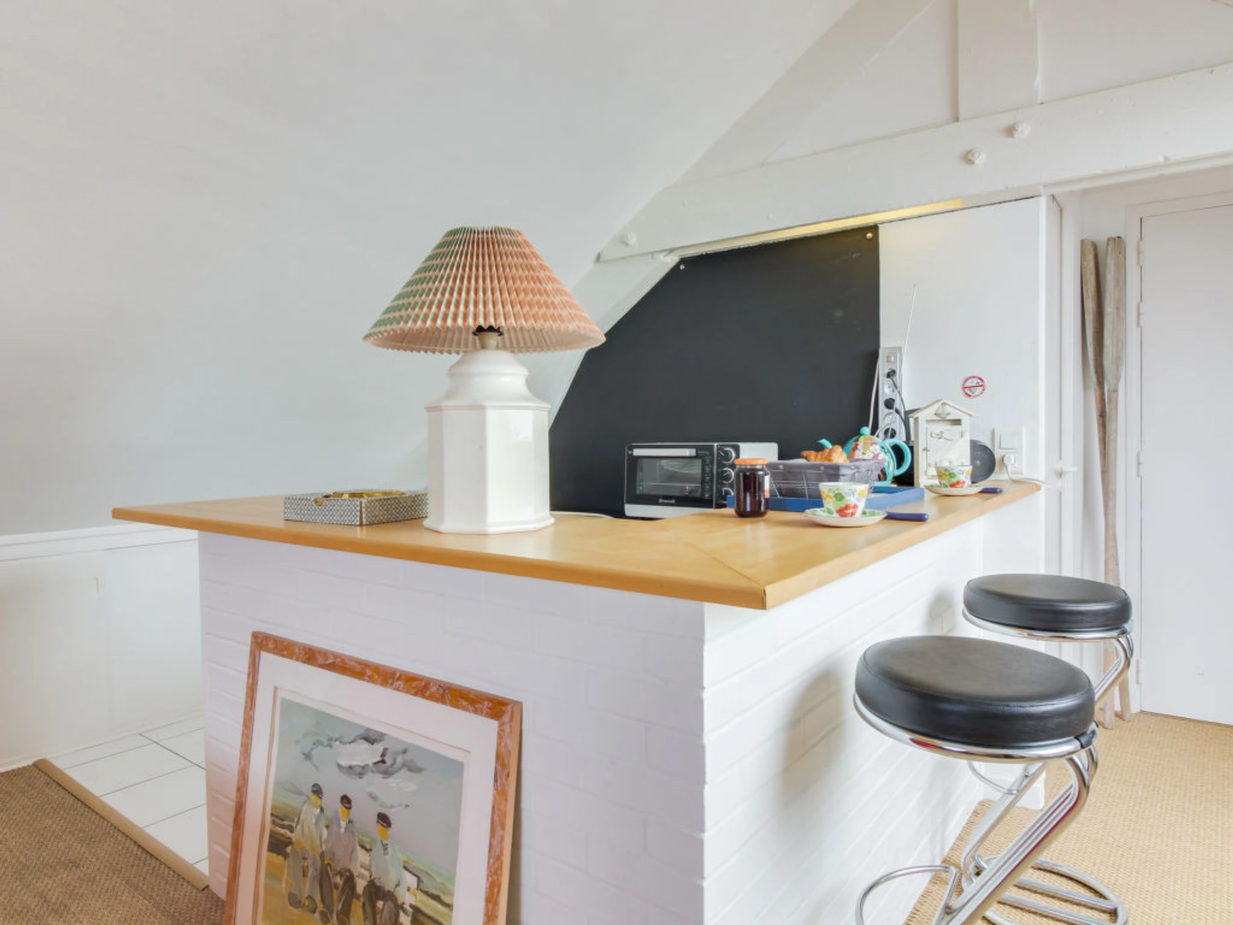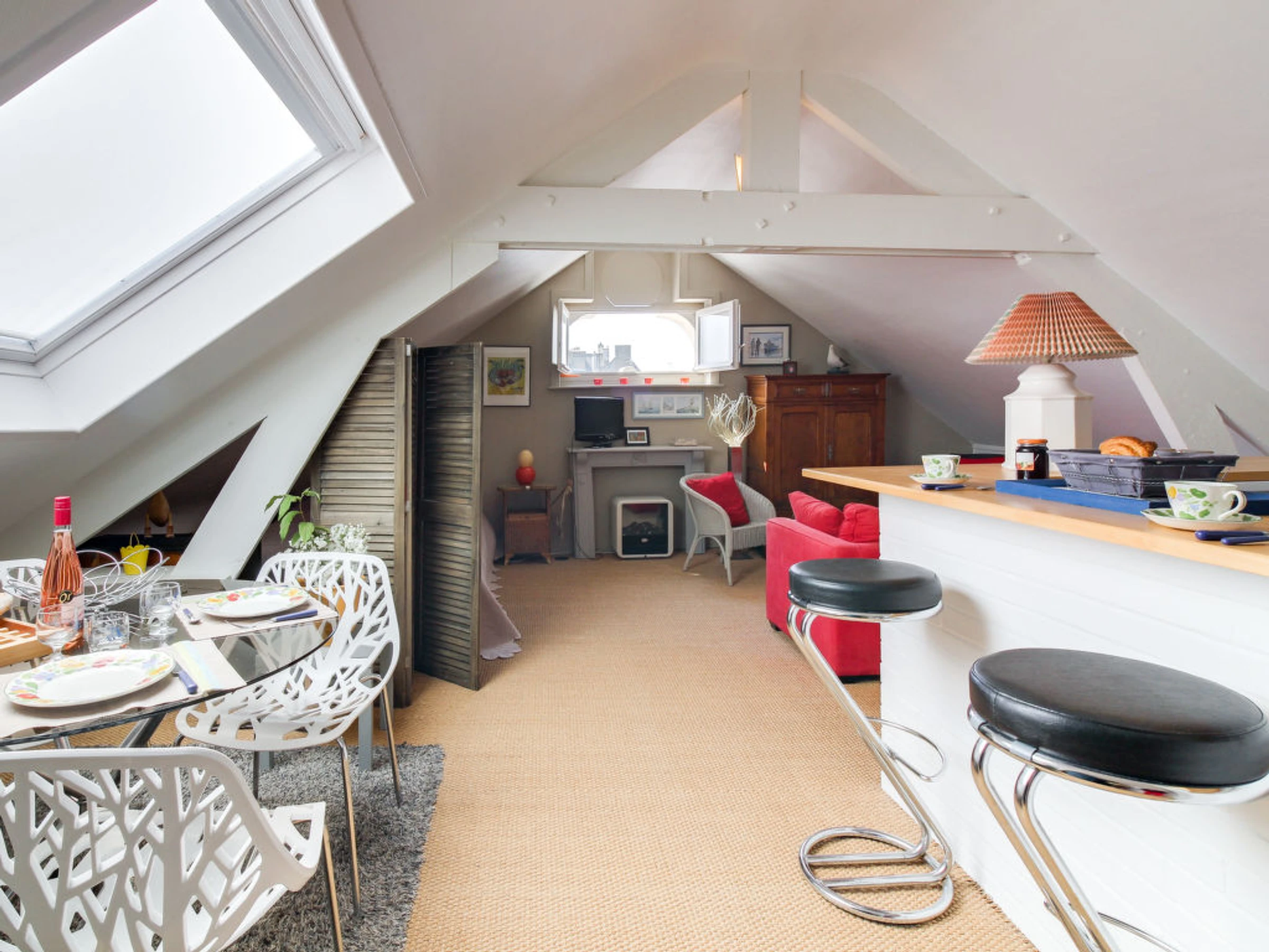 1-room studio 23 m2 on 3rd floor. With sloping ceilings, beautiful and romantic furnishings: living/dining room with 1 french bed (1 x 140 cm, length 190 cm), TV (flat screen). Kitchenette (mini-oven, dishwasher, 4 ceramic glass hob hotplates, microwave, electric coffee machine). Shower/WC. Facilities: washing machine. Internet (WiFi, free). Please note: non-smokers only. Smoke alarm.