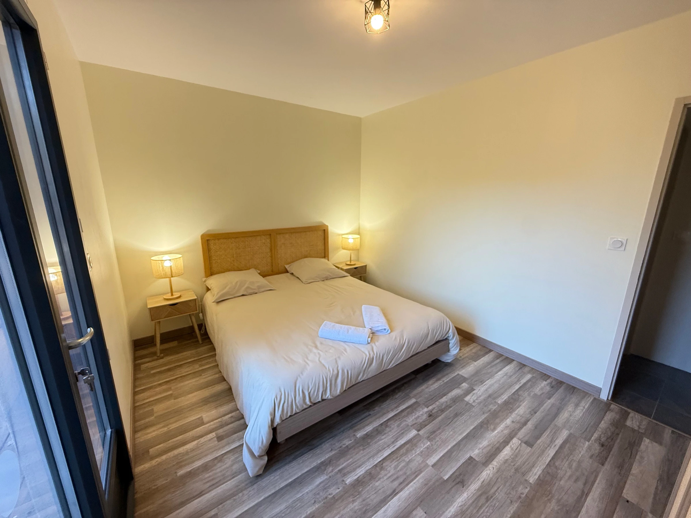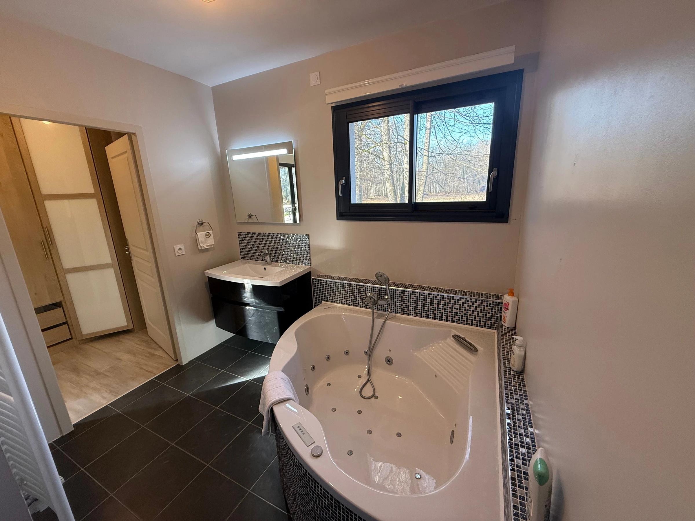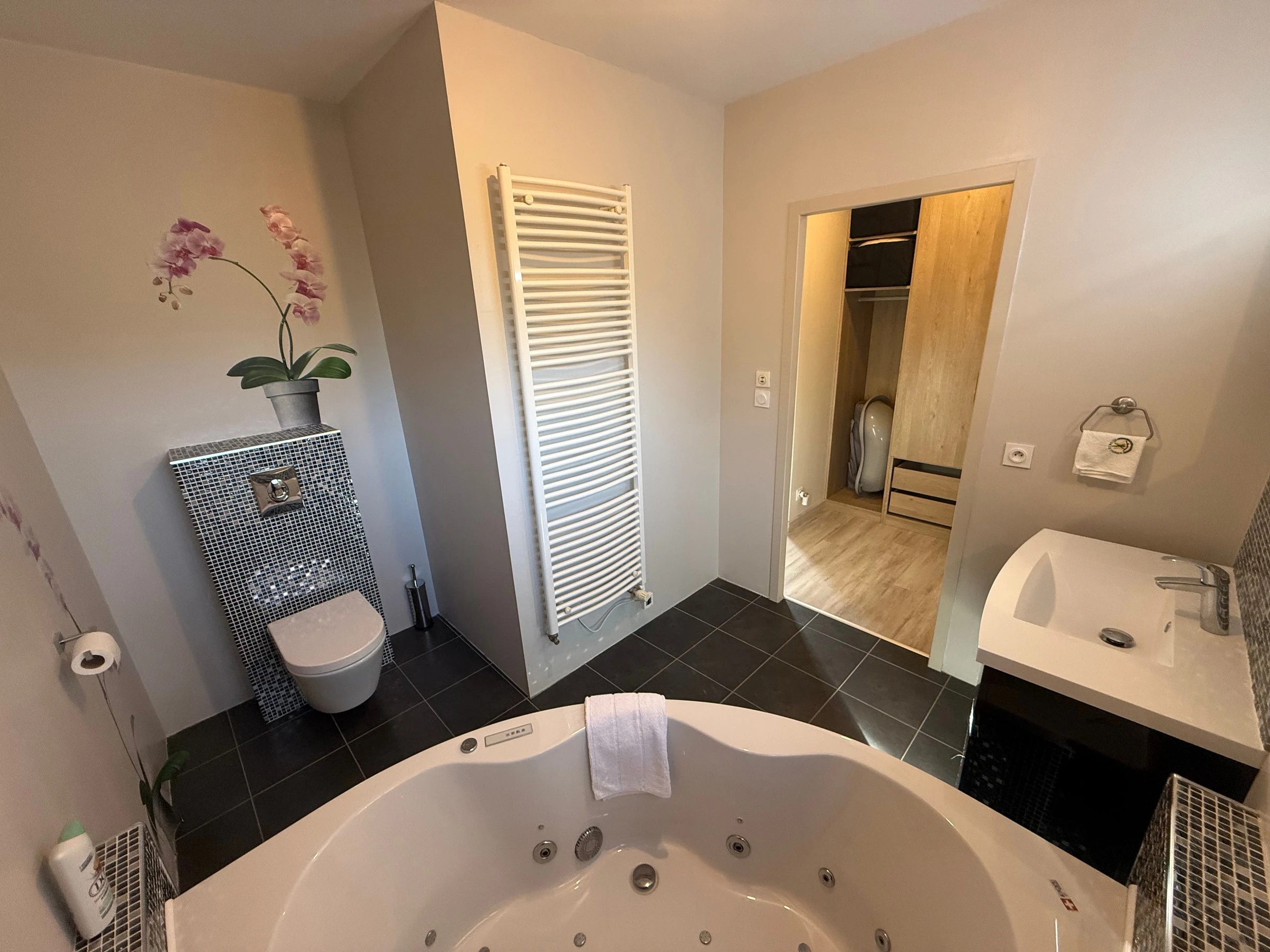 - Bedroom 1: Master suite with a 160x190 cm double bed, a dressing room, and an en-suite bathroom (jetted bathtub), WC