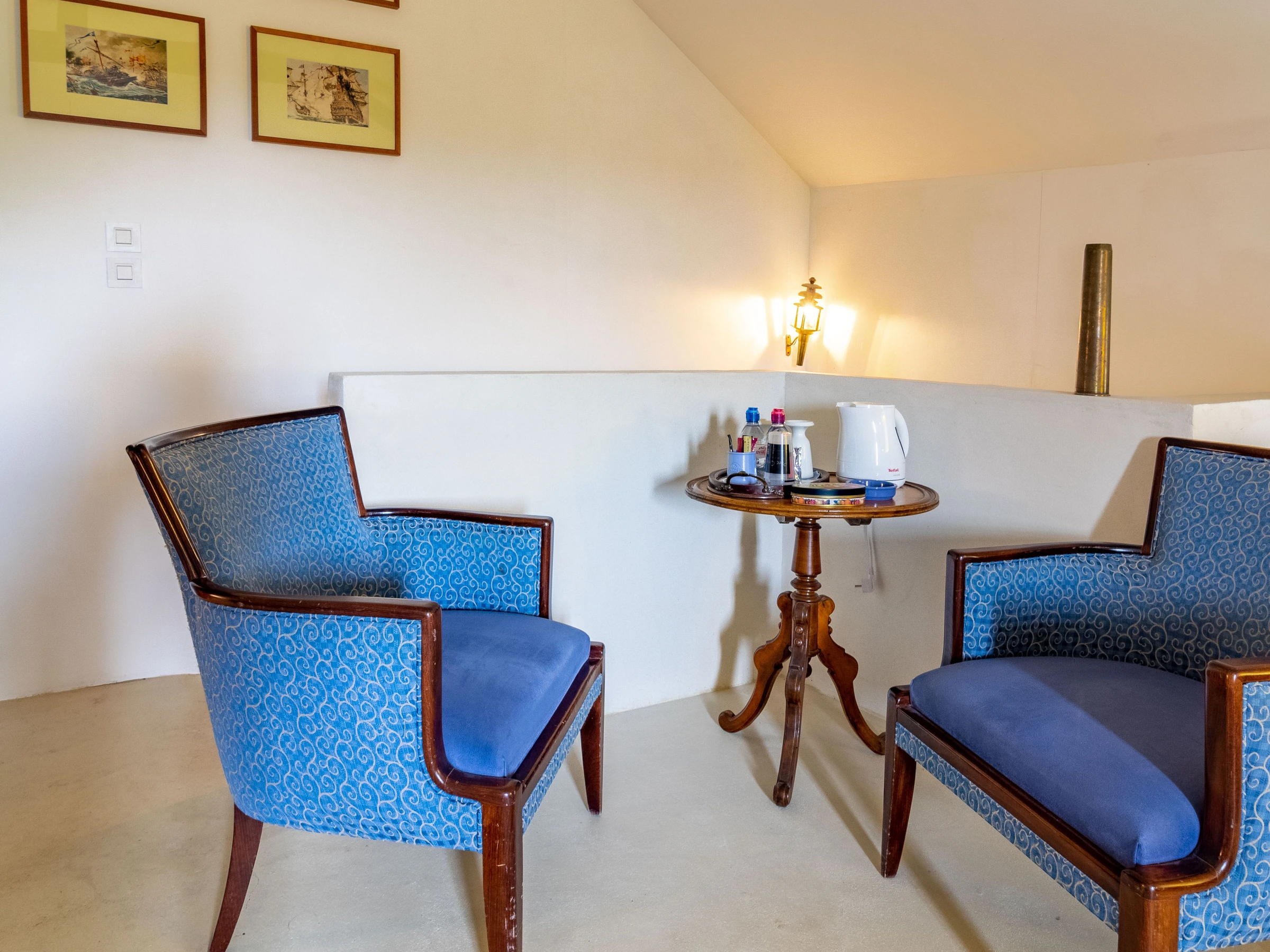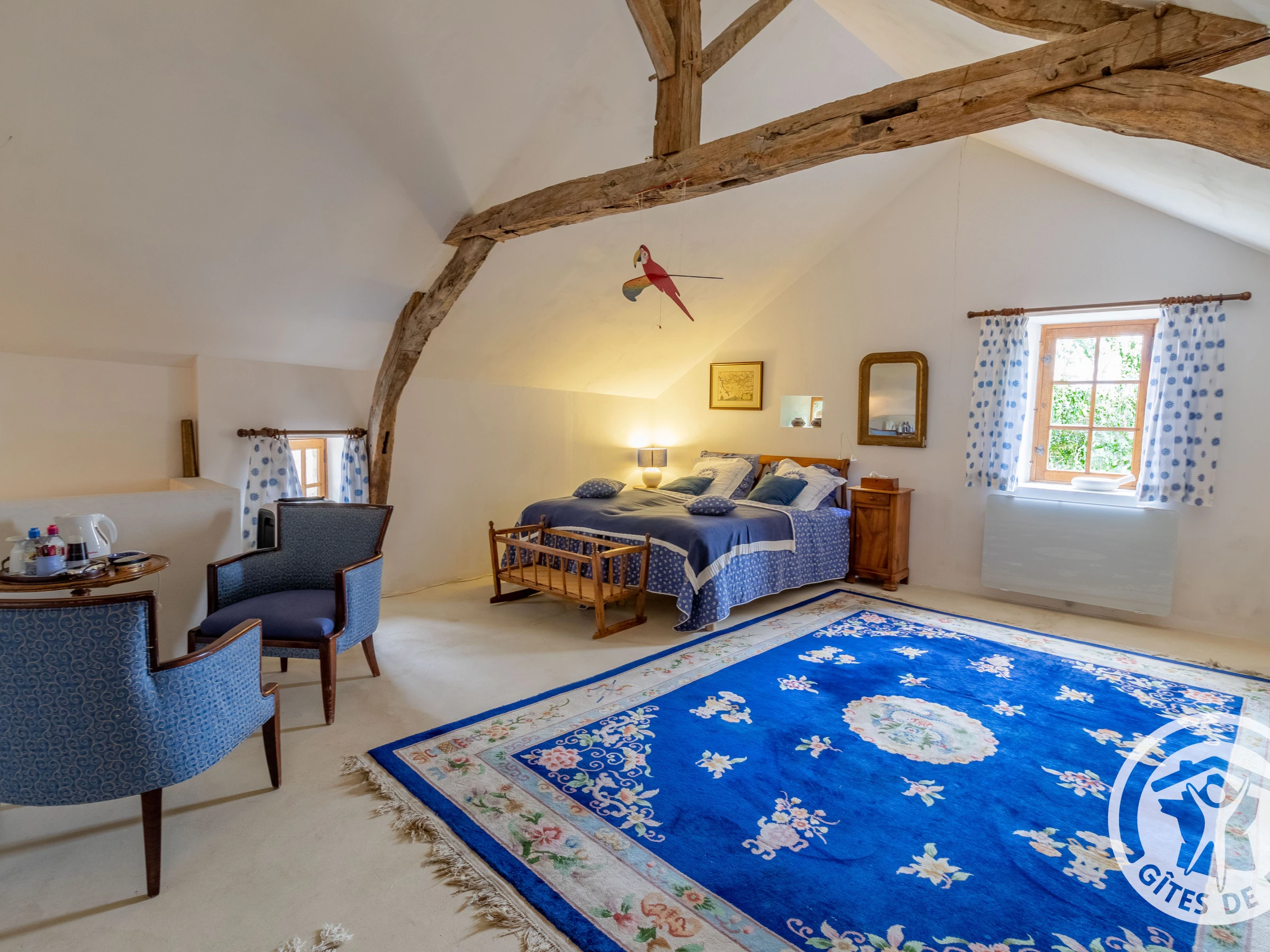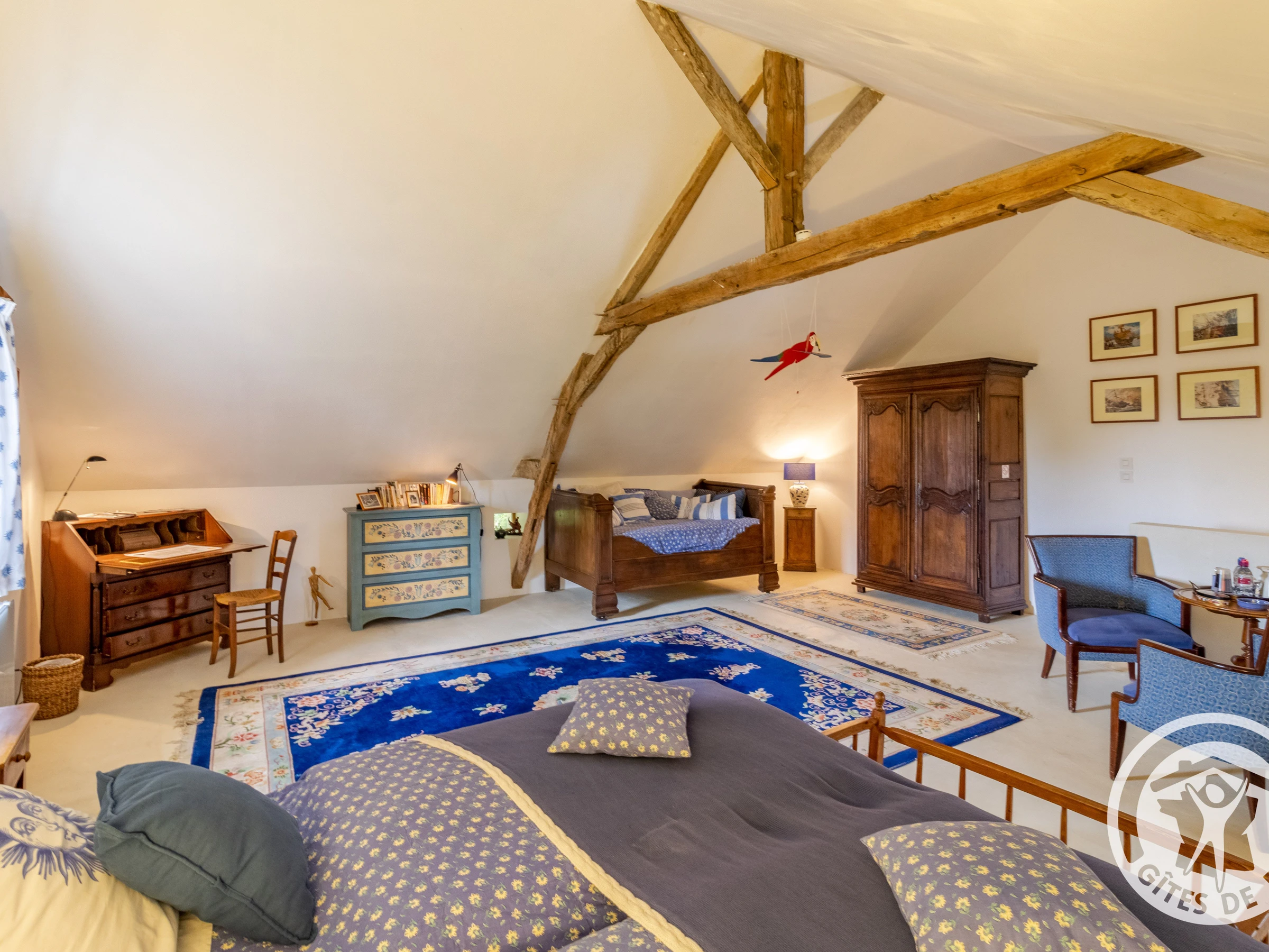The bedroom has its own private entrance with a separate toilet and bathroom with a bathtub and vanity unit. You will go upstairs via a stone staircase to access the 33 m² bedroom. New bedding consisting of two 90 x 200 cm beds, a small lounge area with a courtesy tray, a table, a large bench, and storage. All surrounded by white walls and wooden beams.