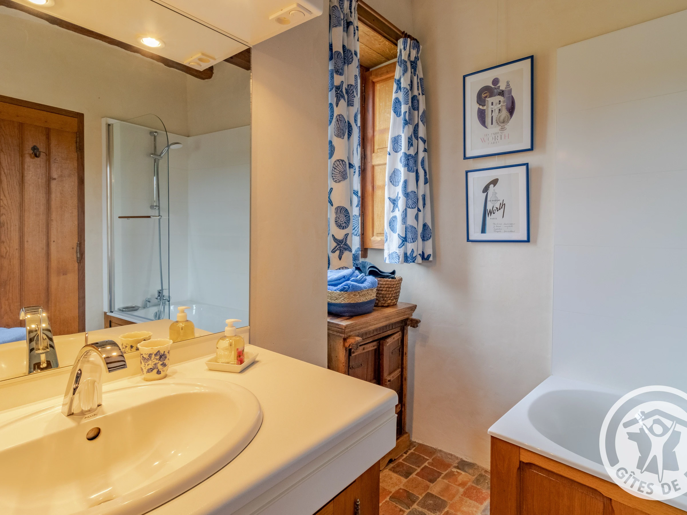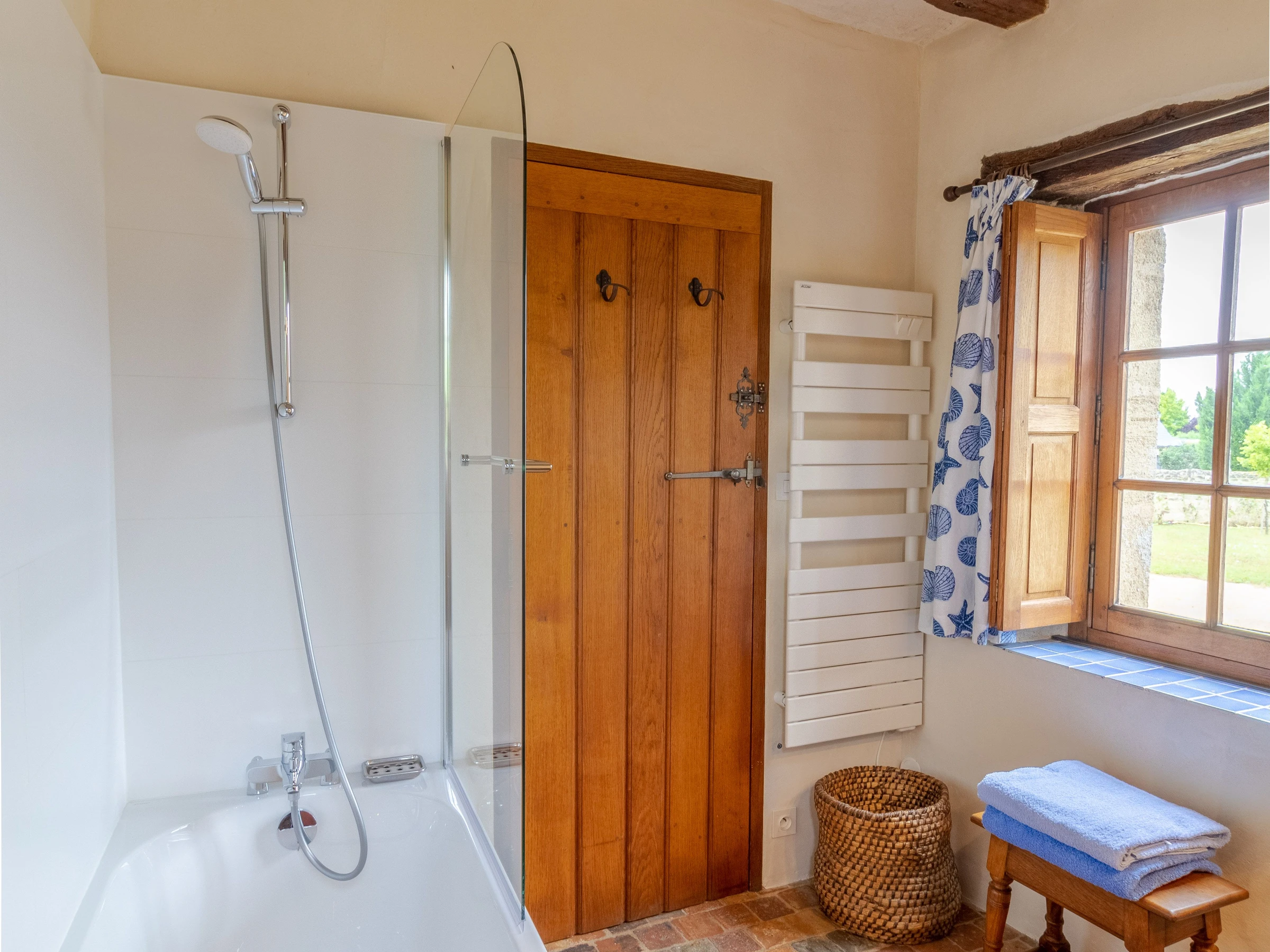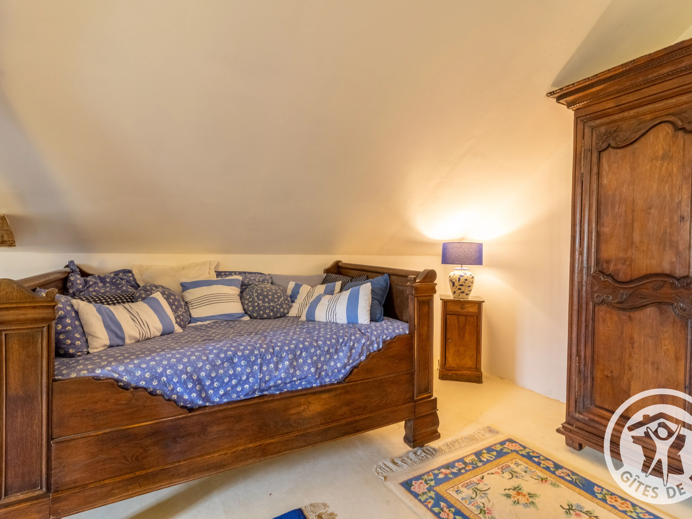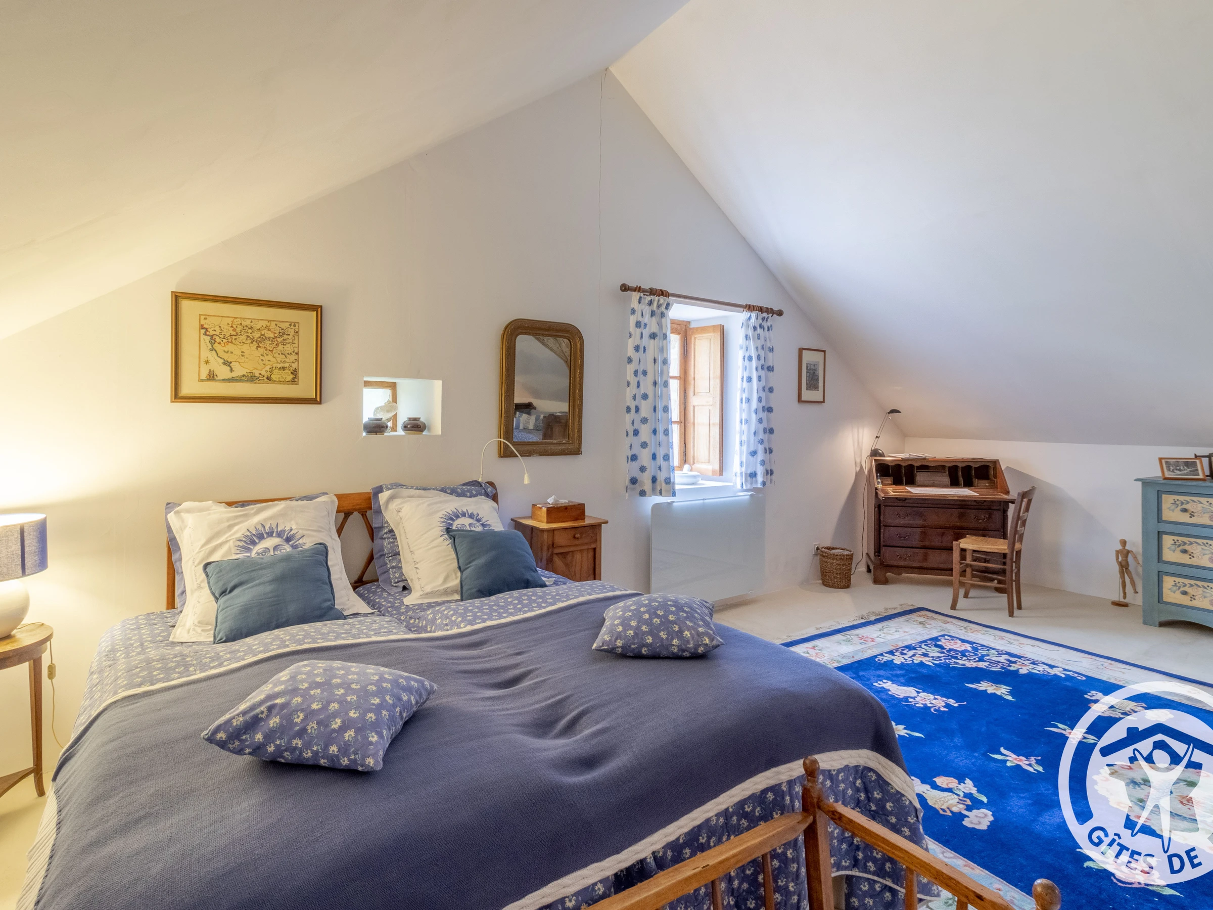 The bedroom has its own private entrance with a separate toilet and bathroom with a bathtub and vanity unit. You will go upstairs via a stone staircase to access the 33 m² bedroom. New bedding consisting of two 90 x 200 cm beds, a small lounge area with a courtesy tray, a table, a large bench, and storage. All surrounded by white walls and wooden beams.