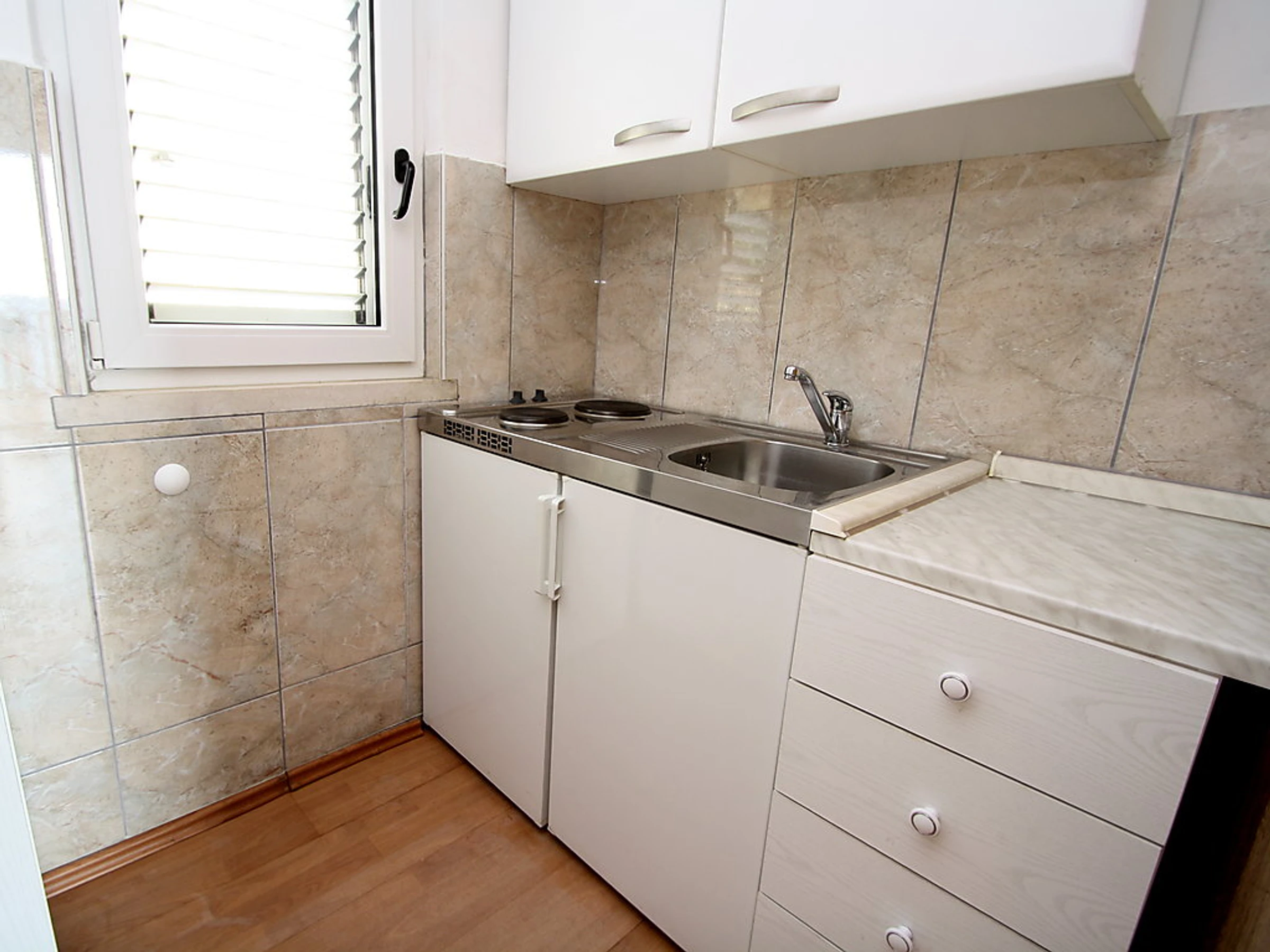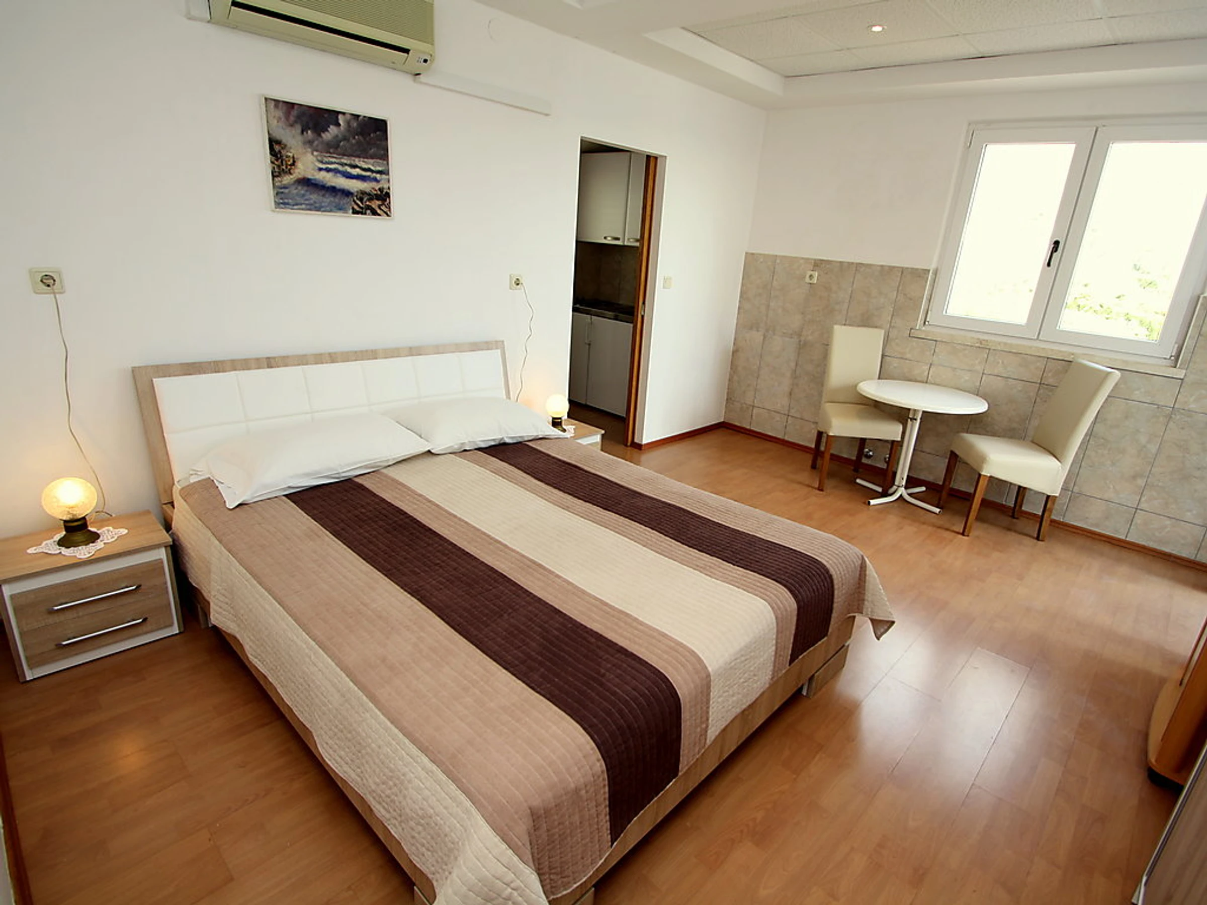1-room apartment 30 m2 on 2nd floor, south-east facing position. 1 room with 1 french bed (160 cm, length 190 cm), satellite TV and air conditioning. Exit to the terrace. Kitchen (2 hot plates, microwave). Bath/WC. Terrace 7 m2. Terrace furniture. Very beautiful view of the sea and the swimming pool. Included: Air-conditioning, Weekly laundry (bed linen and towels), Final cleaning, Local tax