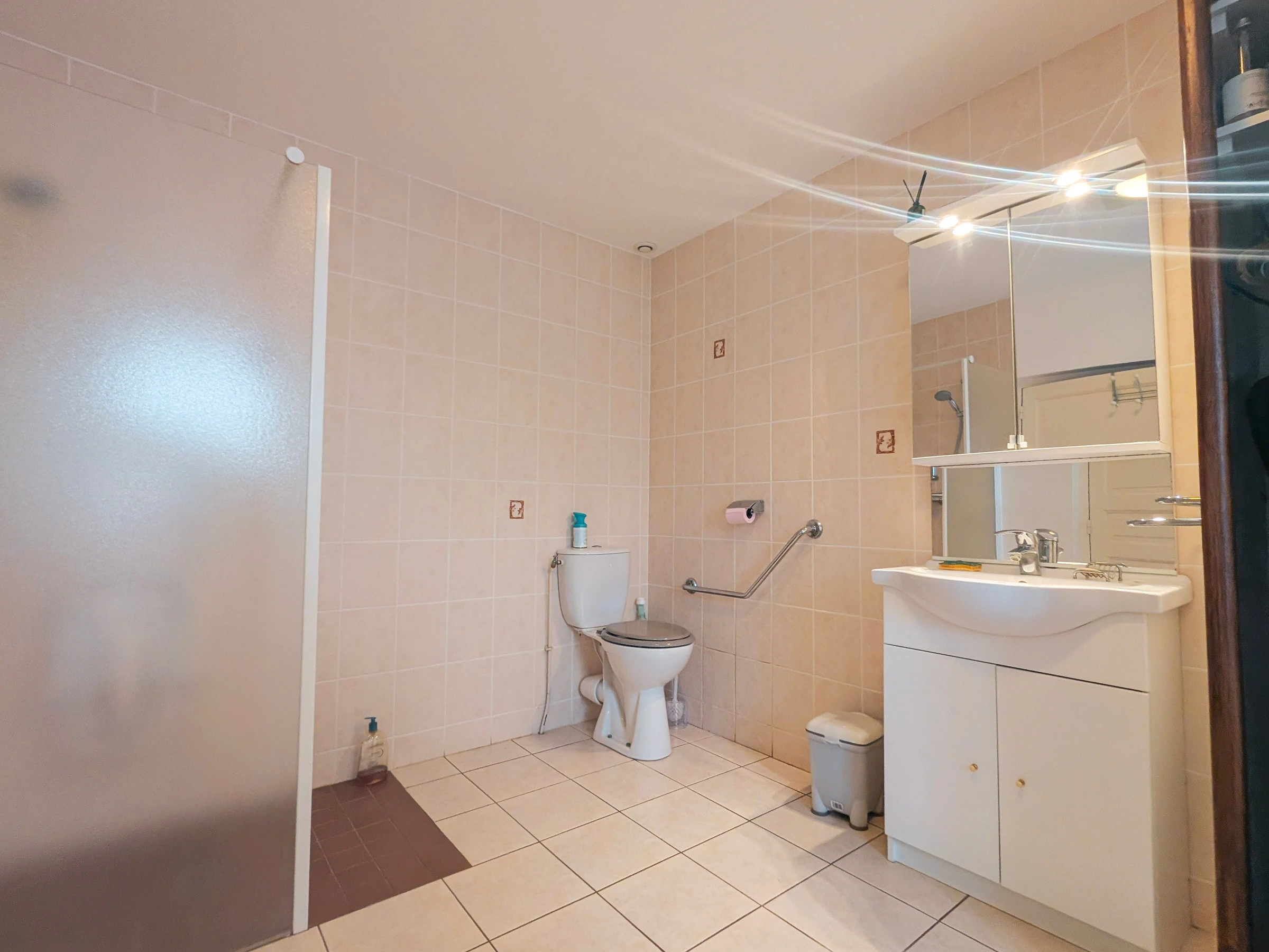 Two bathrooms: the first, off the living room, with a walk-in shower, toilet, and changing table; the second with a standard shower. The layout allows for almost private access to a bathroom from each bedroom.