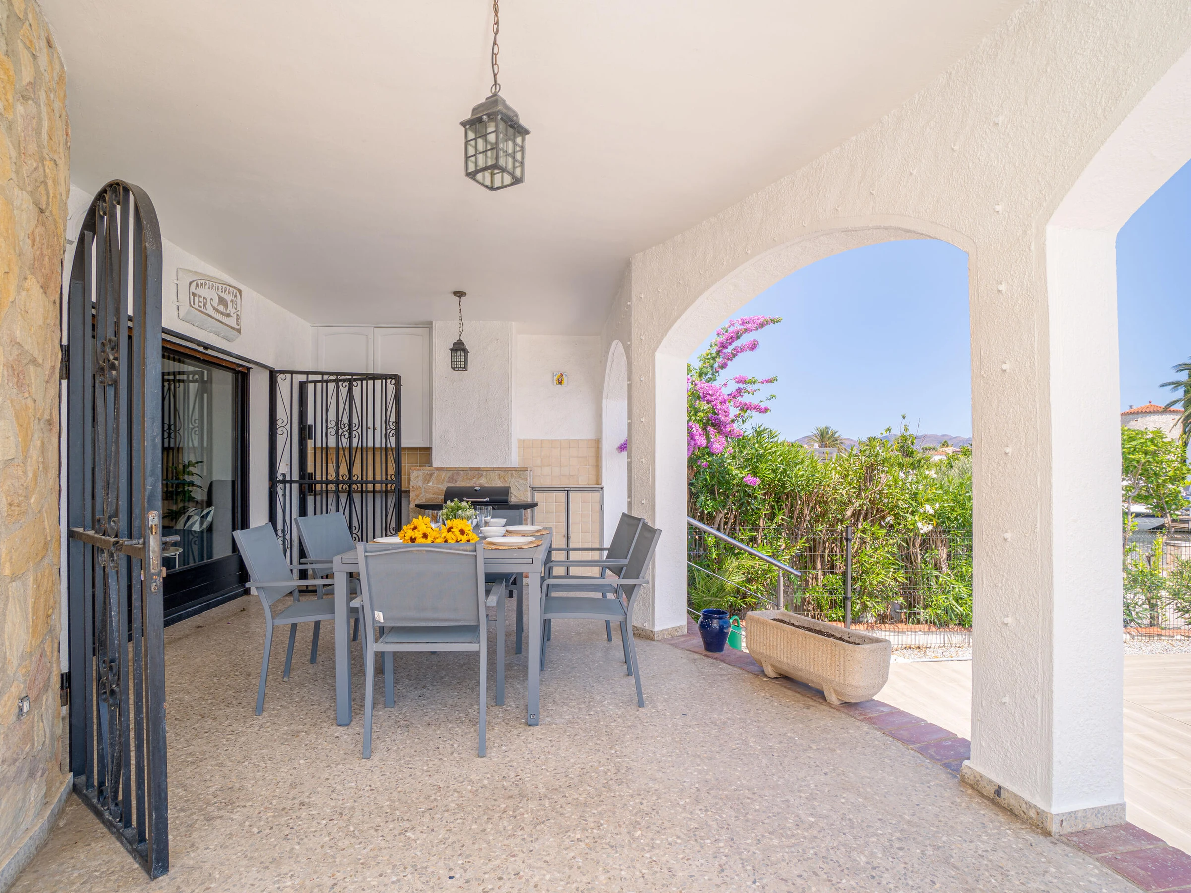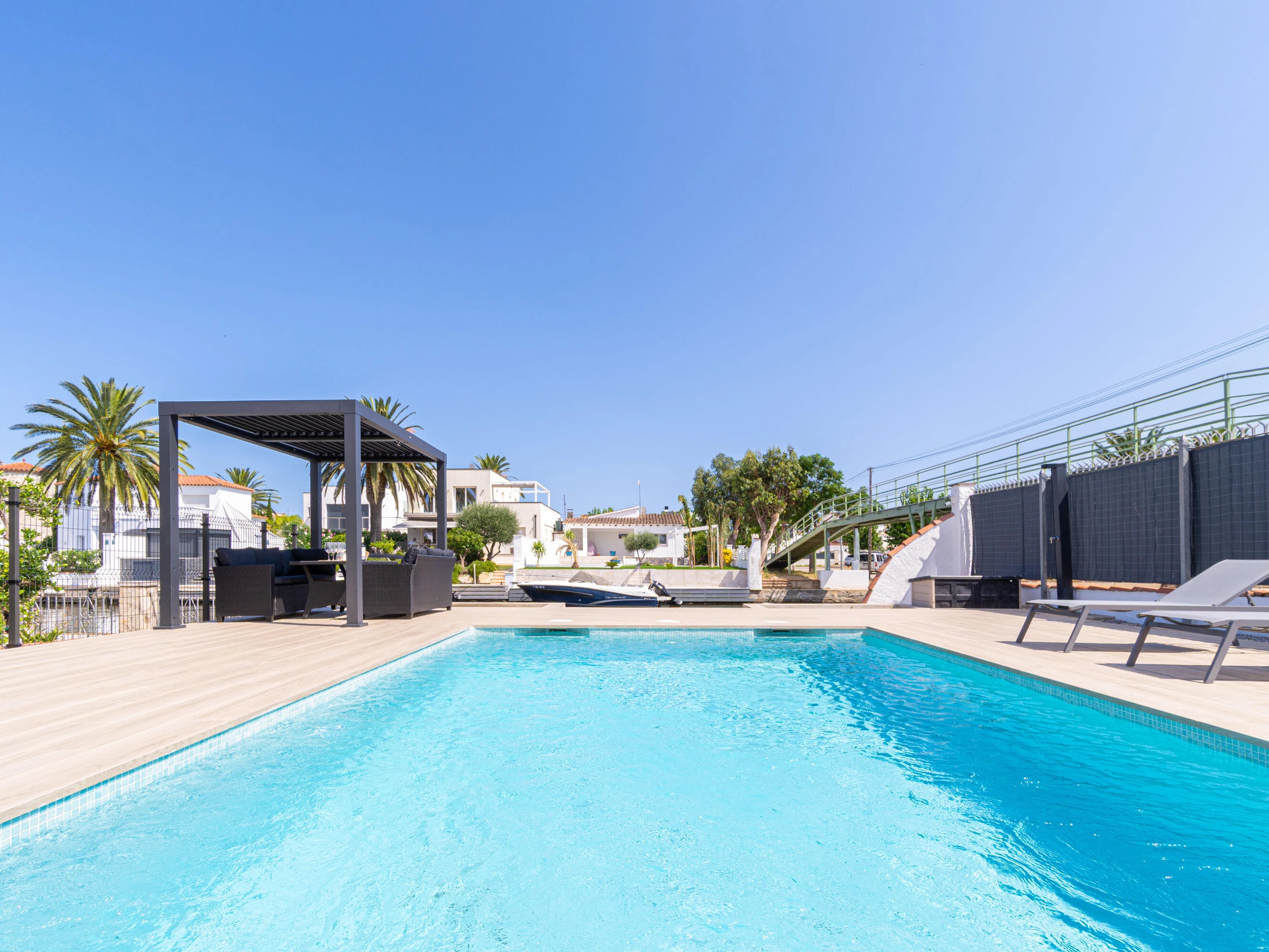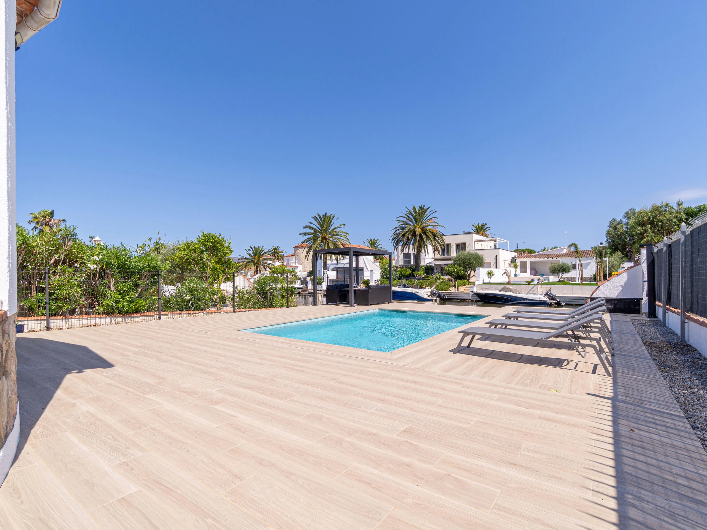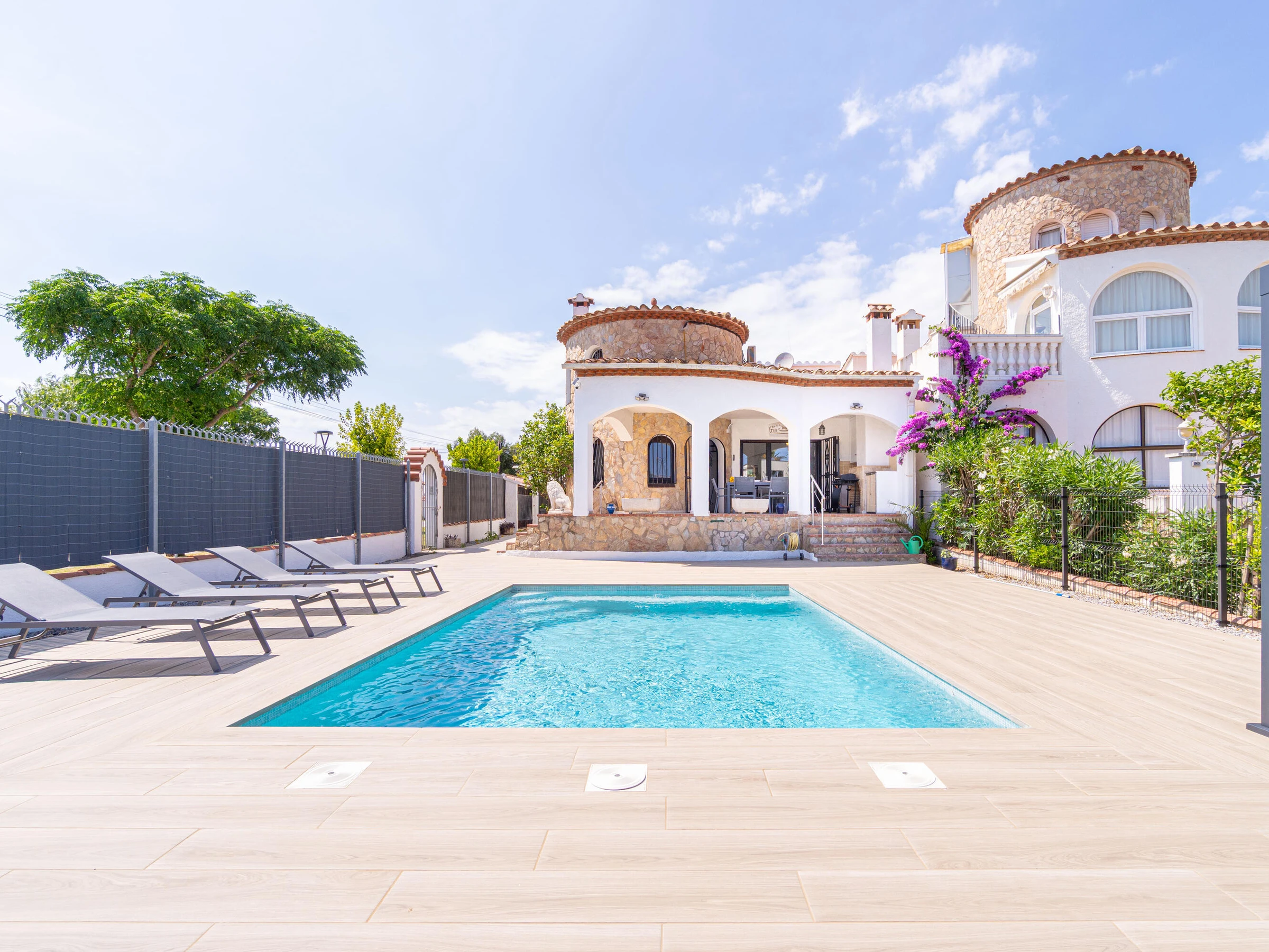This beautiful rental house in the quiet Ter sector of Empuriabrava offers everything you need for a comfortable stay. Upon entering, you’ll find a spacious living room with plenty of natural light, leading to a lovely raised, covered terrace. The living room features an open-plan kitchen equipped with an oven, microwave, dishwasher, gas stove, kettle, and toaster. There is also a smart TV in the living room for added convenience. The house has four bedrooms, three with double beds (150 x 200 cm) and one with two single beds (90 x 190 cm). All bedrooms are air-conditioned, as is the rest of the house, and there is fiber optic internet for fast connectivity. The largest bedroom is located in an idyllic tower of the house and has an en-suite bathroom with a shower. The second bathroom is located on the ground floor and also features a shower. The garden is spacious and fully enclosed, offering privacy. In front of the house, there is a large driveway where two cars can easily be parked. The backyard is situated by the water of Empuriabrava and features a 12.5-meter mooring, perfect for boat enthusiasts. The laundry room is located on the side of the house. This house offers not only comfort but also an ideal location to enjoy! Energy Consumption: G 348 Emissions: F 70