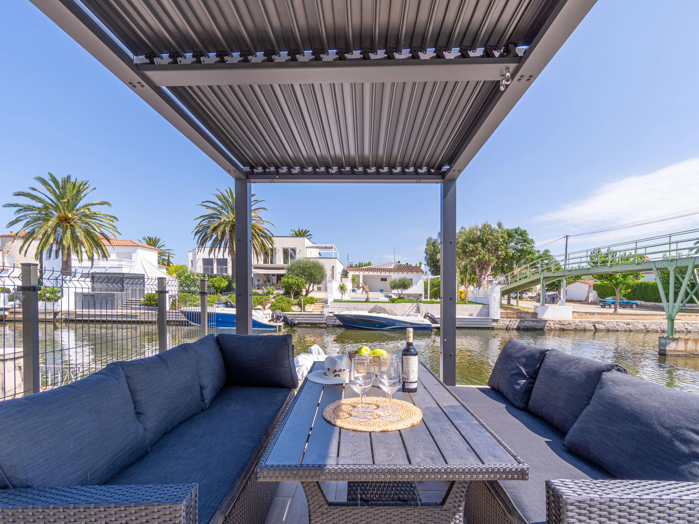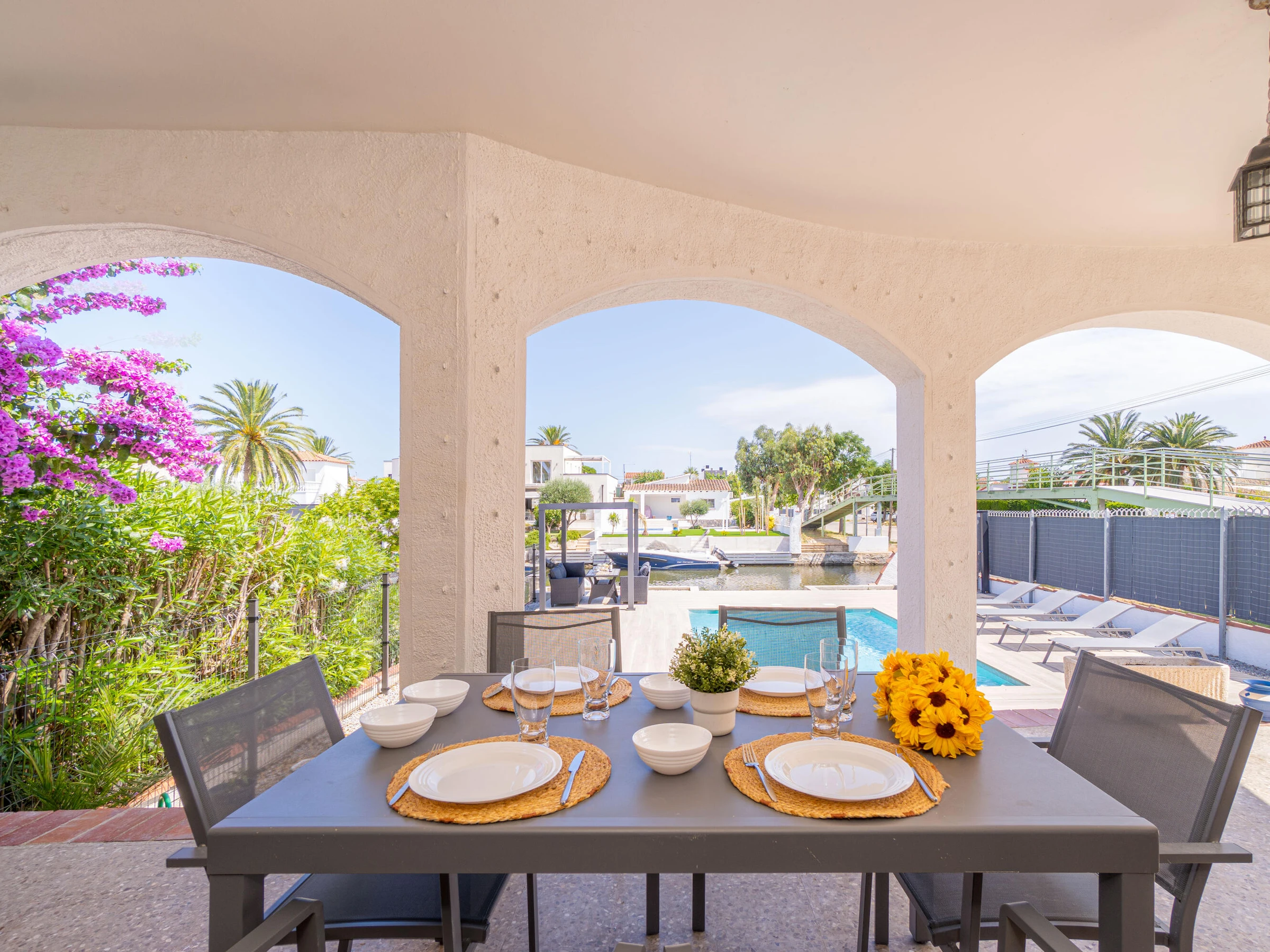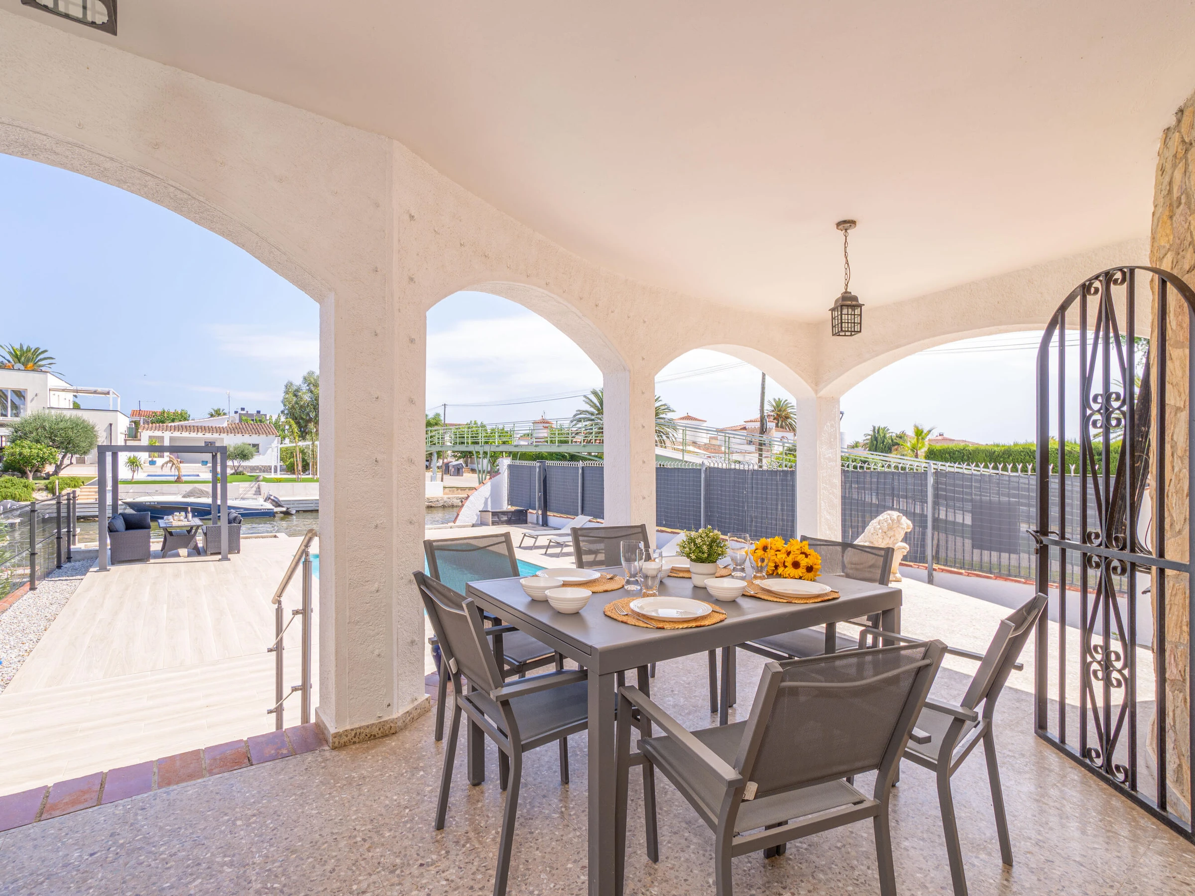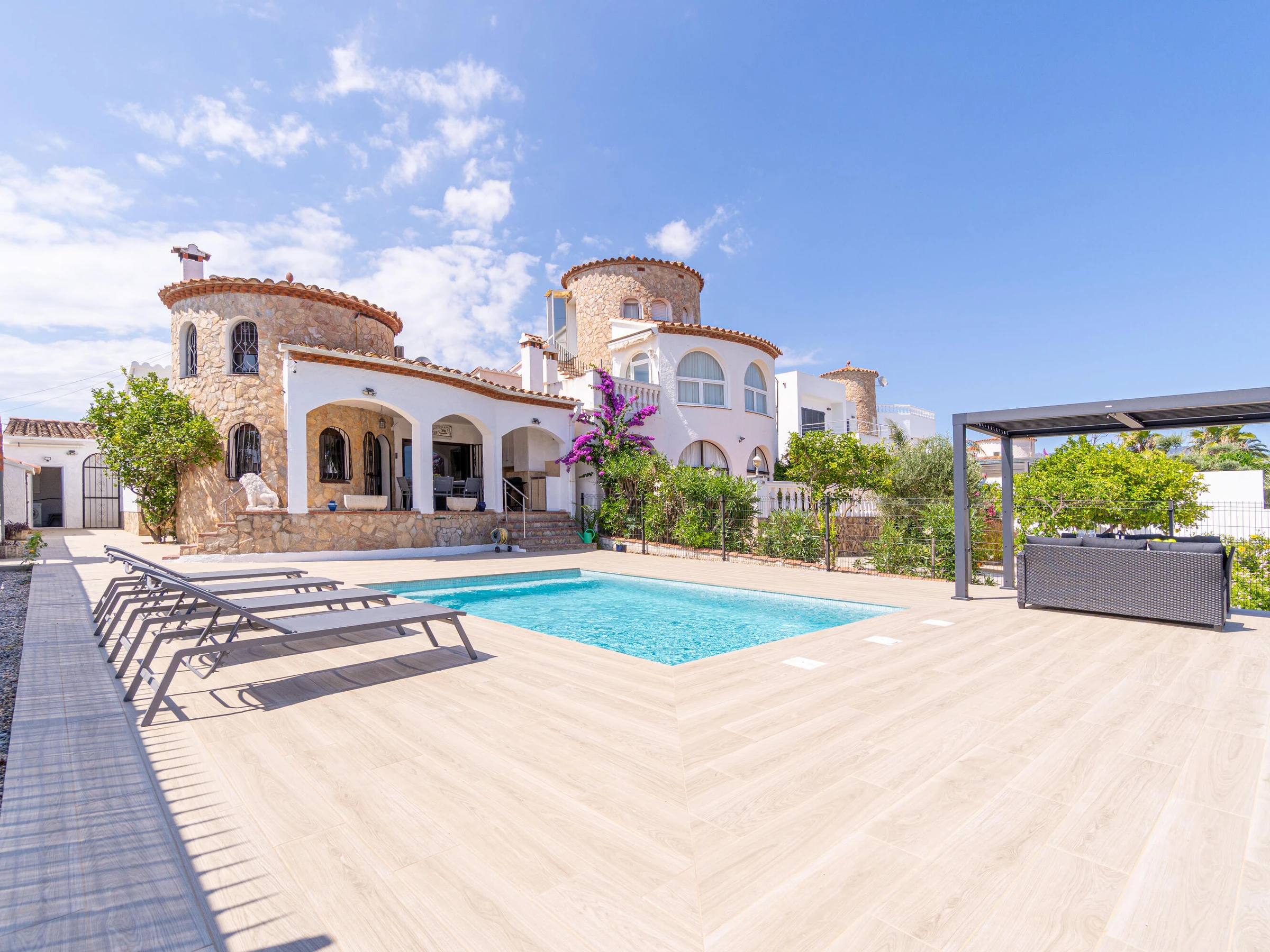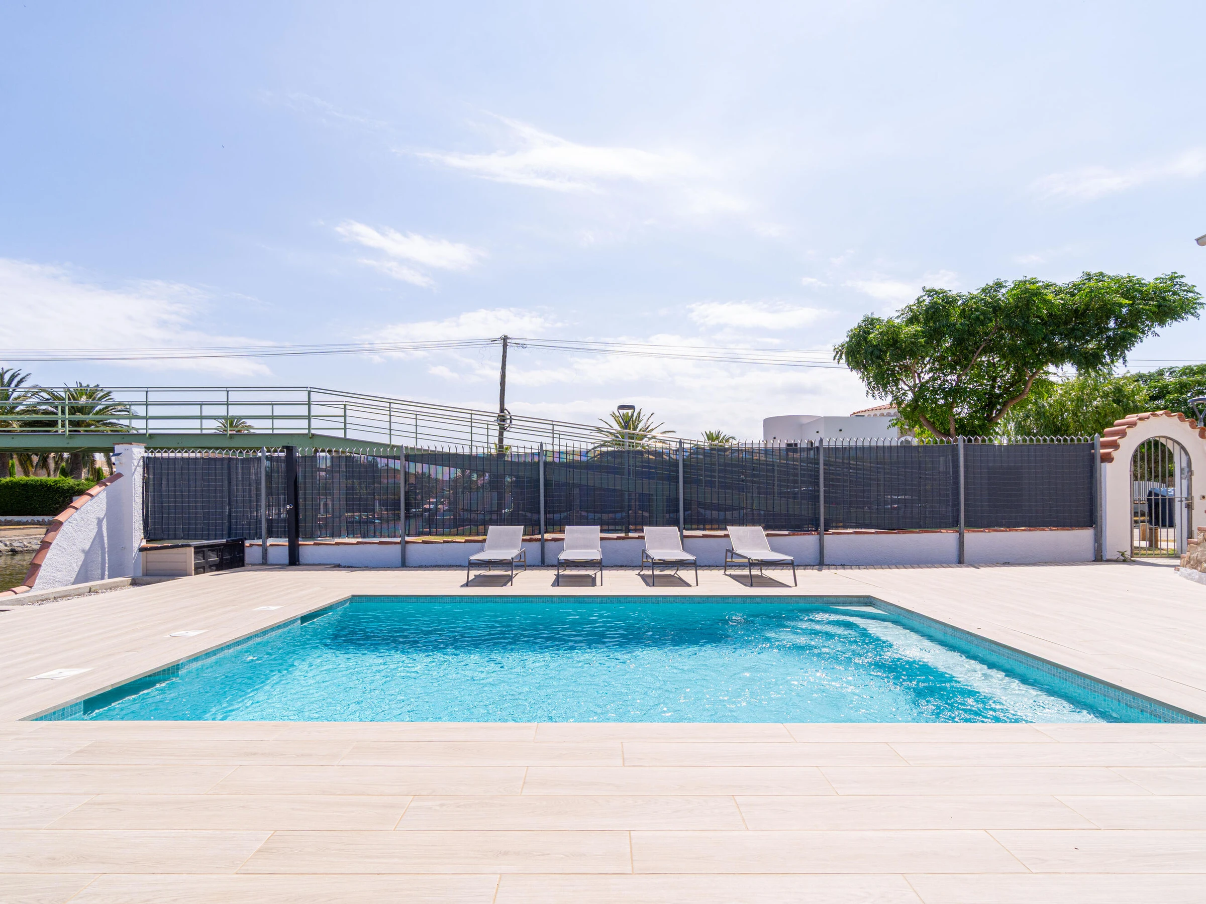This beautiful rental house in the quiet Ter sector of Empuriabrava offers everything you need for a comfortable stay. Upon entering, you’ll find a spacious living room with plenty of natural light, leading to a lovely raised, covered terrace. The living room features an open-plan kitchen equipped with an oven, microwave, dishwasher, gas stove, kettle, and toaster. There is also a smart TV in the living room for added convenience. The house has four bedrooms, three with double beds (150 x 200 cm) and one with two single beds (90 x 190 cm). All bedrooms are air-conditioned, as is the rest of the house, and there is fiber optic internet for fast connectivity. The largest bedroom is located in an idyllic tower of the house and has an en-suite bathroom with a shower. The second bathroom is located on the ground floor and also features a shower. The garden is spacious and fully enclosed, offering privacy. In front of the house, there is a large driveway where two cars can easily be parked. The backyard is situated by the water of Empuriabrava and features a 12.5-meter mooring, perfect for boat enthusiasts. The laundry room is located on the side of the house. This house offers not only comfort but also an ideal location to enjoy! Energy Consumption: G 348 Emissions: F 70