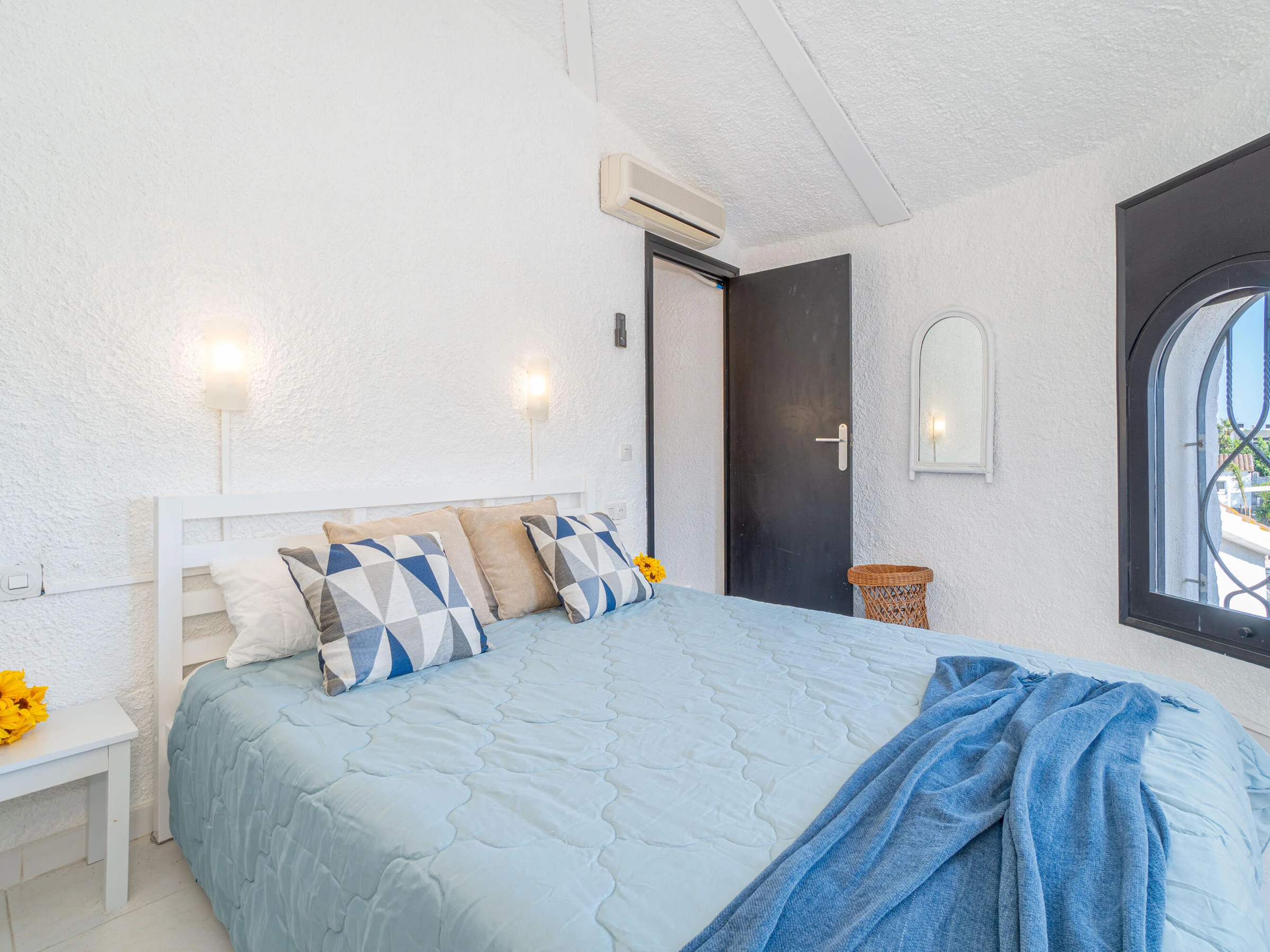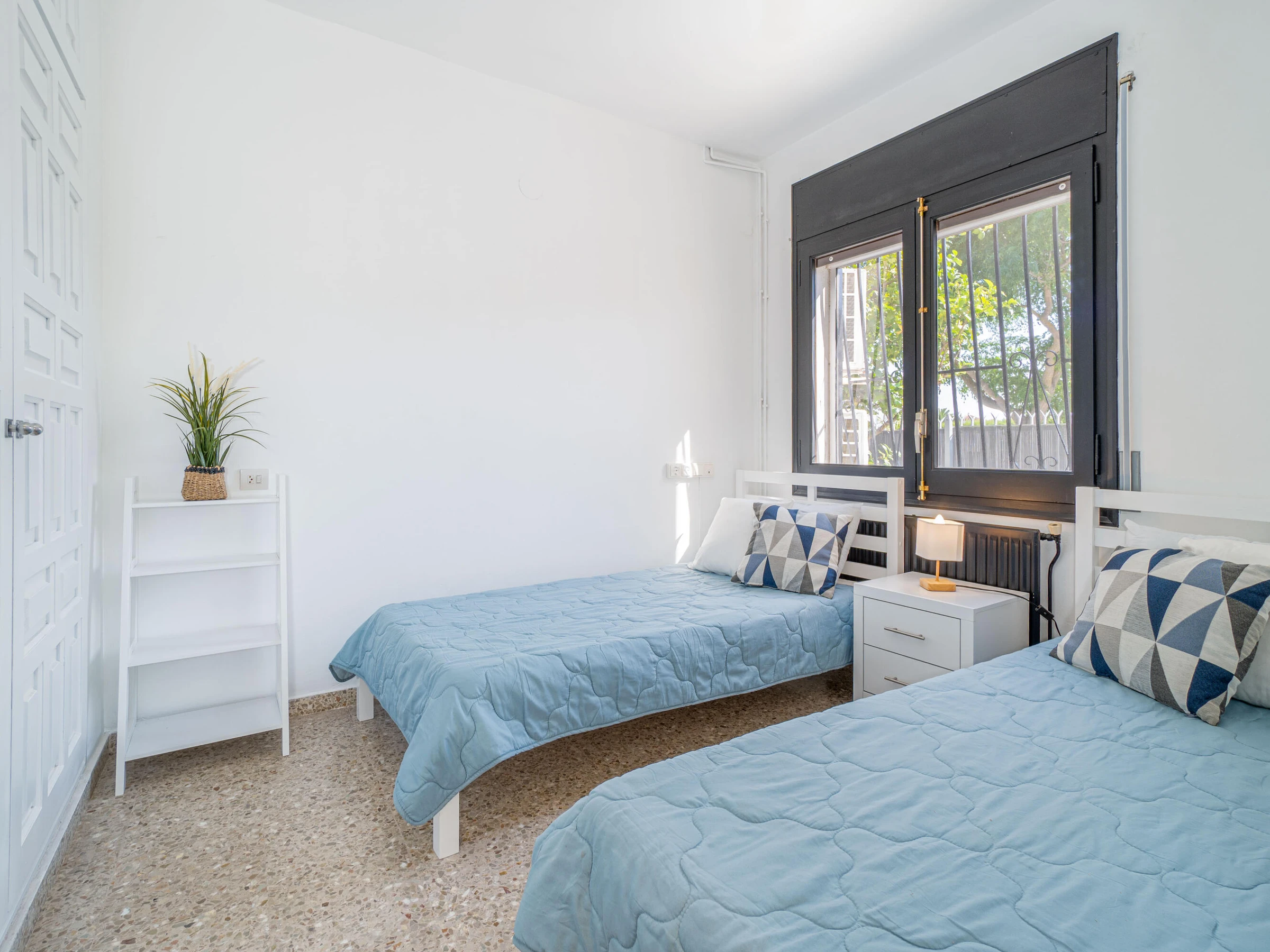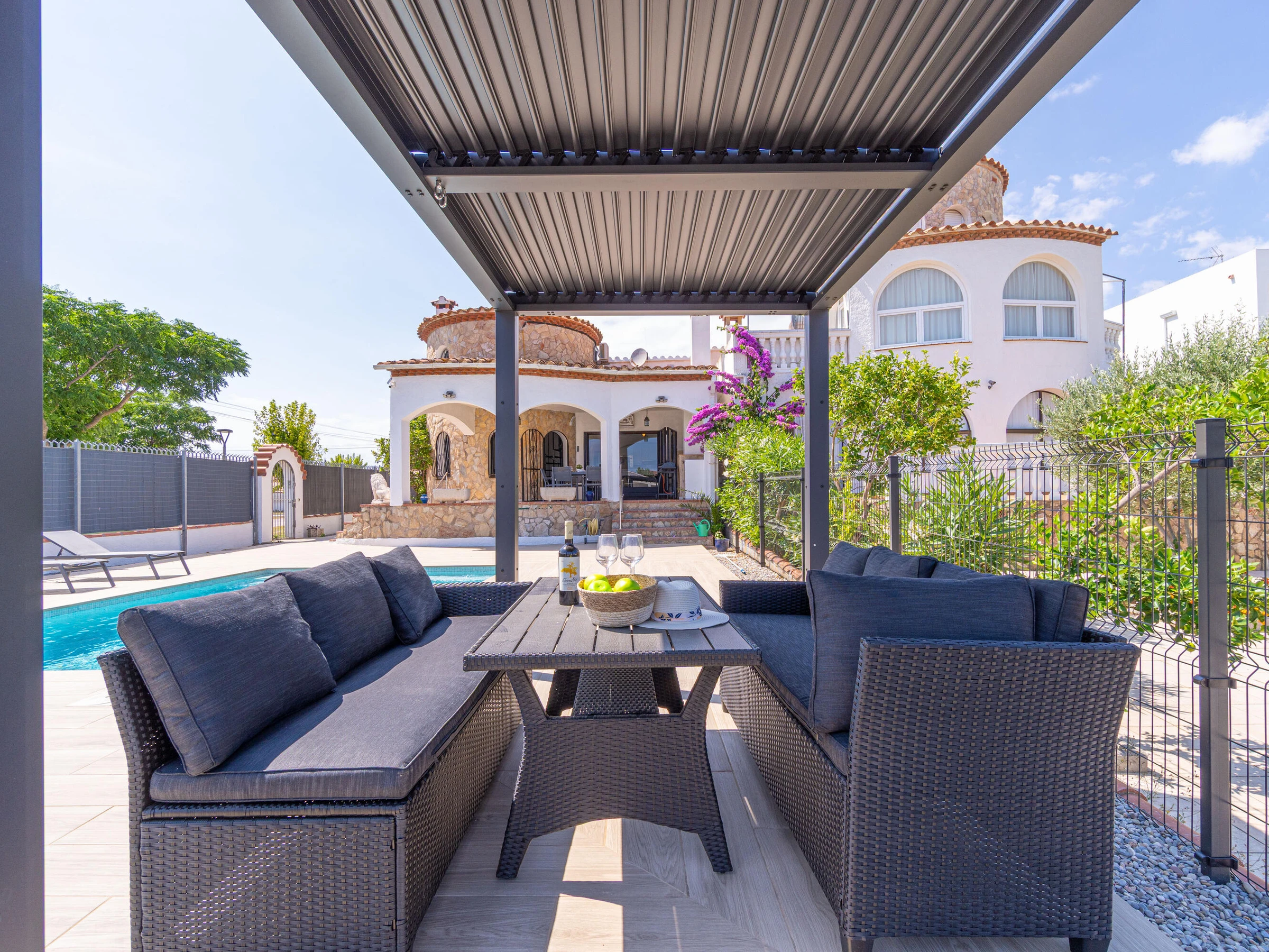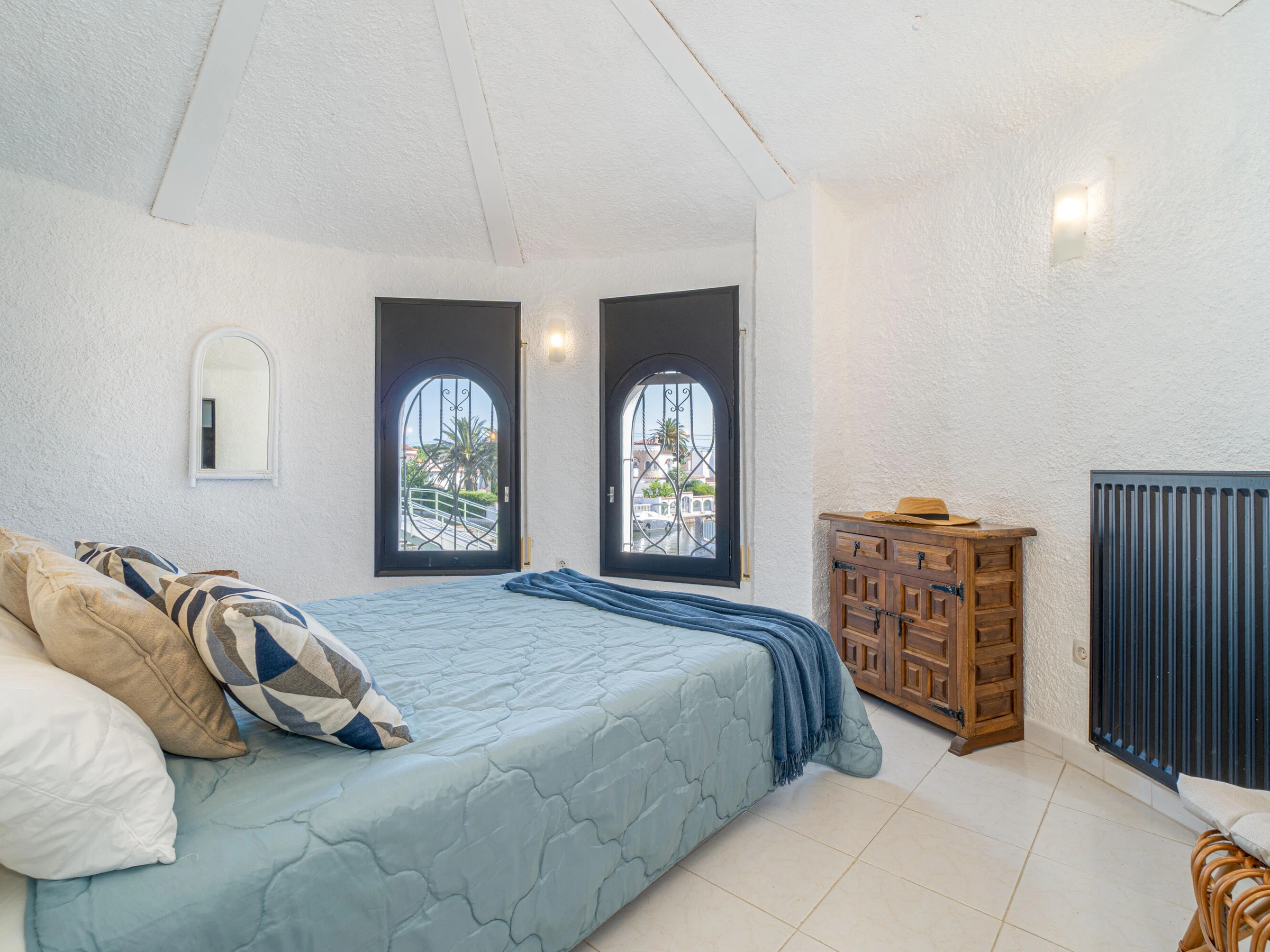 This beautiful rental house in the quiet Ter sector of Empuriabrava offers everything you need for a comfortable stay. Upon entering, you’ll find a spacious living room with plenty of natural light, leading to a lovely raised, covered terrace. The living room features an open-plan kitchen equipped with an oven, microwave, dishwasher, gas stove, kettle, and toaster. There is also a smart TV in the living room for added convenience. The house has four bedrooms, three with double beds (150 x 200 cm) and one with two single beds (90 x 190 cm). All bedrooms are air-conditioned, as is the rest of the house, and there is fiber optic internet for fast connectivity. The largest bedroom is located in an idyllic tower of the house and has an en-suite bathroom with a shower. The second bathroom is located on the ground floor and also features a shower. The garden is spacious and fully enclosed, offering privacy. In front of the house, there is a large driveway where two cars can easily be parked. The backyard is situated by the water of Empuriabrava and features a 12.5-meter mooring, perfect for boat enthusiasts. The laundry room is located on the side of the house. This house offers not only comfort but also an ideal location to enjoy! Energy Consumption: G 348 Emissions: F 70