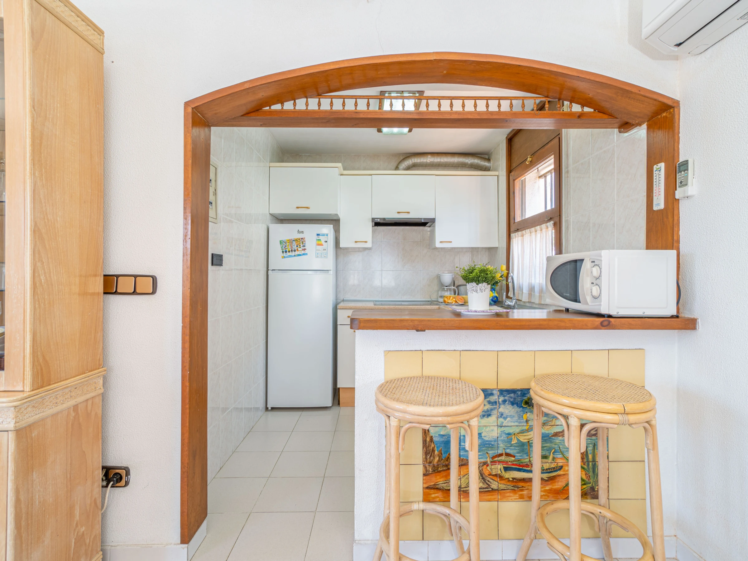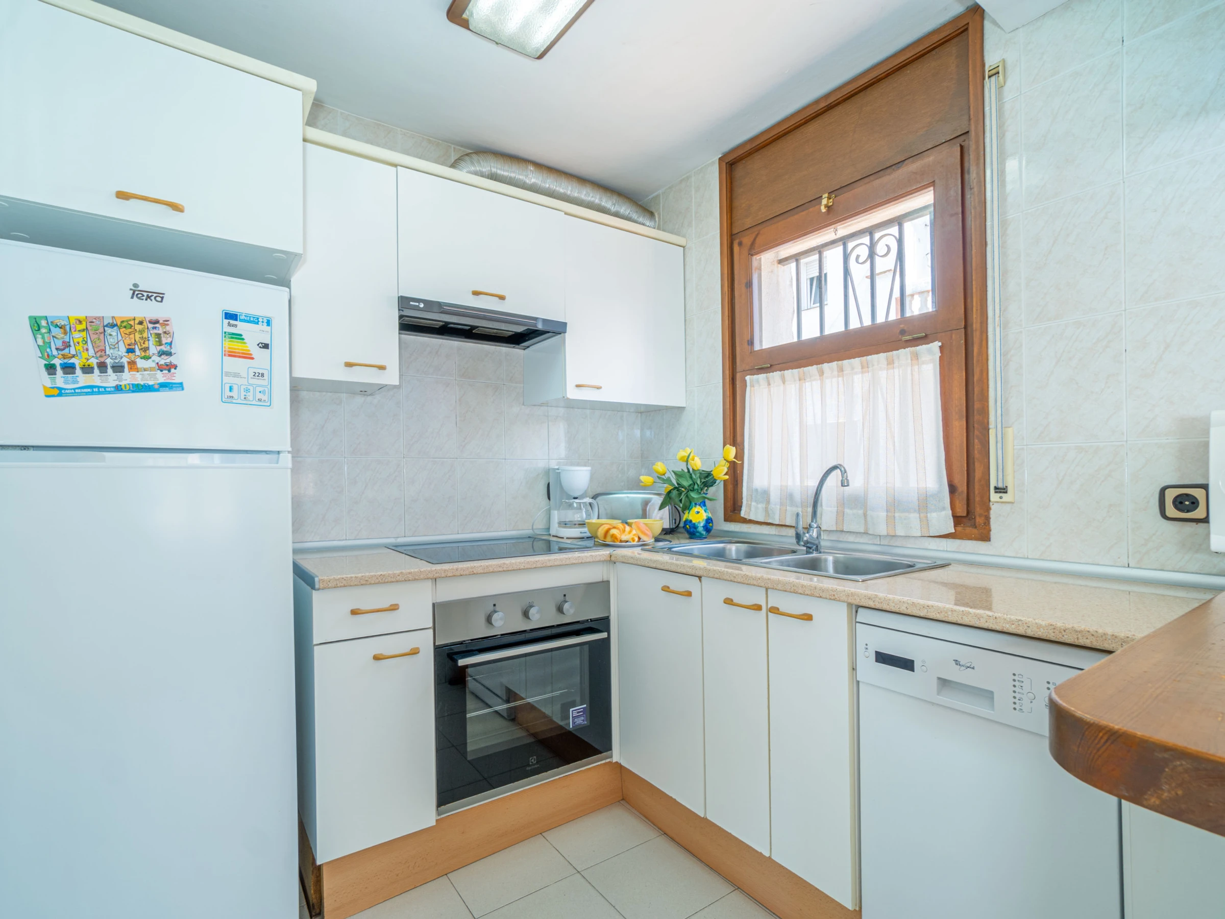 The open-plan ceramic hob kitchen is equipped with refrigerator, microwave, oven, washing machine, dishwasher, dishes/cutlery, kitchen utensils, coffee machine, toaster and kettle.