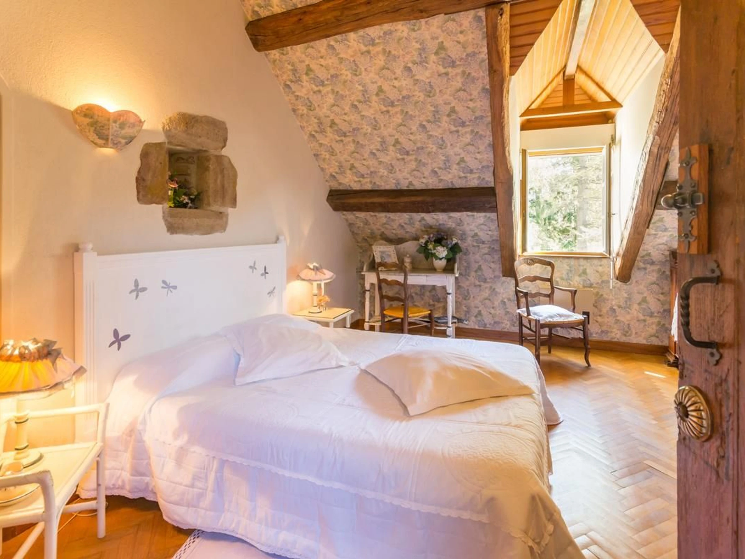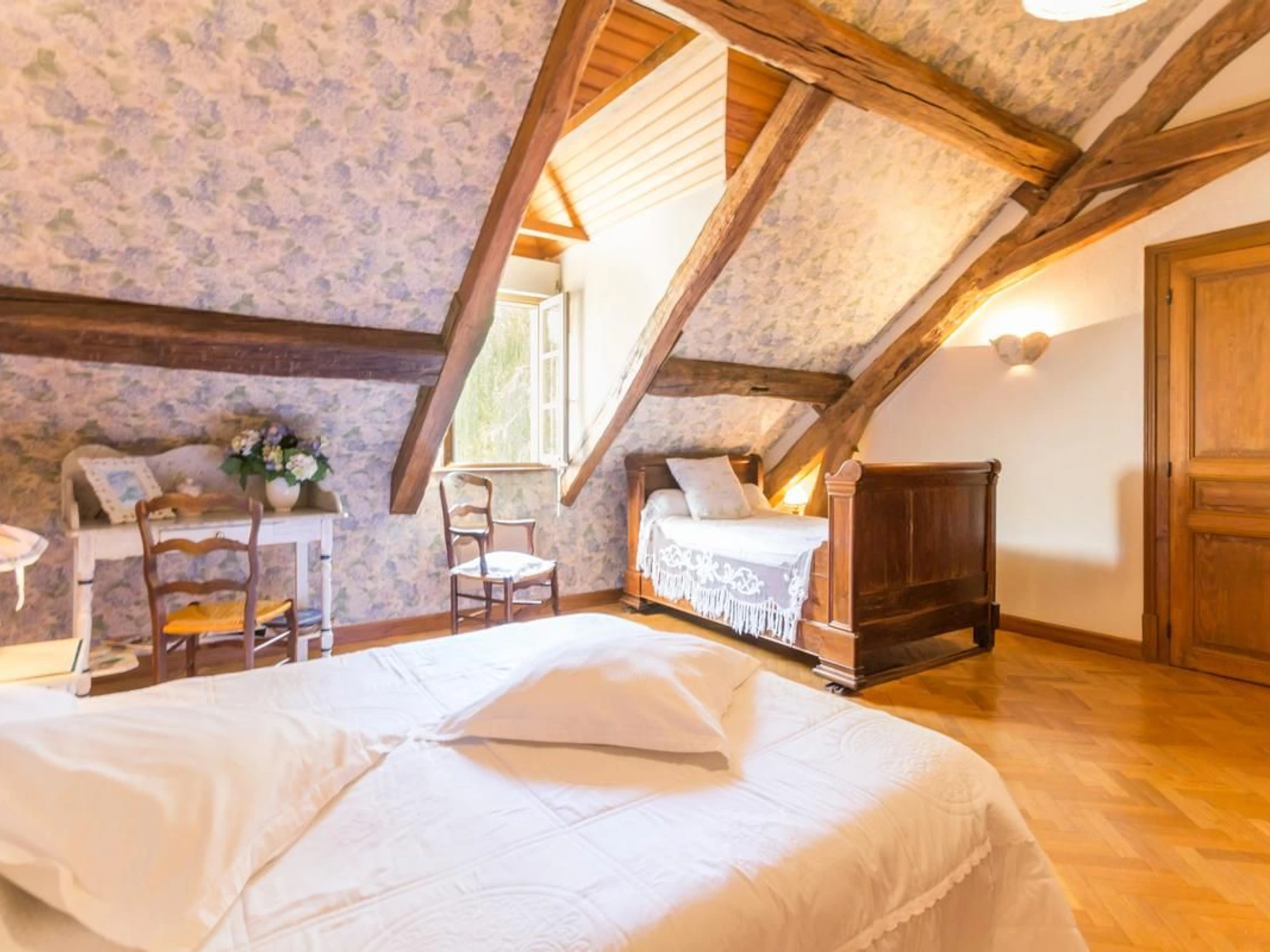 Epoisses, a designated "Town of Character," is well-known for its famous cheese. A kitchenette is available. The "Hortensias" room, accommodating 3 people, is located on the 2nd floor. It features a 160x200cm bed and a 120cm bed. Its bluish hues create a soothing and romantic atmosphere. It has a private en-suite shower room and a separate toilet. An extra bed (120x190cm) is available for €17.