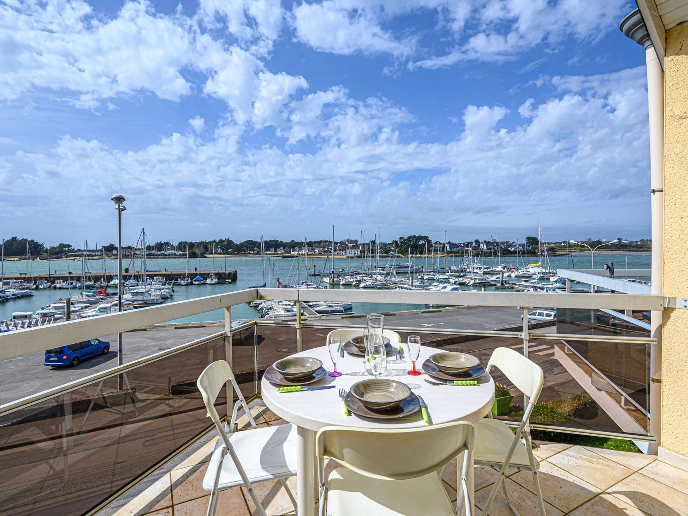 - Living room with dining area (table + chairs) and lounge area (sofa, TV) opening onto 7m² balcony facing South-West with marina view (garden furniture)