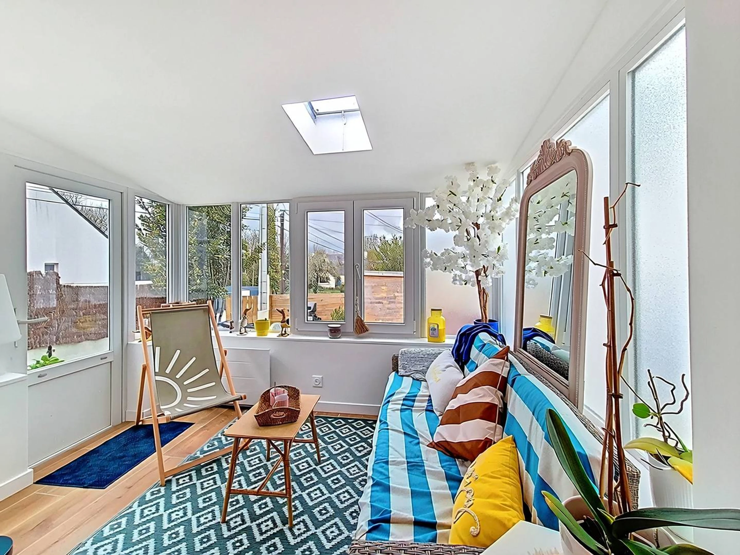 - Veranda open to the living room, arranged as a reading corner and giving access to the enclosed courtyard with north-facing terrace (garden furniture, barbecue, sun loungers, parasol)