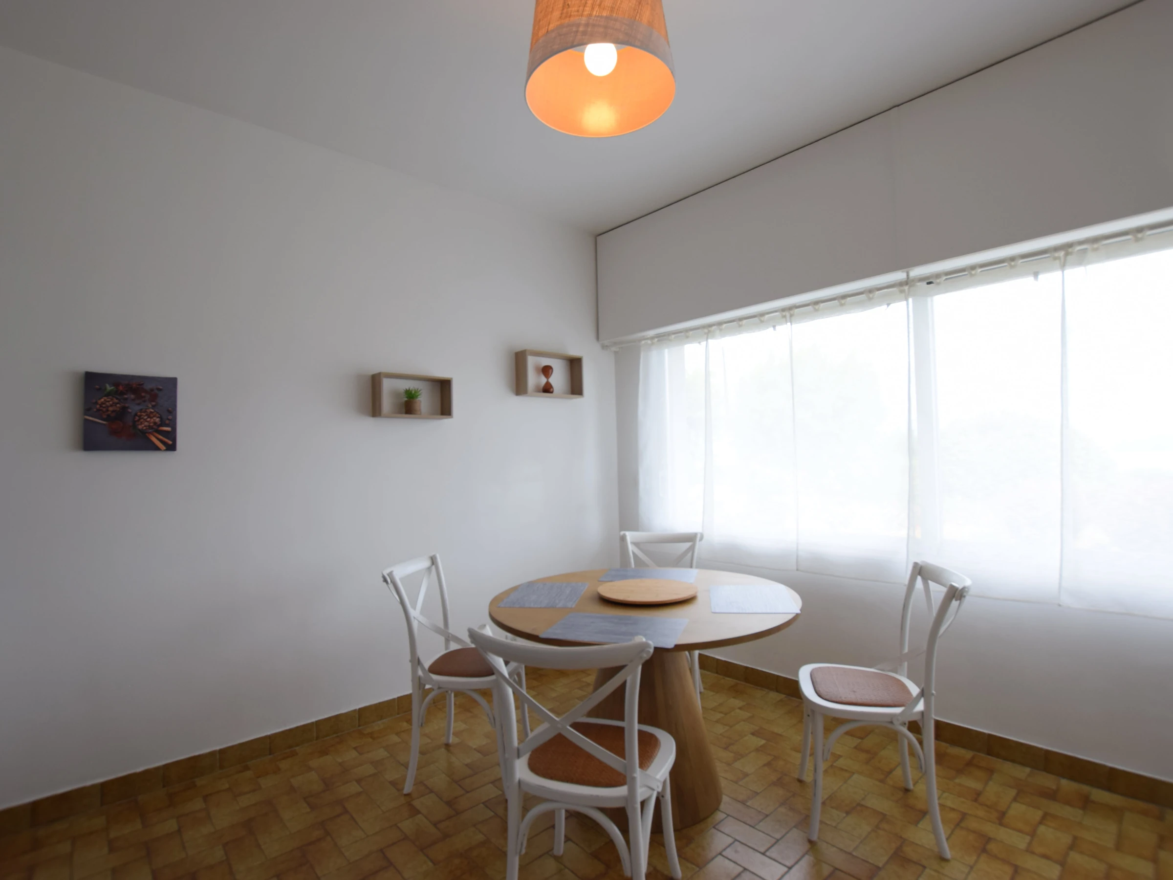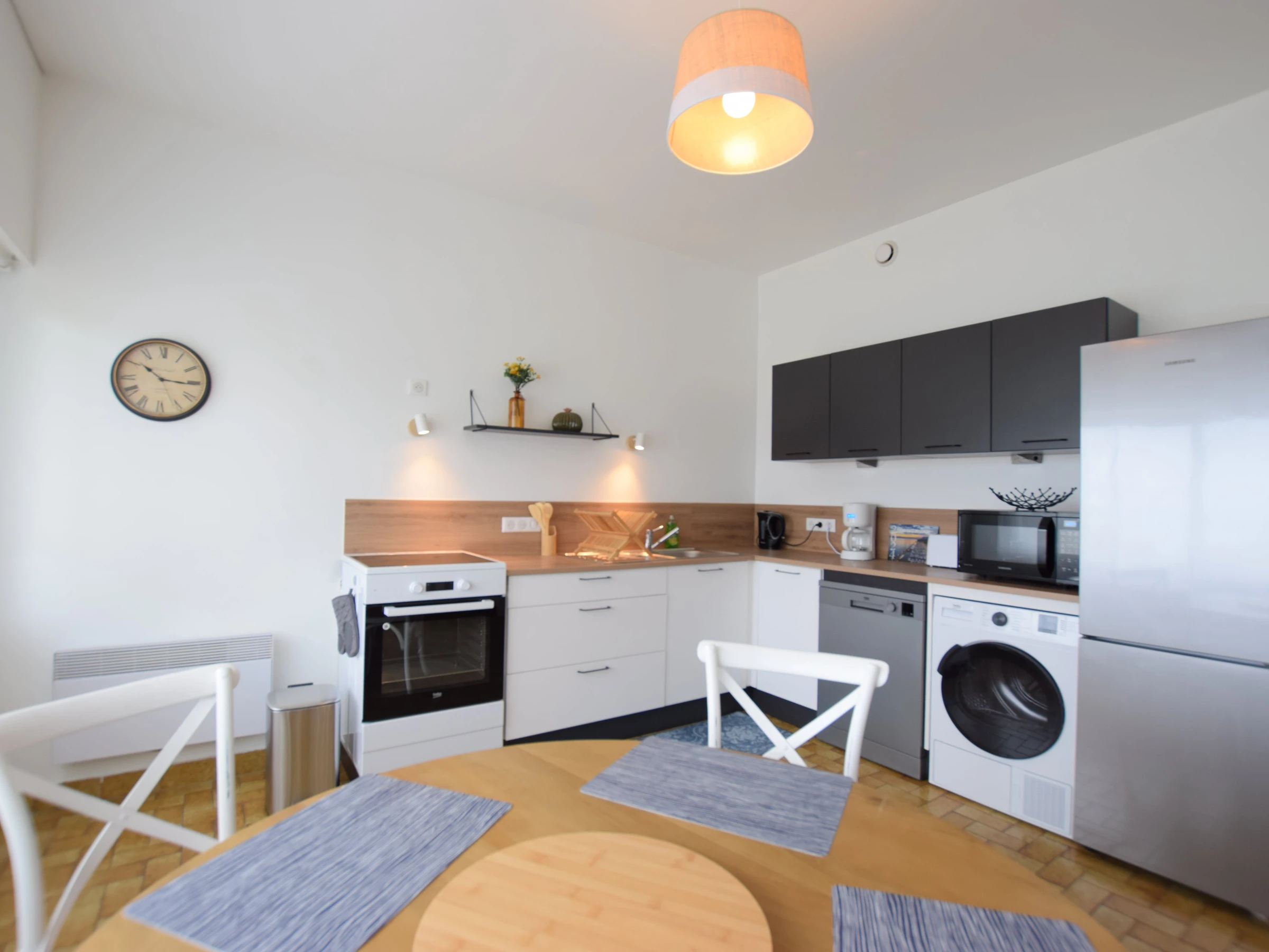 The kitchen dining area with its round table is the perfect place to share friendly moments. This spacious room has a very complete equipment (oven, induction hob, microwave, fridge-freezer, dishwasher, coffee maker, kettle...)