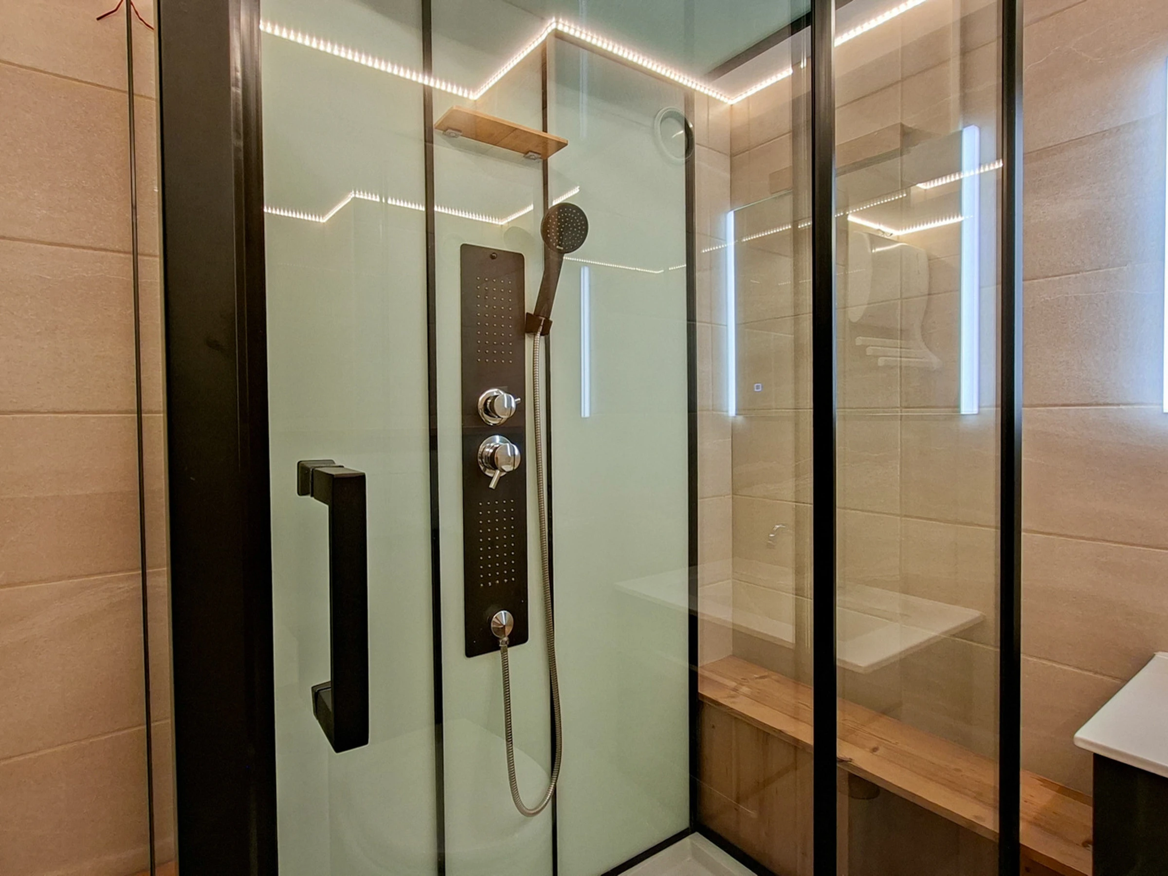 - shower room with toilet, large shower and washing machine