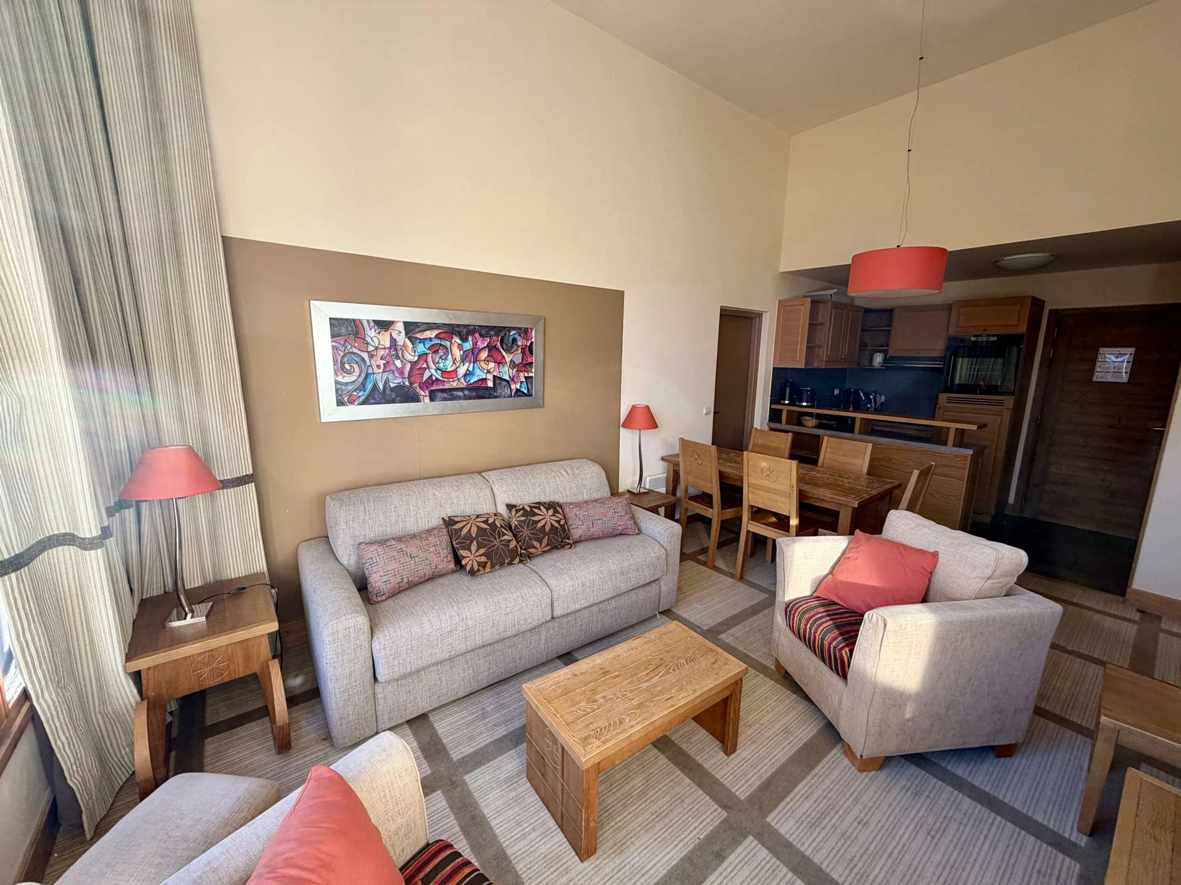 Ideally located at the foot of the ski slopes and shops, this comfortable apartment is just 20 metres from the residence’s heated outdoor pool and spa. It is conveniently situated next to the lift leading to the ski lockers and ski runs. Set on the second floor on the façade side, at reception level, it offers 52 m² of space and a full south-facing exposure with panoramic views of the valley and village.