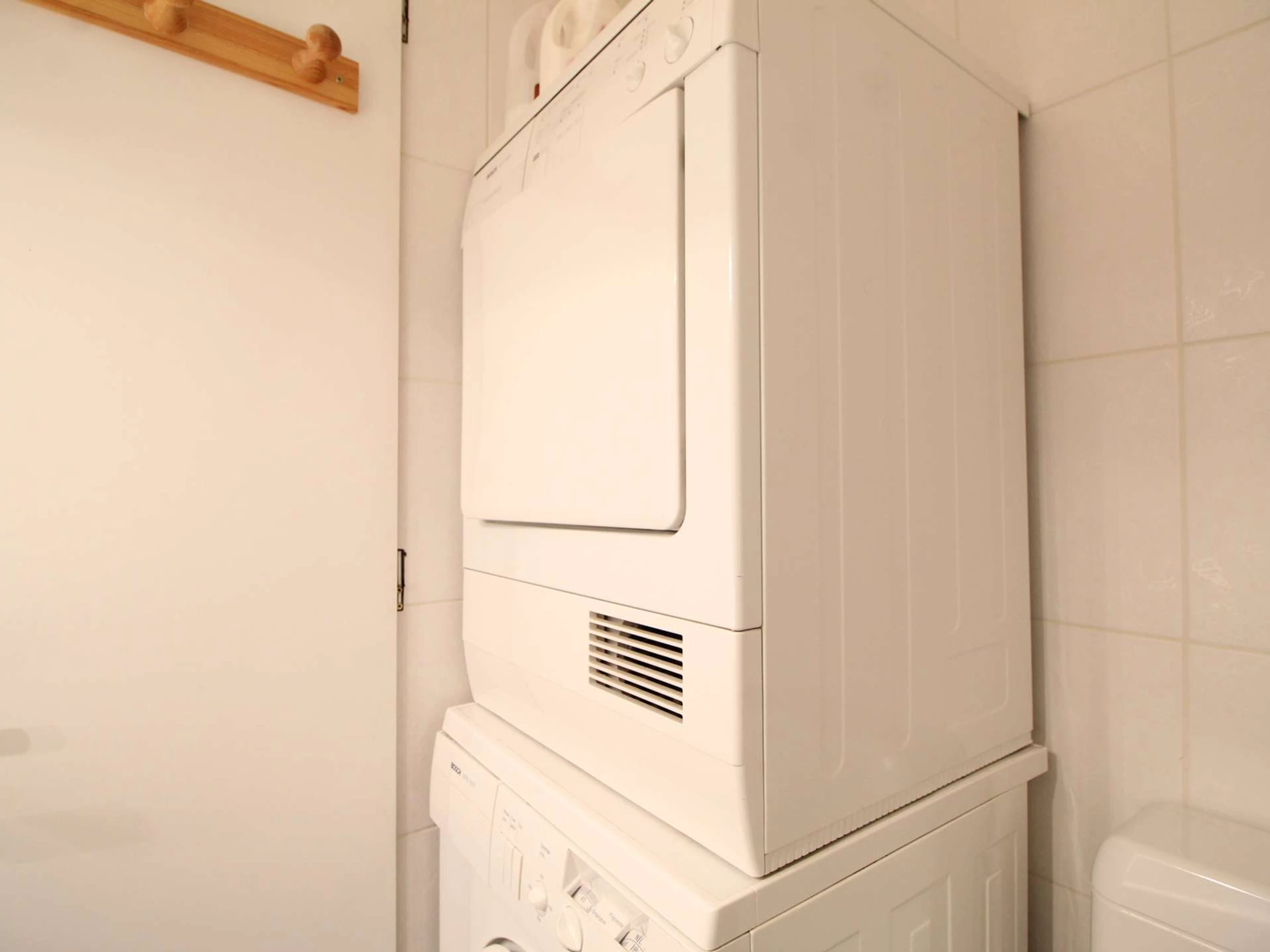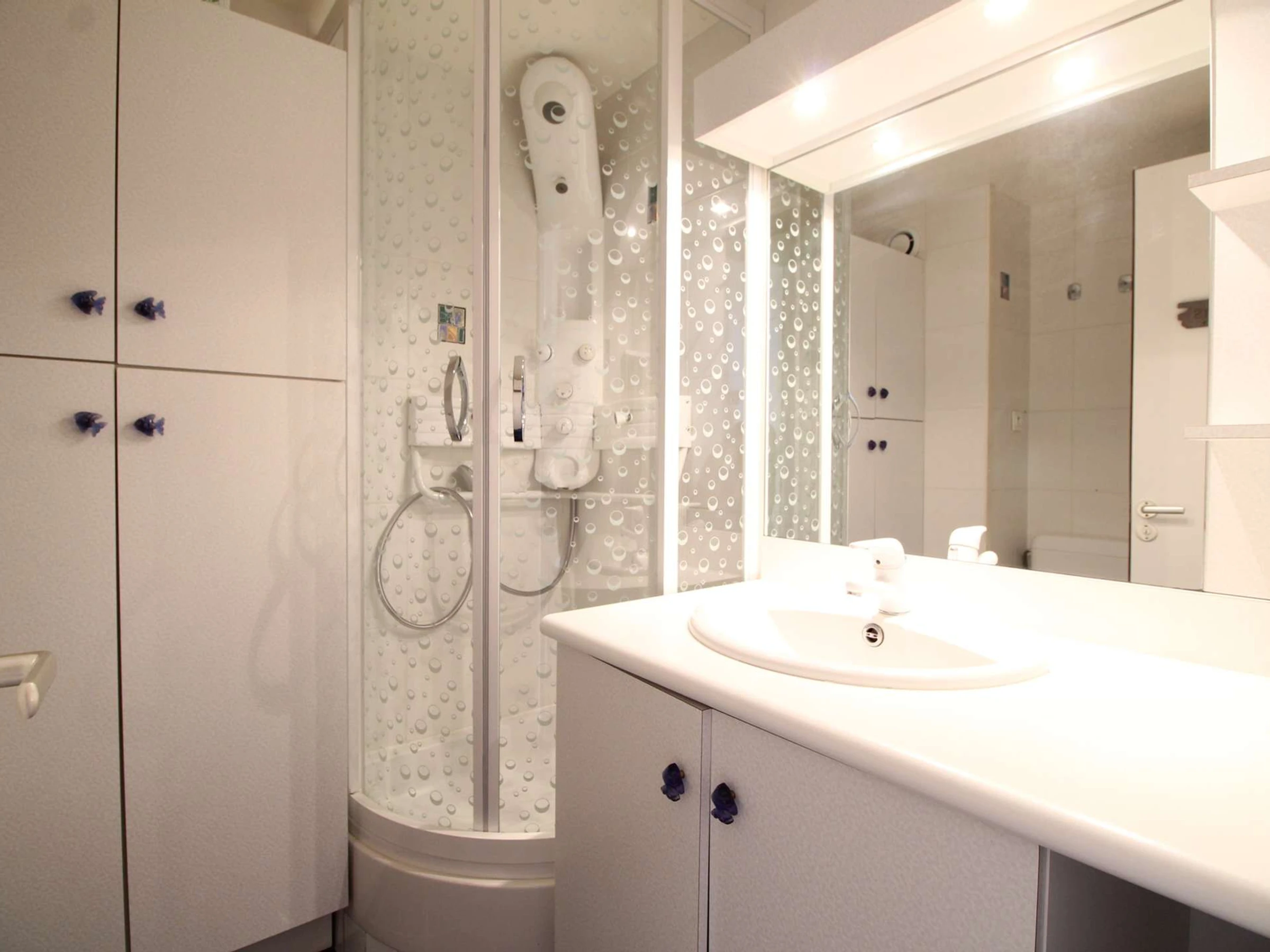The living area includes a BZ sofa bed for two people and a single daybed, while the enclosed entrance has two bunk beds, with the upper bed not suitable for children under six years old. The recently renovated shower room includes a toilet. The kitchen is fully equipped with a microwave and grill function, four induction hobs, a refrigerator, a dishwasher, and a filter coffee maker. A flat-screen TV is available for entertainment, and the apartment also includes a washing machine and tumble dryer for added convenience.