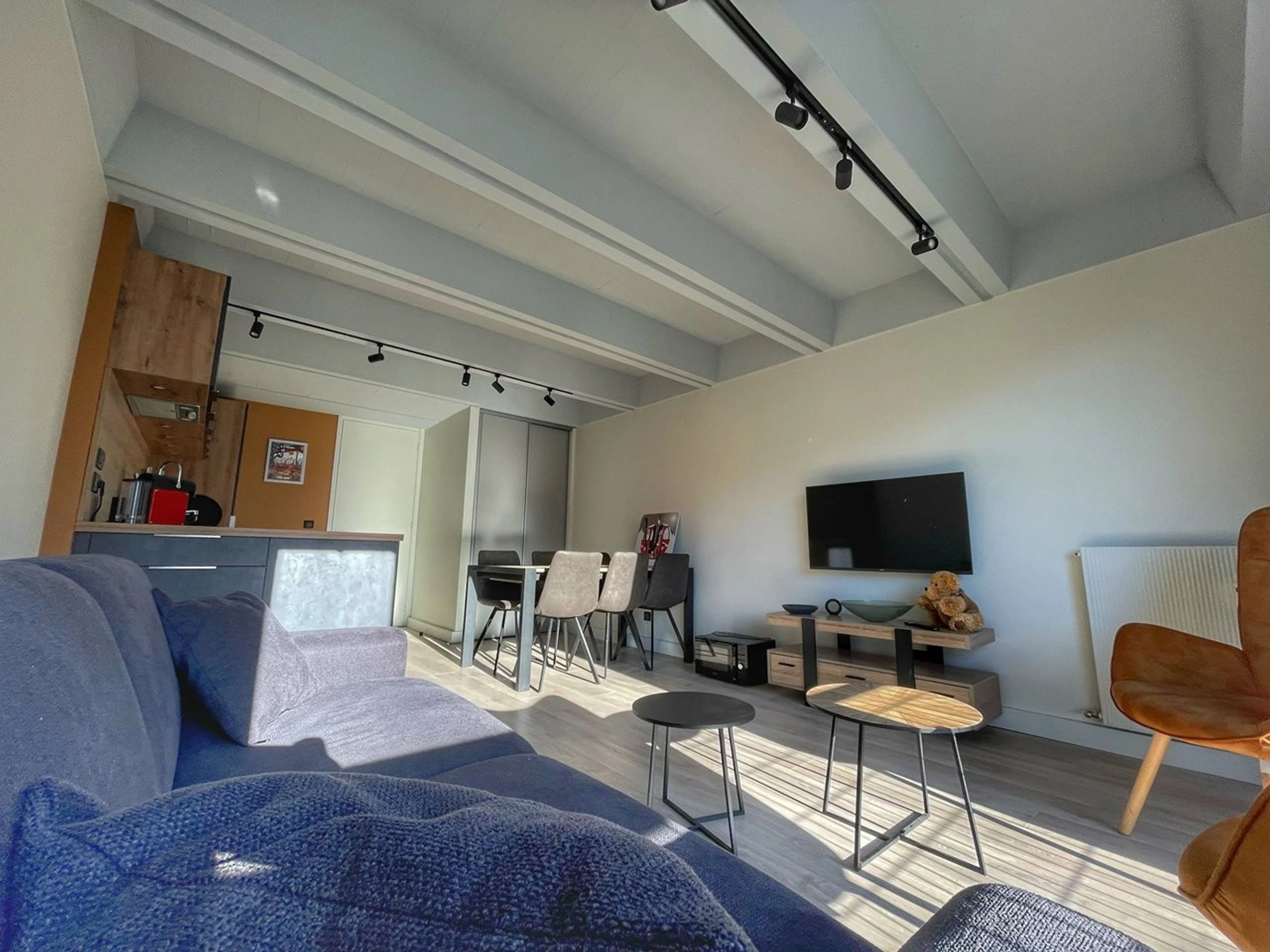 The fully equipped kitchen includes an oven, microwave, ceramic hobs, refrigerator, dishwasher, and a Magimix capsule coffee machine. Additional amenities include a television, washing machine, and heated boot dryer located on the mezzanine level. Central heating and hot water. Outdoor parking is available at the resort. Non-smoking accommodation.