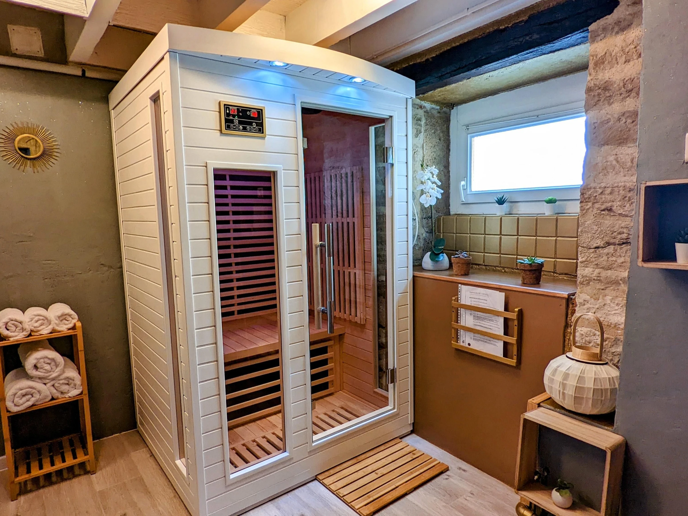 A "zen" space with an infrared sauna and a relaxation lounge with herbal teas – In Fleurey-sur-Ouche, stroll along the riverbank and cycle along the Burgundy Canal. Just 15 minutes from Dijon, on the banks of the Burgundy Canal, with all amenities, this charming and unique house comprises: on the raised ground floor: a living room (with a sofa bed offering two additional sleeping spaces for an extra €15/night/person), TV, Bluetooth speaker, opening onto a dining room and fully equipped kitchen. On the lower floor: a bathroom with a bathtub and toilet. A "zen" space with an infrared sauna and a relaxation lounge with herbal teas. On the first floor: one bedroom with a queen-size bed (160 cm) and one bedroom with two single beds (90 cm). Reversible air conditioning. Small terrace with garden furniture, barbecue, and parasol. Maximum two pets allowed. This cottage is not suitable for people with reduced mobility (steep stairs).