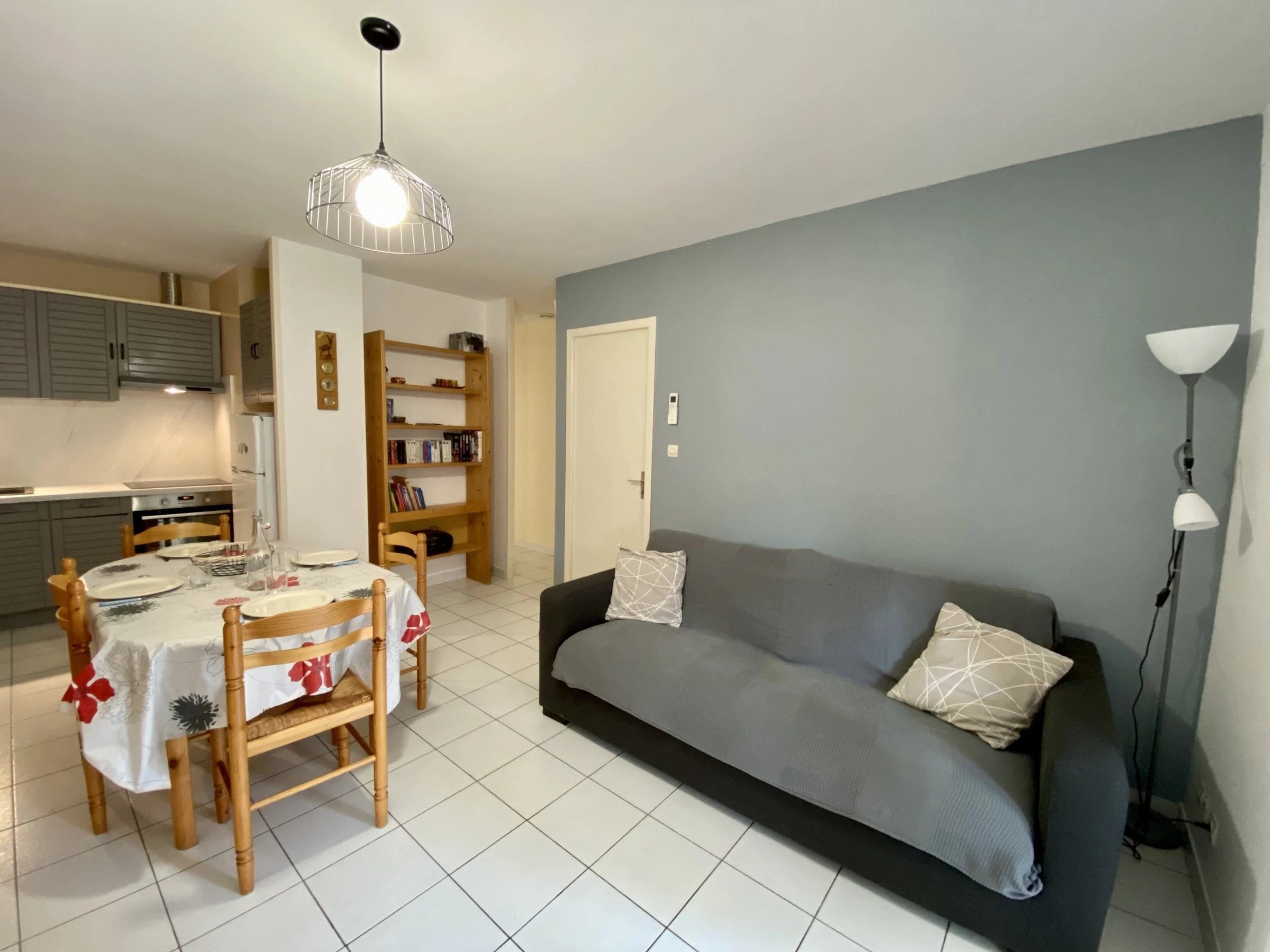 On the ground floor, cute veranda and garden table, spacious living room with lounge area and dining table.