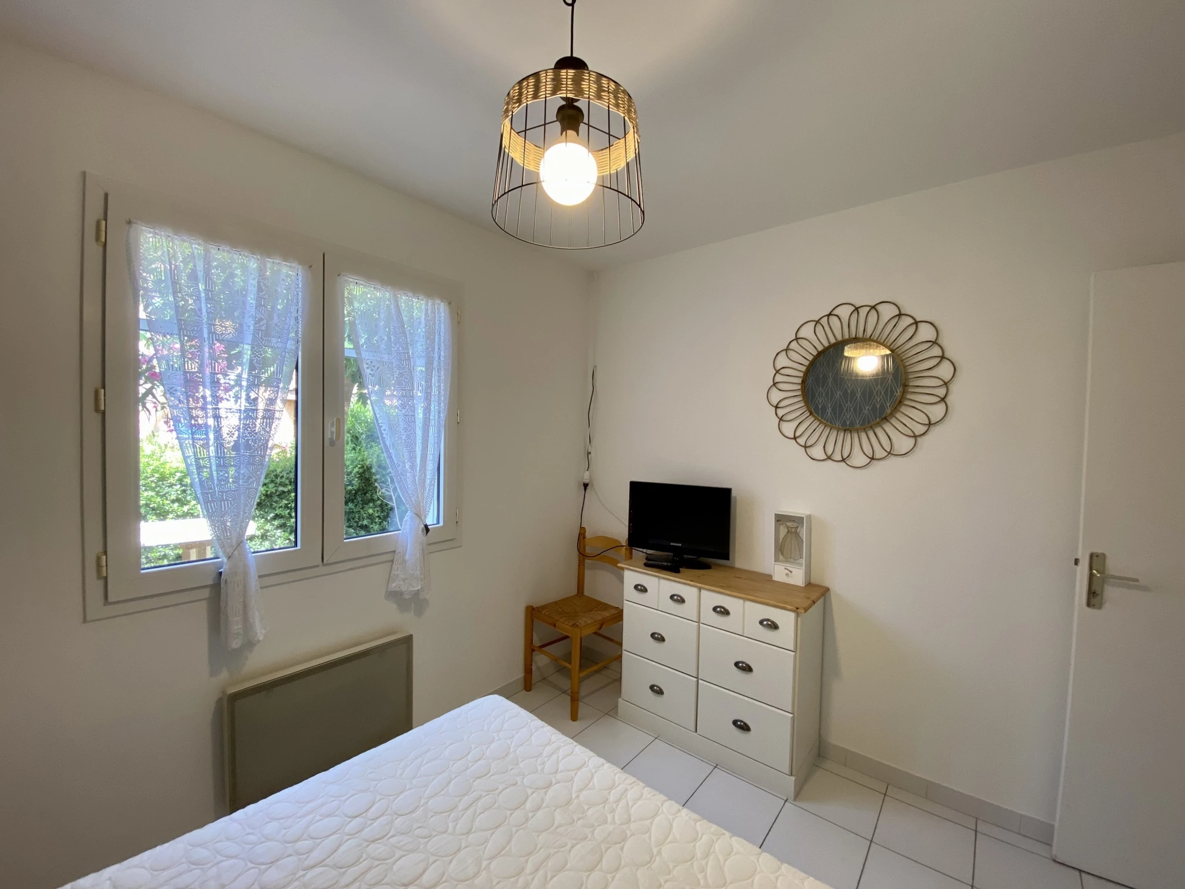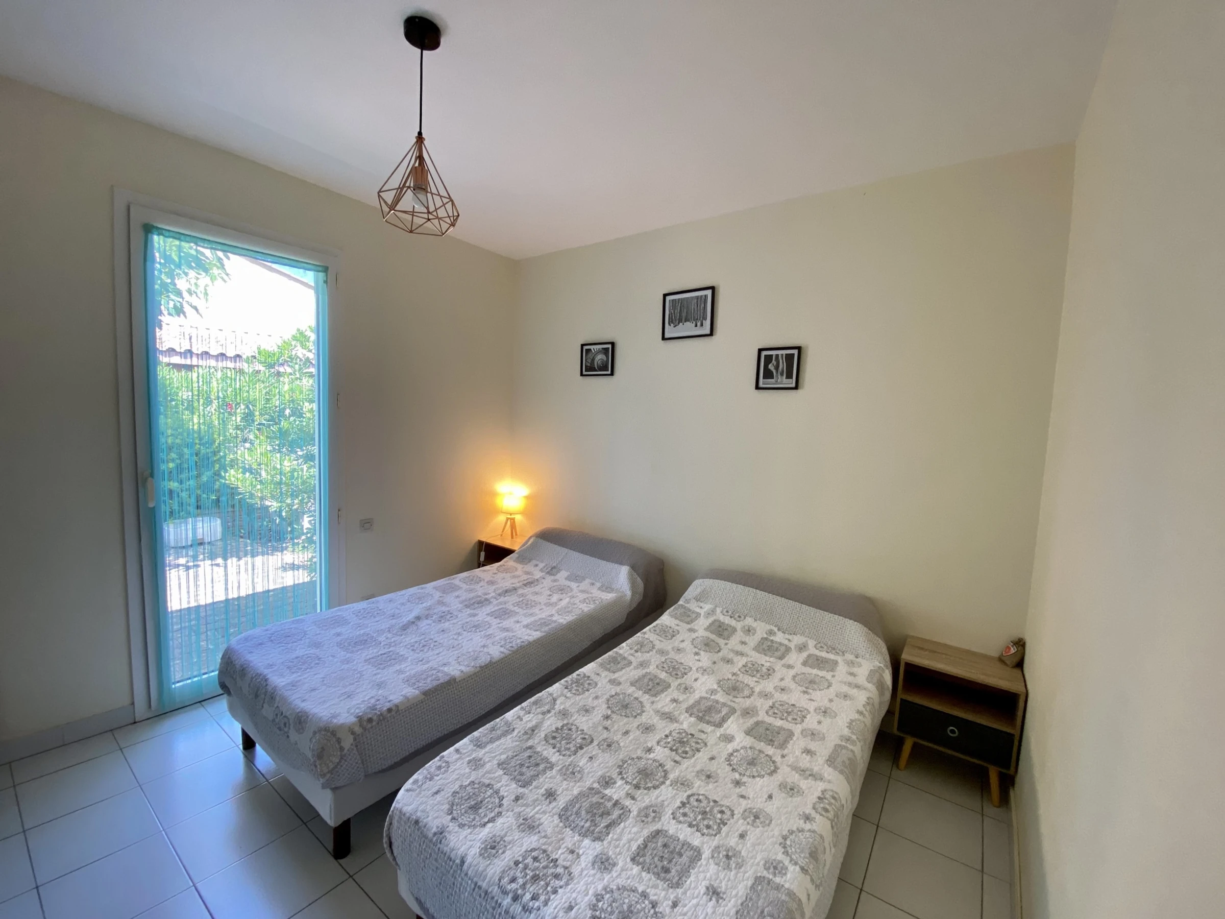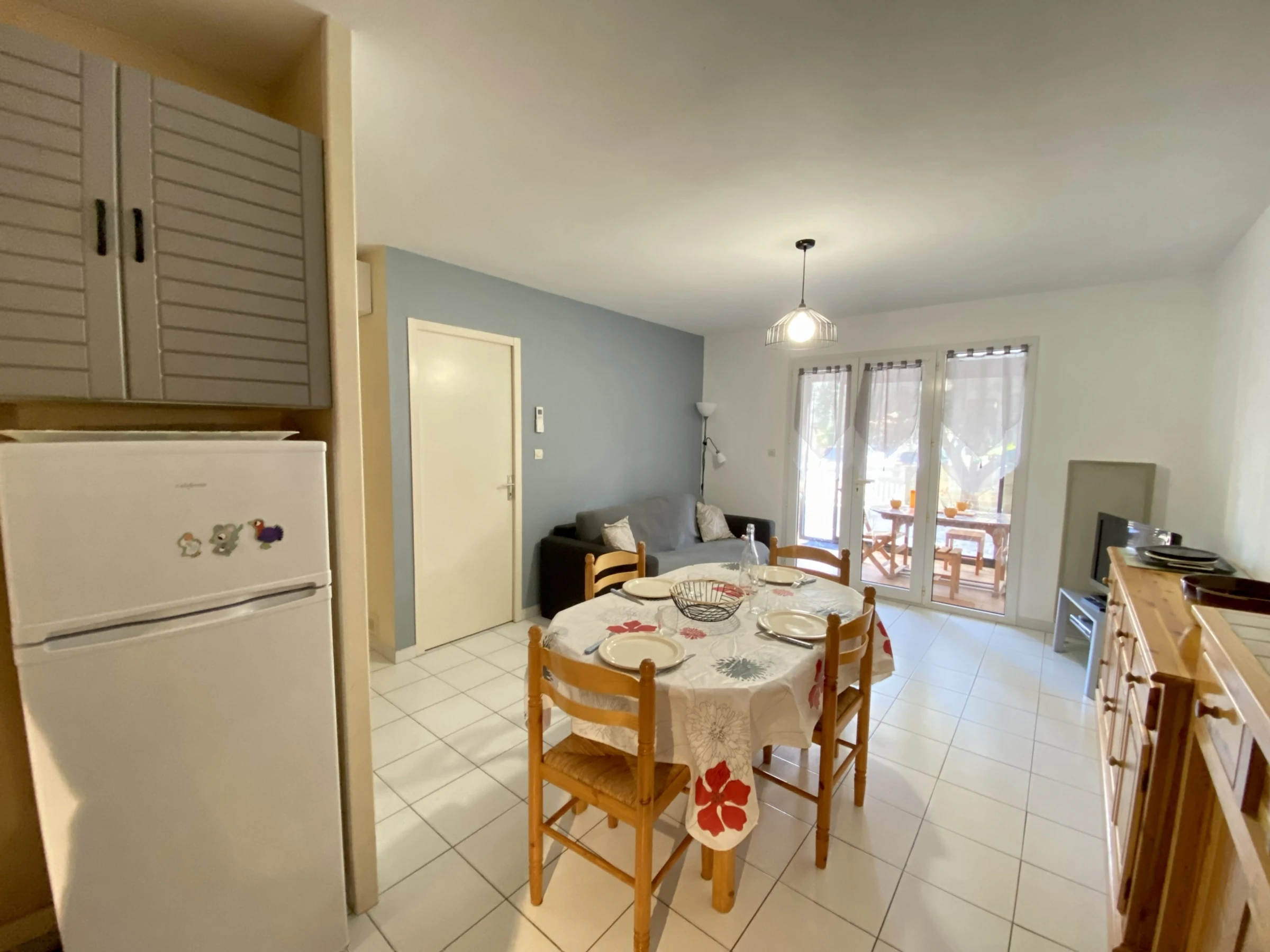 Fitted kitchen area. 1 bedroom (1 double bed), 1 bedroom (2 single beds), with French window opening onto a backyard.