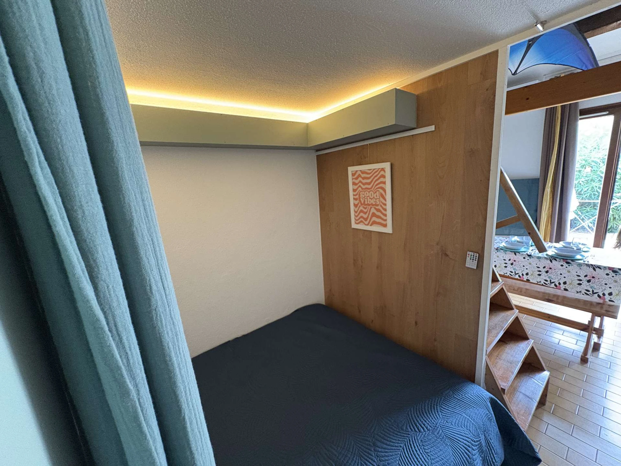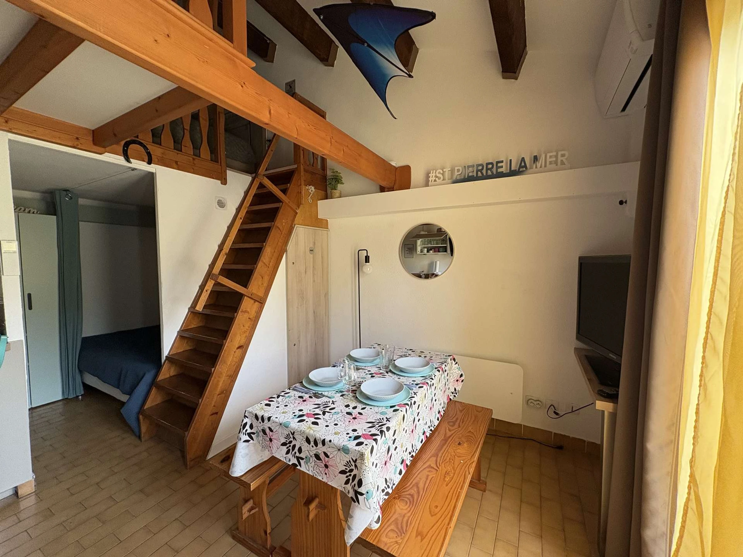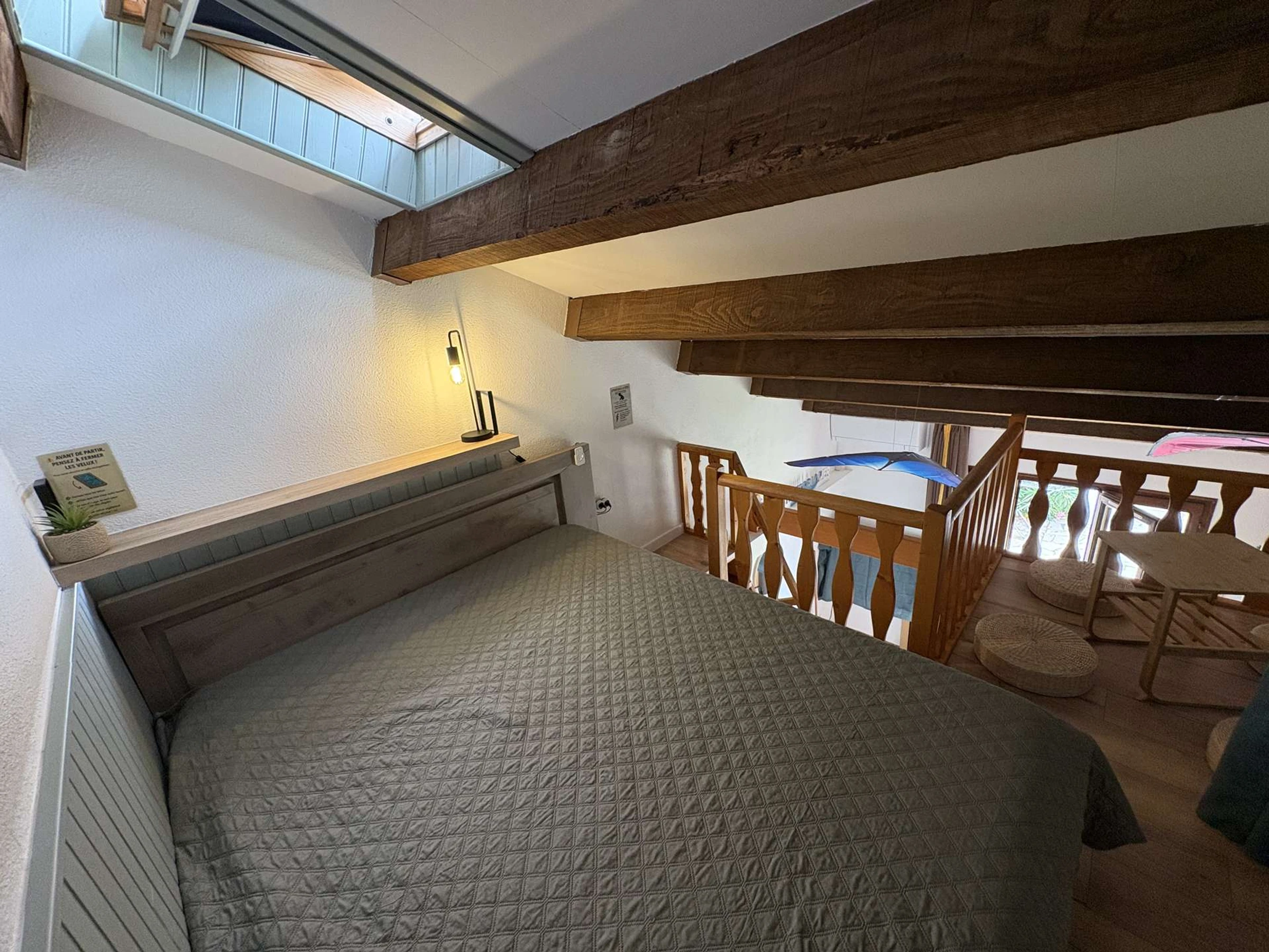 Le logement : Cet hébergement de vacances en famille situé proche de la piscine comprend un séjour avec canapé convertible et téléviseur (sous réserve d'une bonne réception), un espace cuisine équipée refaite à neuf, une chambre avec un lit double en 140, une salle d'eau avec WC, à l'étage une mezzanine avec un lit double en 160.