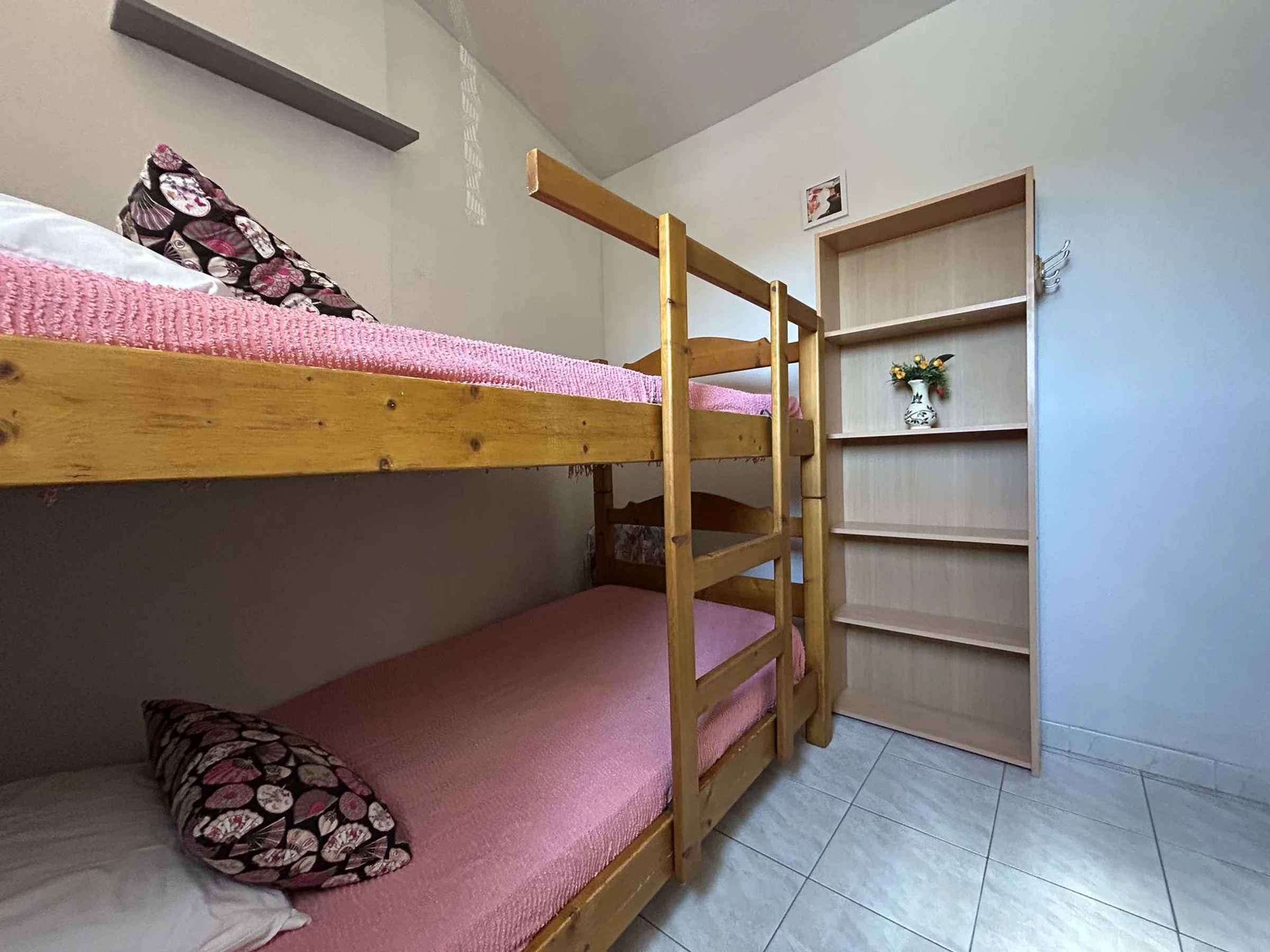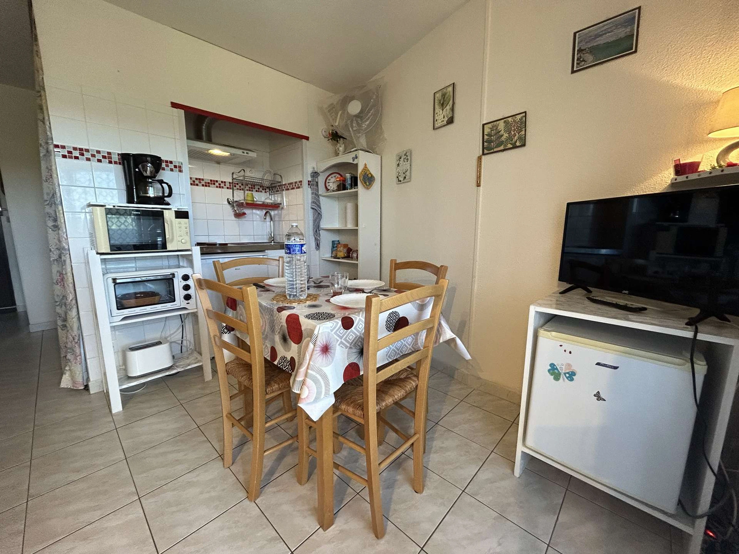 This first-floor holiday rental includes a living room with a television (subject to good reception), a fully equipped kitchenette, a bedroom with two bunk beds, and a bathroom with a toilet.