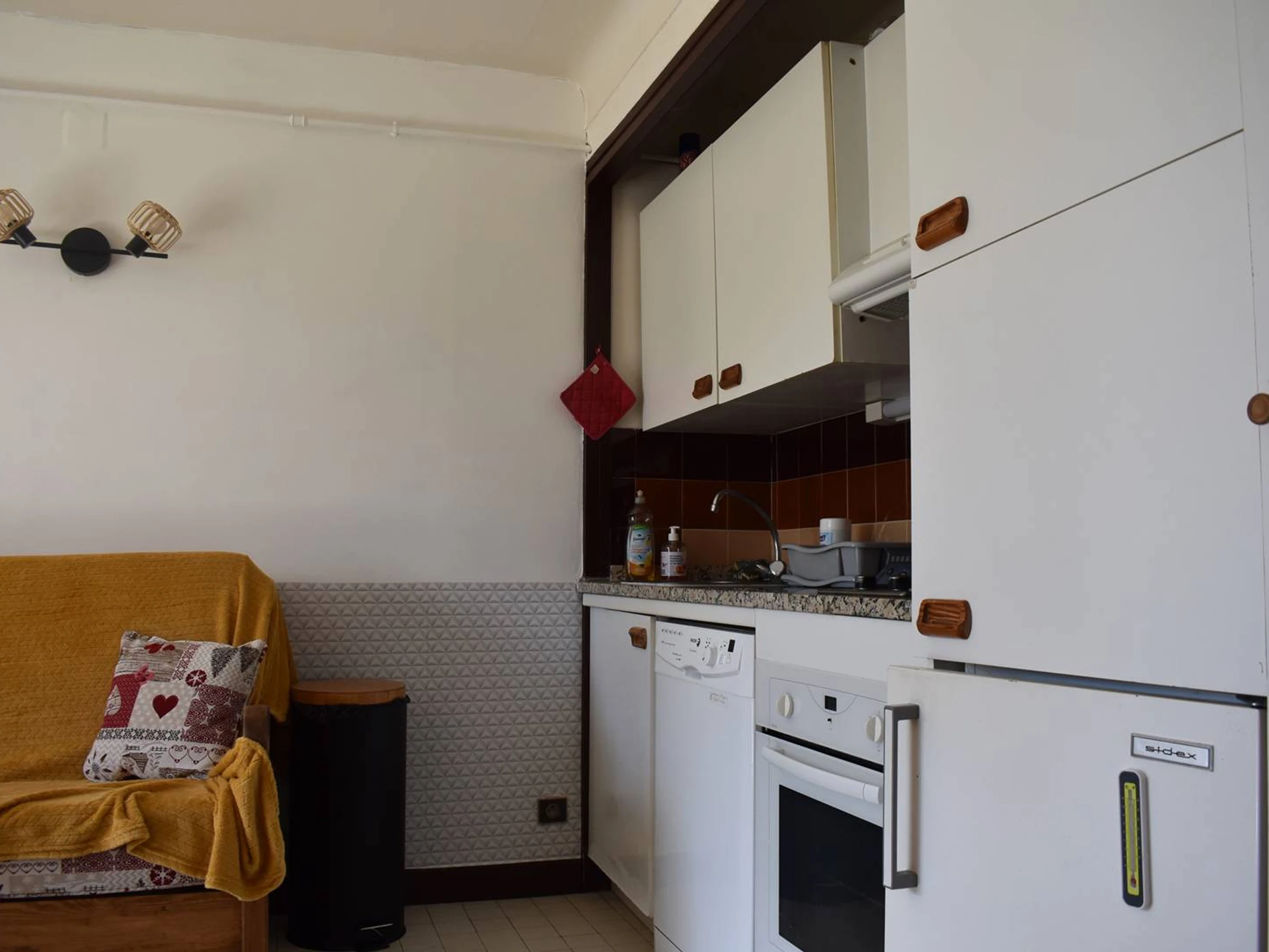A south-facing living room with a sofa bed, a kitchenette equipped with 2 electric hobs, oven, microwave, refrigerator, extractor hood, dishwasher, and SENSEO coffee machine.