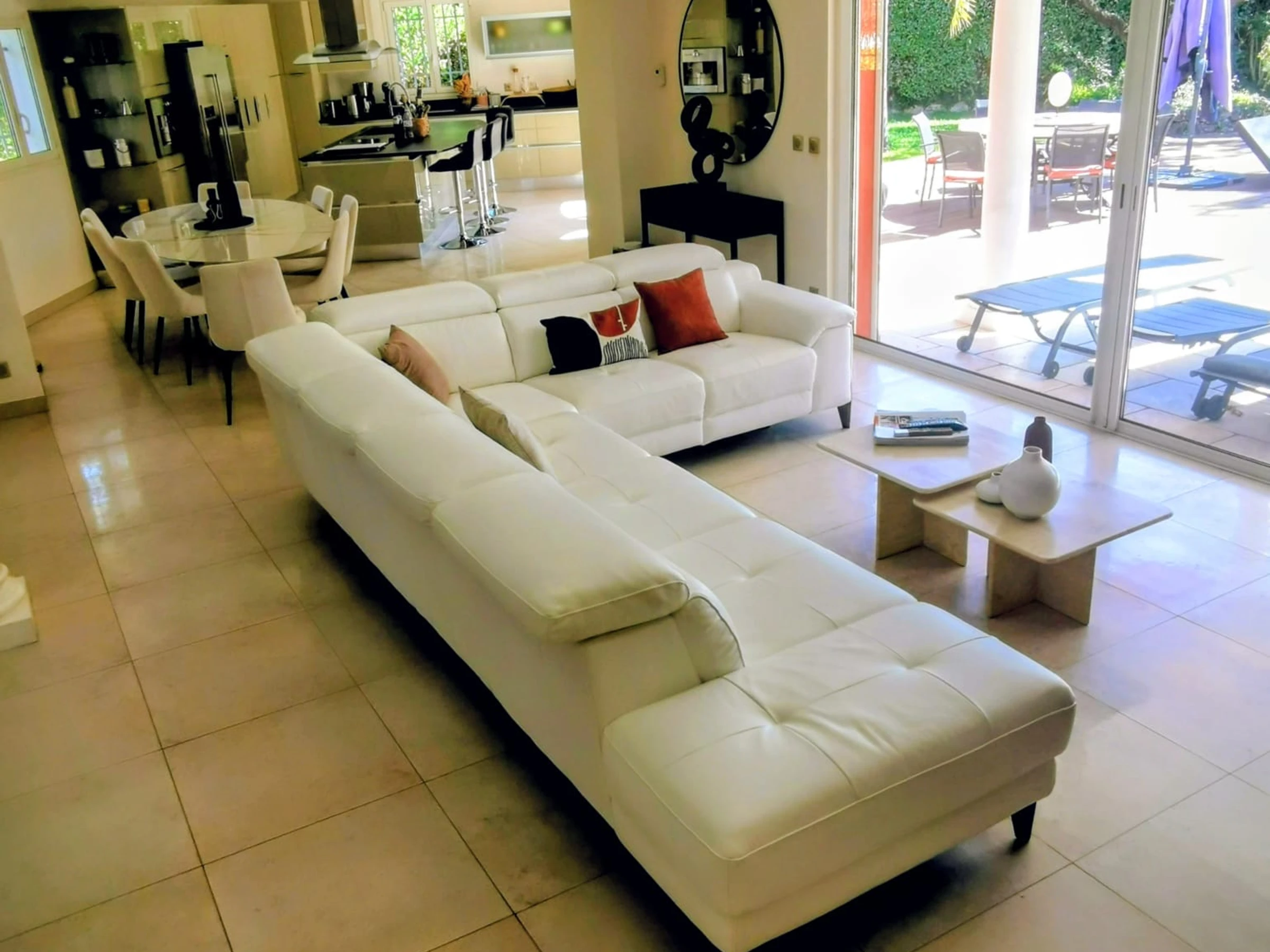 It features a spacious living room with a magnificent white leather sofa, including two electric recliners, offering views of the garden and pool, decorated in soothing colors and high-quality materials.