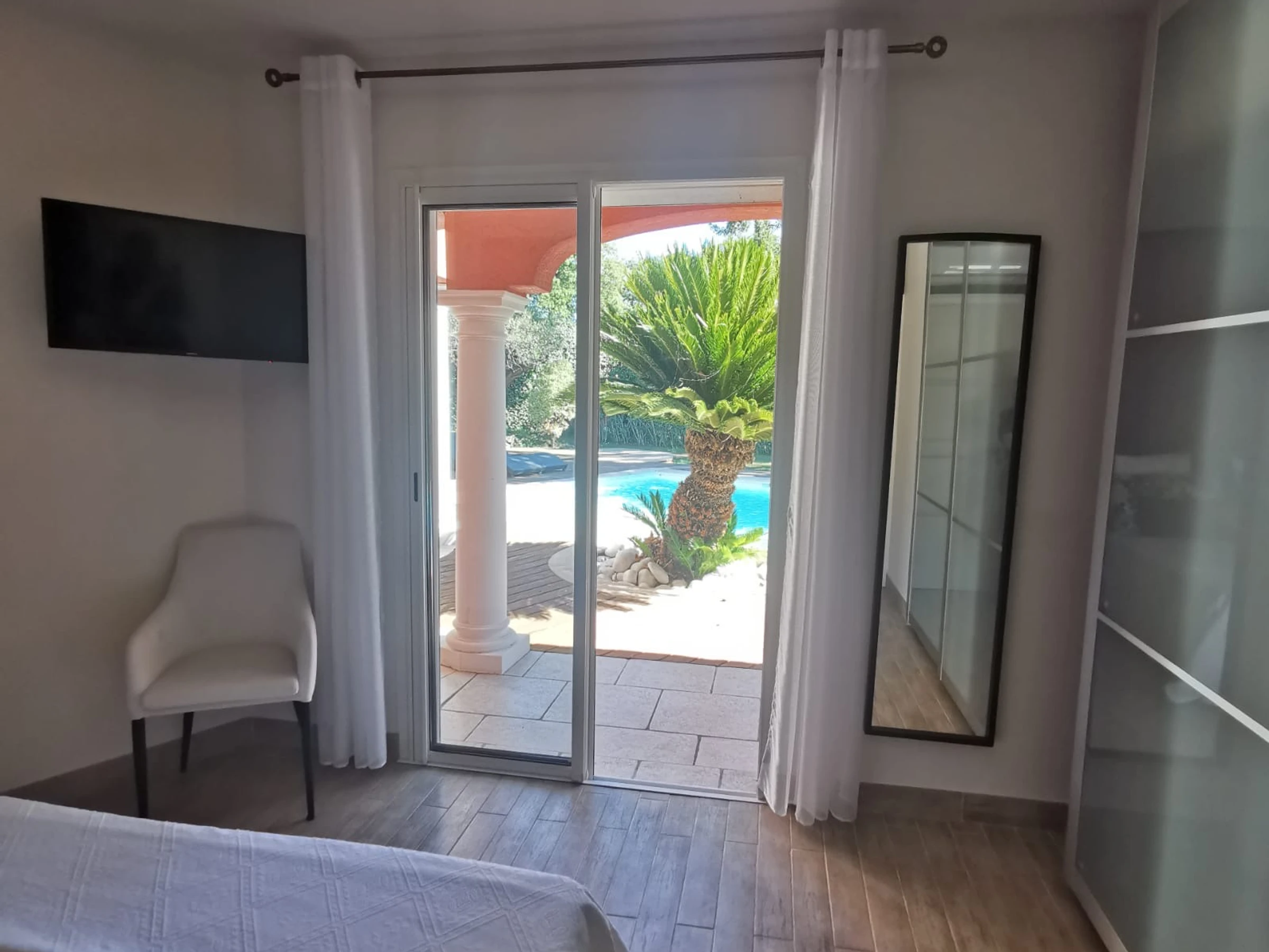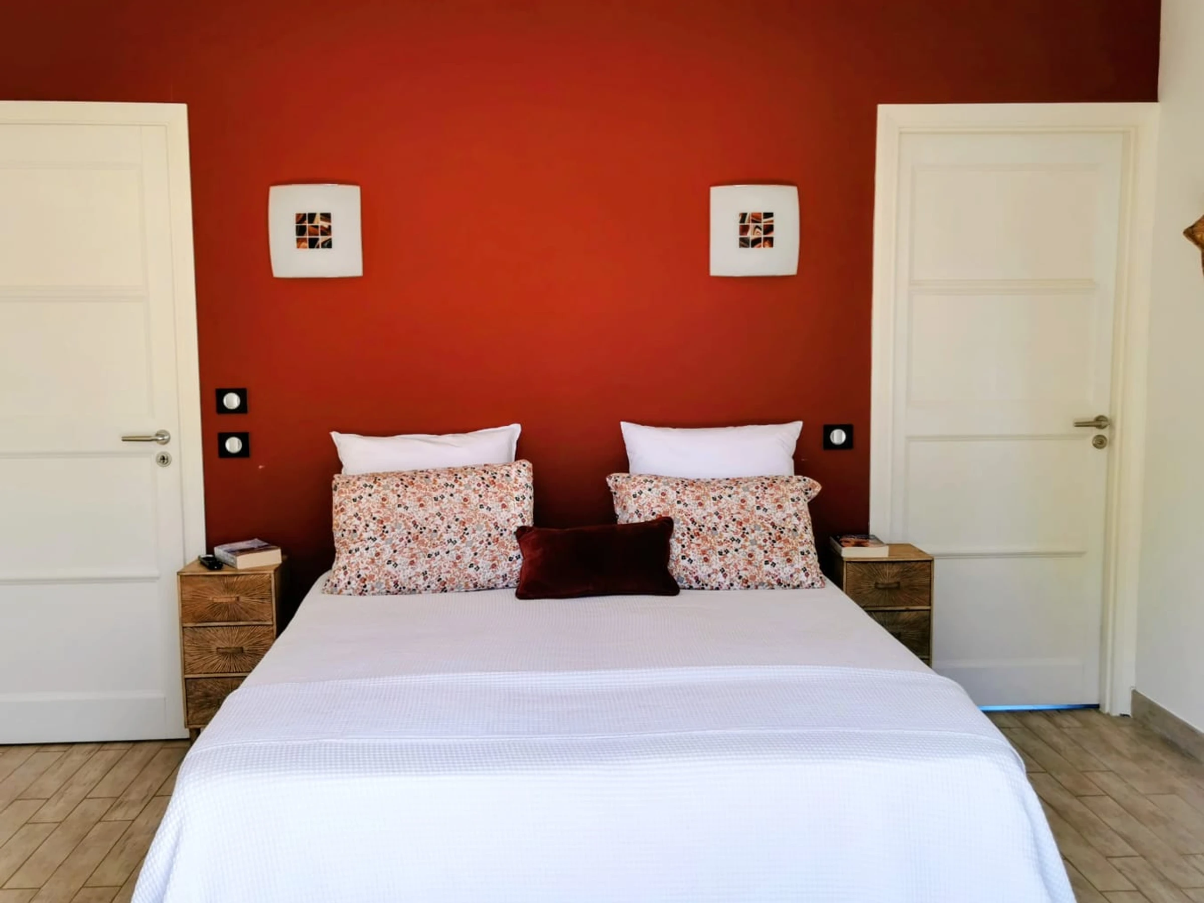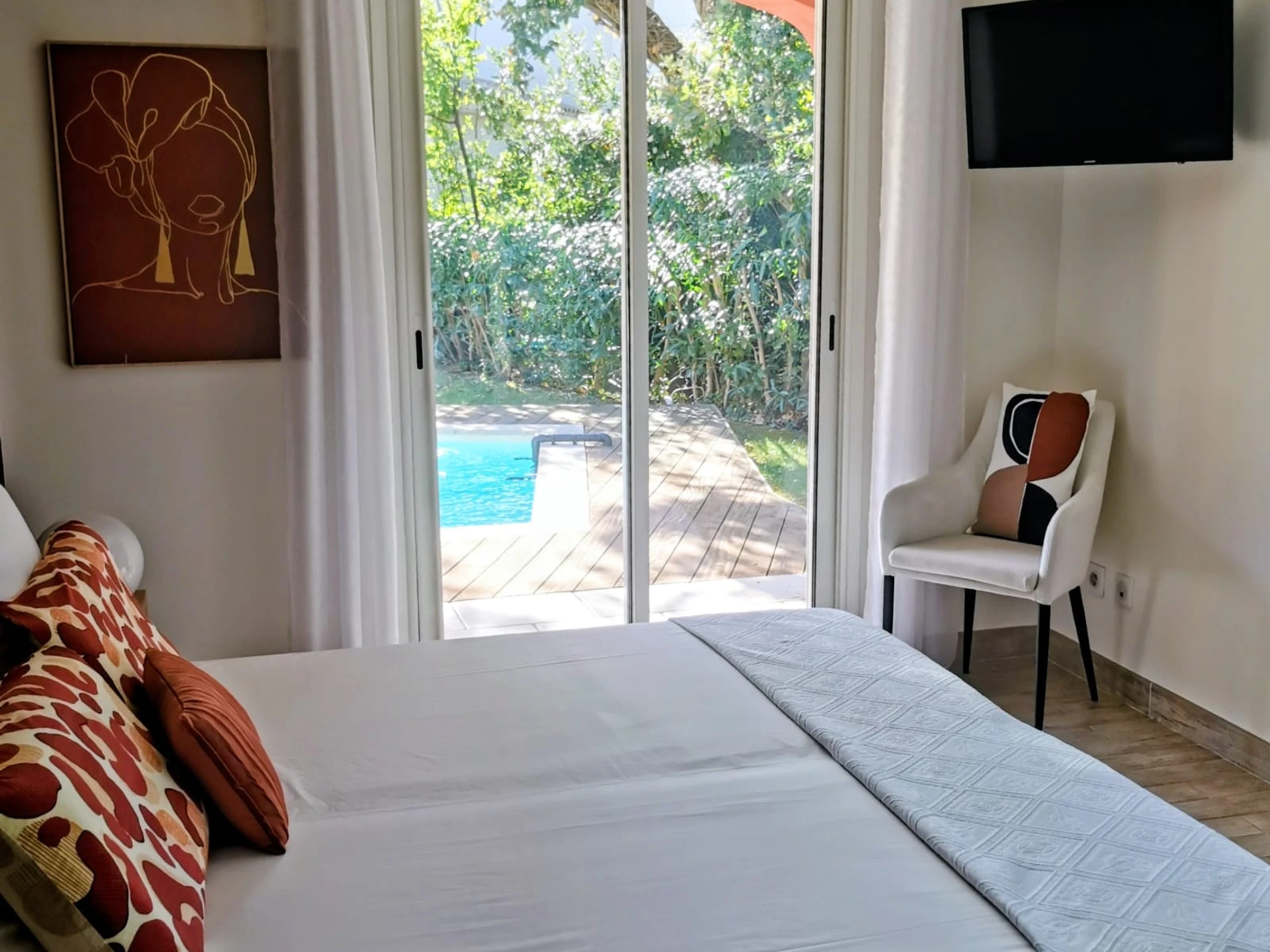 On the ground floor: a first bedroom with a double bed (160x200cm), overlooking the pool.