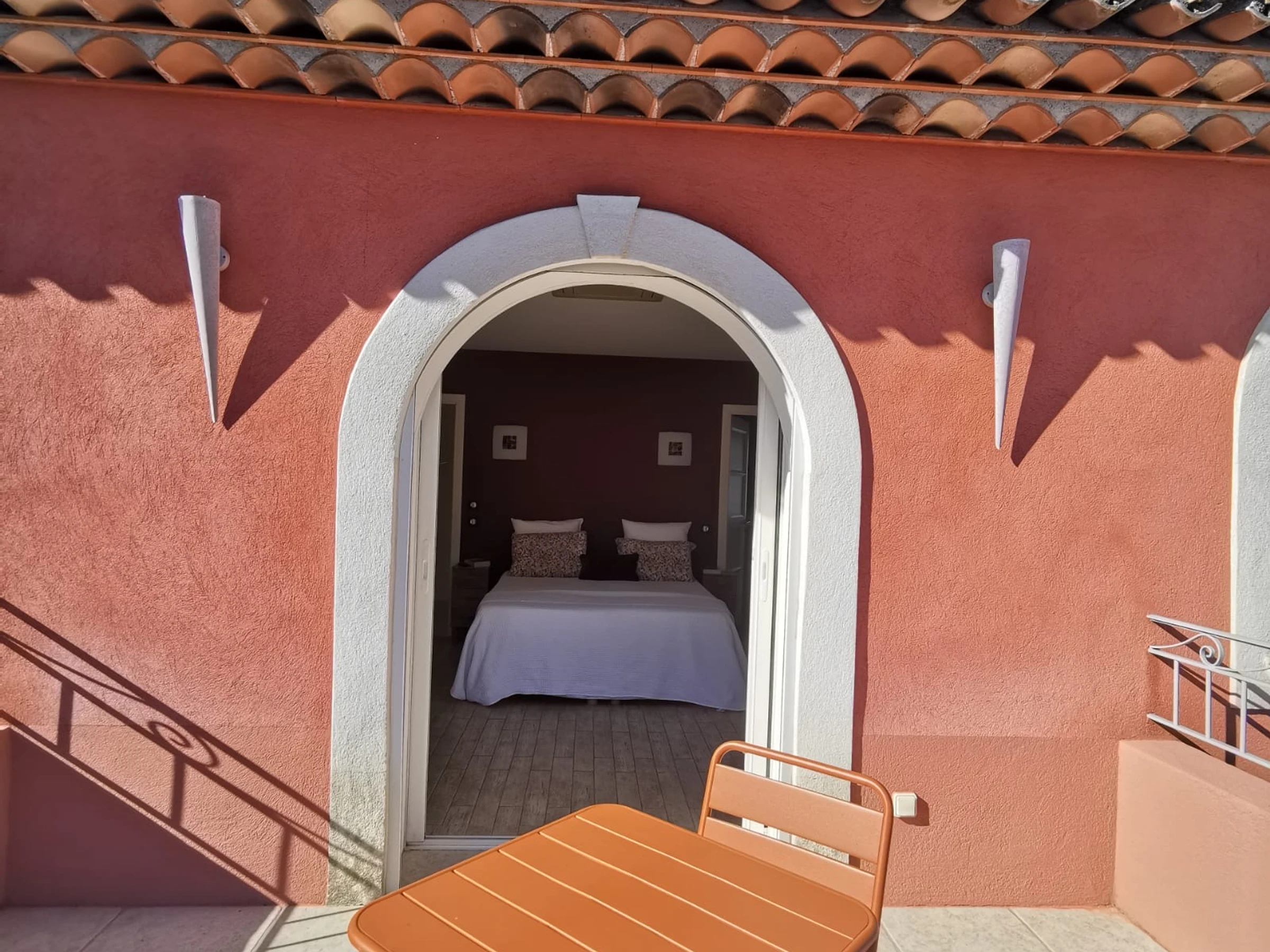 Upstairs: a master suite with a double bed (180x200cm) with a lovely private terrace and a beautiful view of the pool.