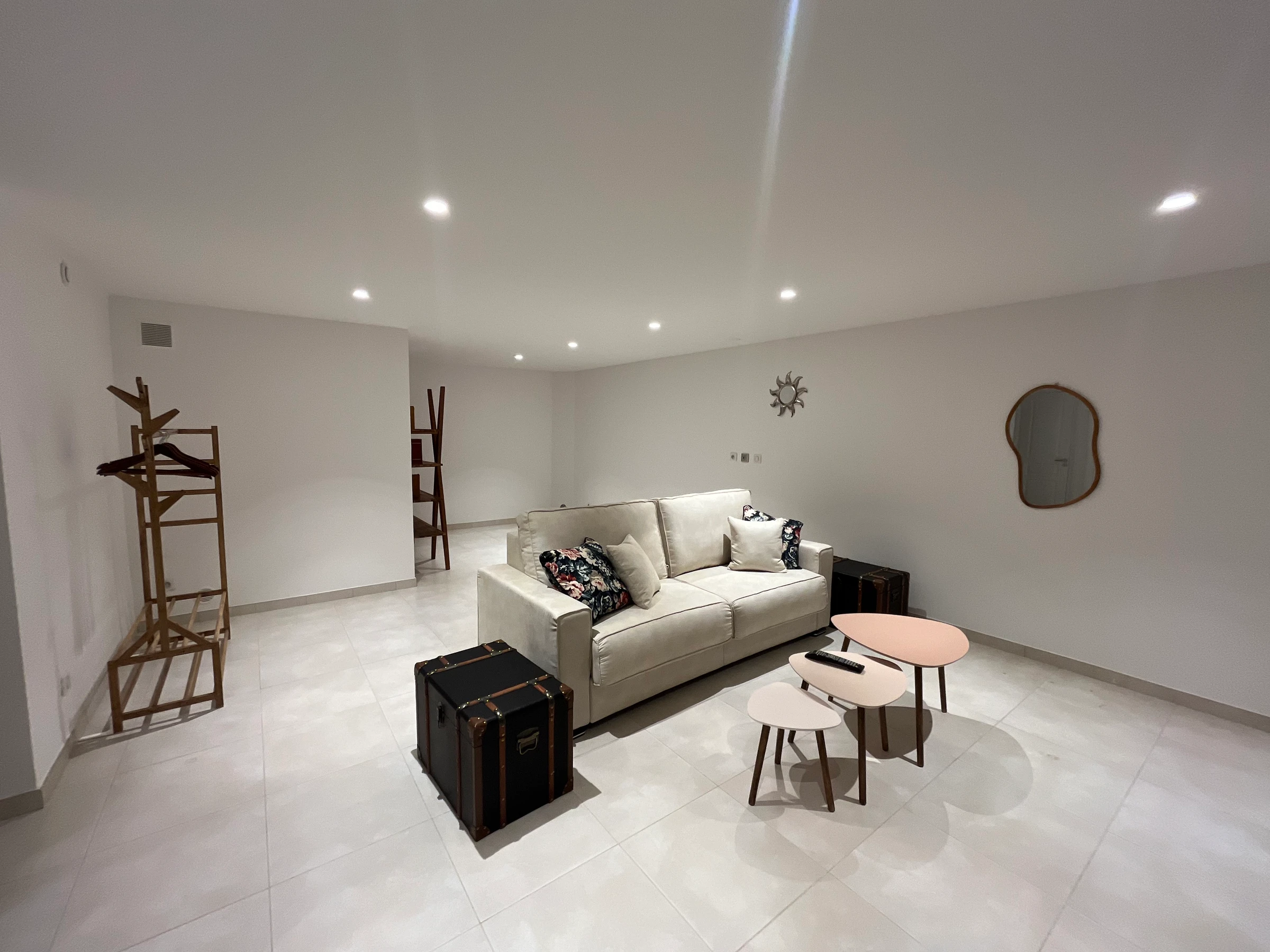 A fully furnished basement with a double sofa bed with a 16cm-thick mattress (160x190cm), a laundry room (washing machine, dryer, etc.).