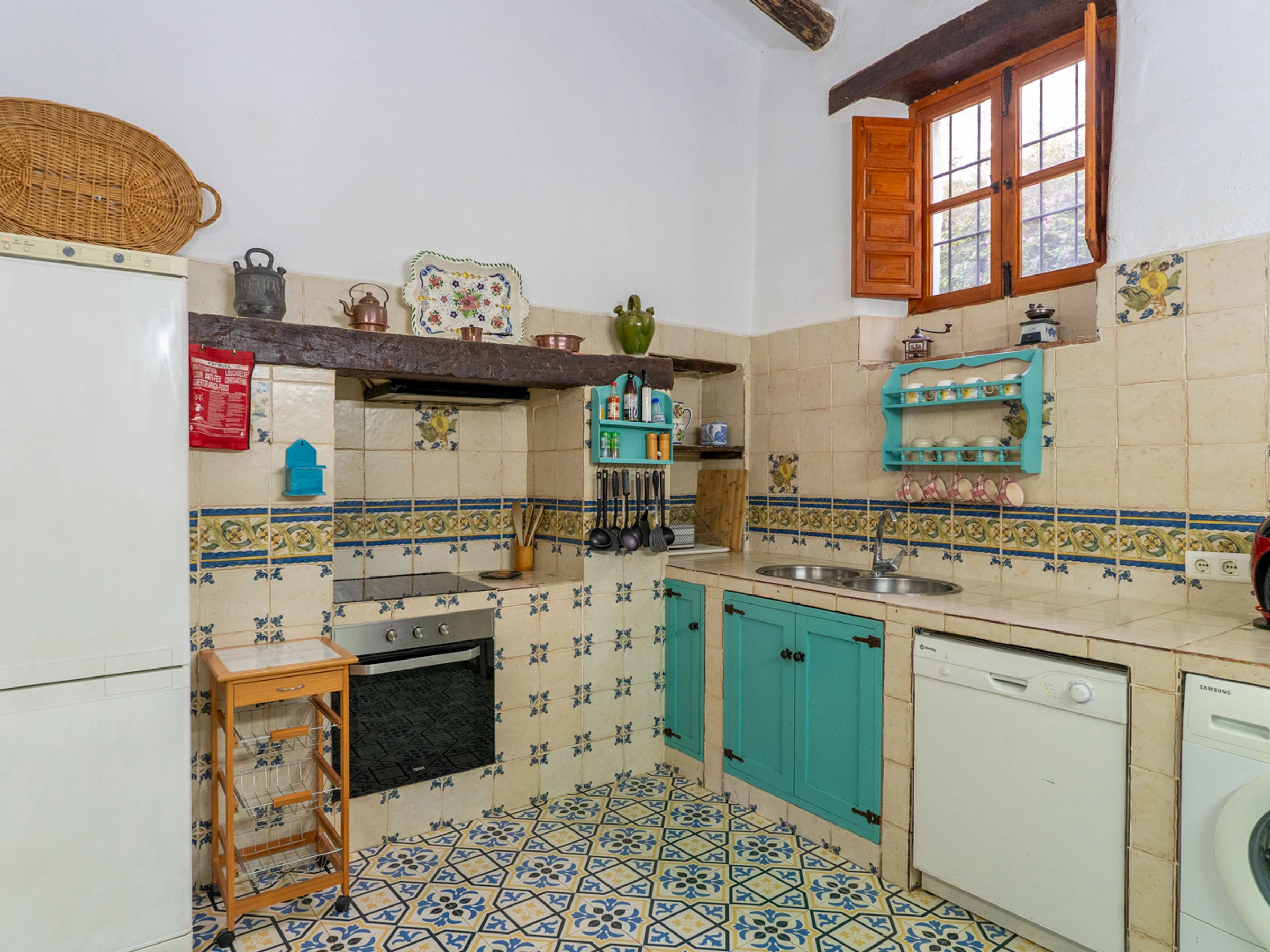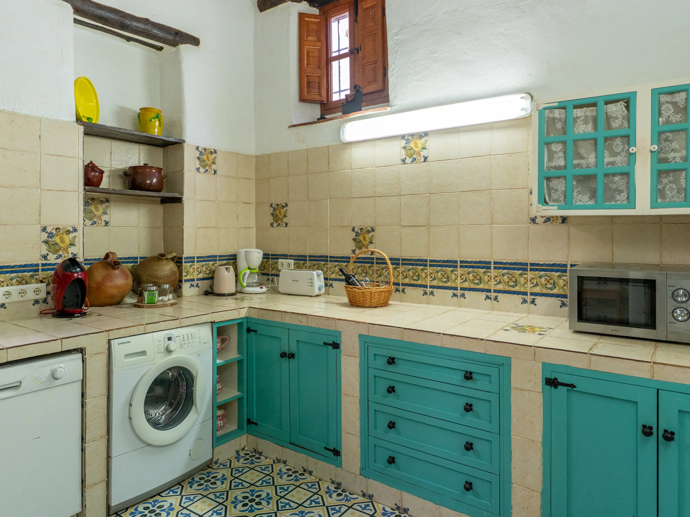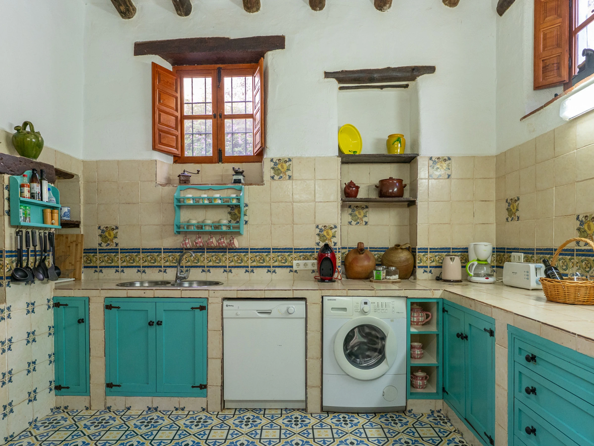 The kitchen is styled with traditional Andalucian tiles yet comes fully equipped with all modern comforts, including a fridge-freezer, oven, hob, microwave, dishwasher, washing machine, and a full range of utensils, so you have everything you need to prepare home-cooked meals.