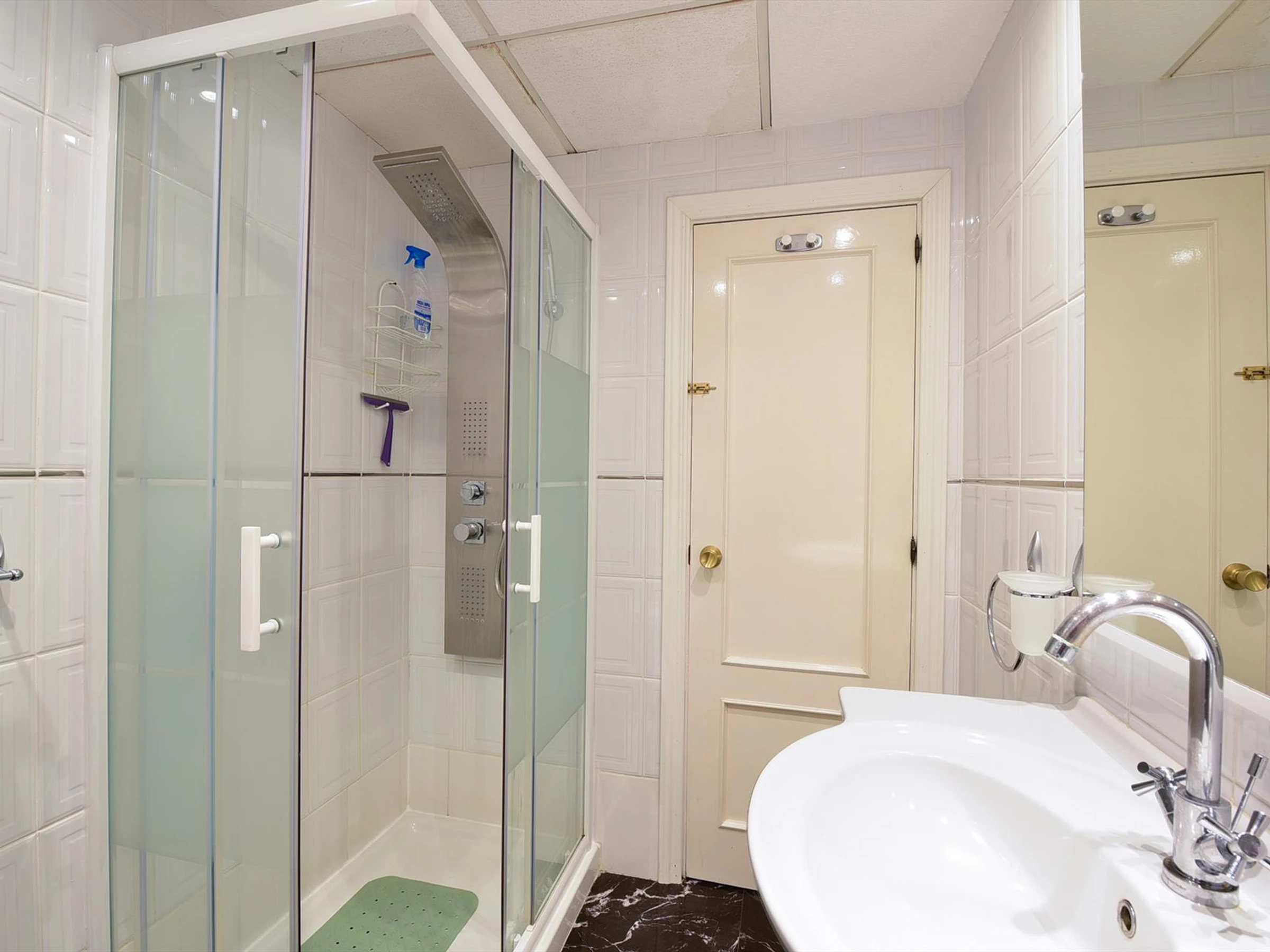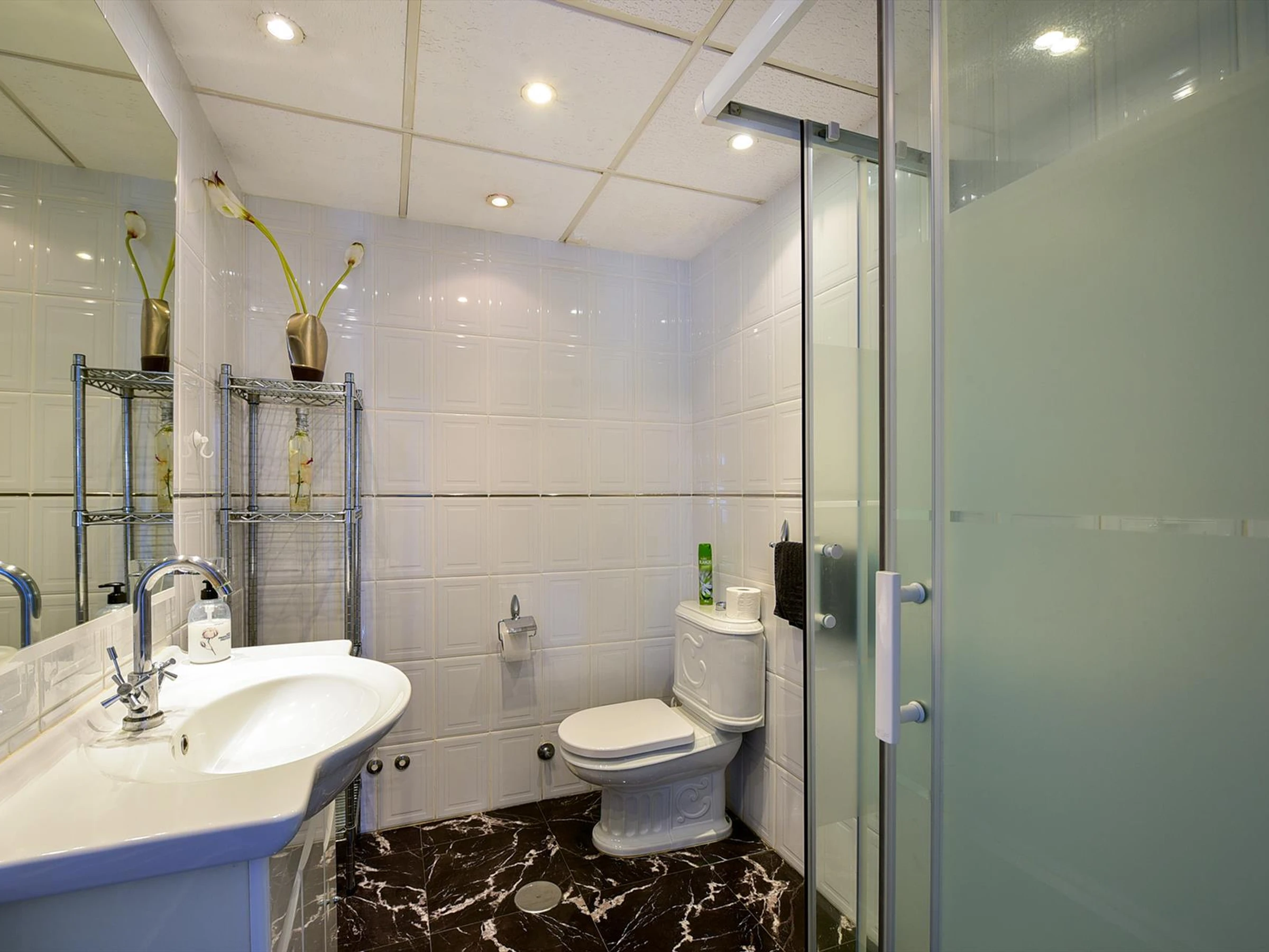 One bathroom with shower, bath furniture with washbasin and toilet.
