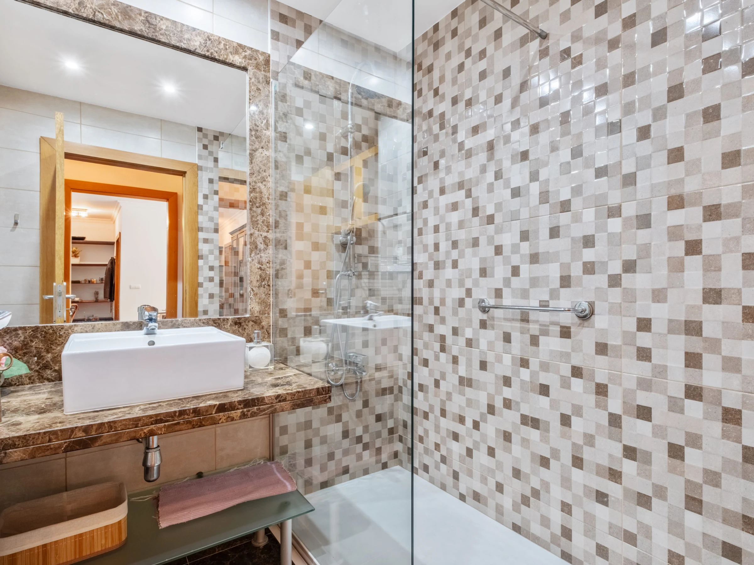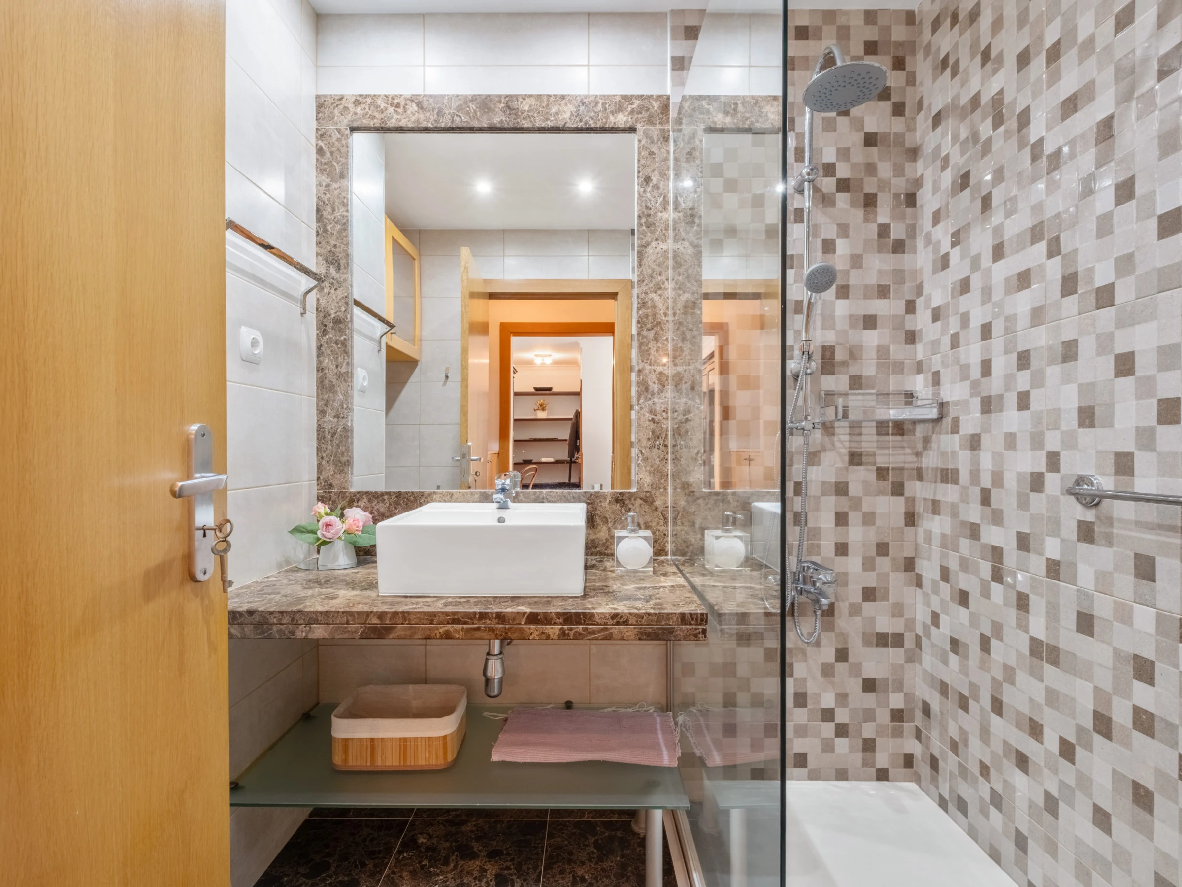 The elegant bathroom, with a spacious shower, ensures comfort and functionality in daily life.
