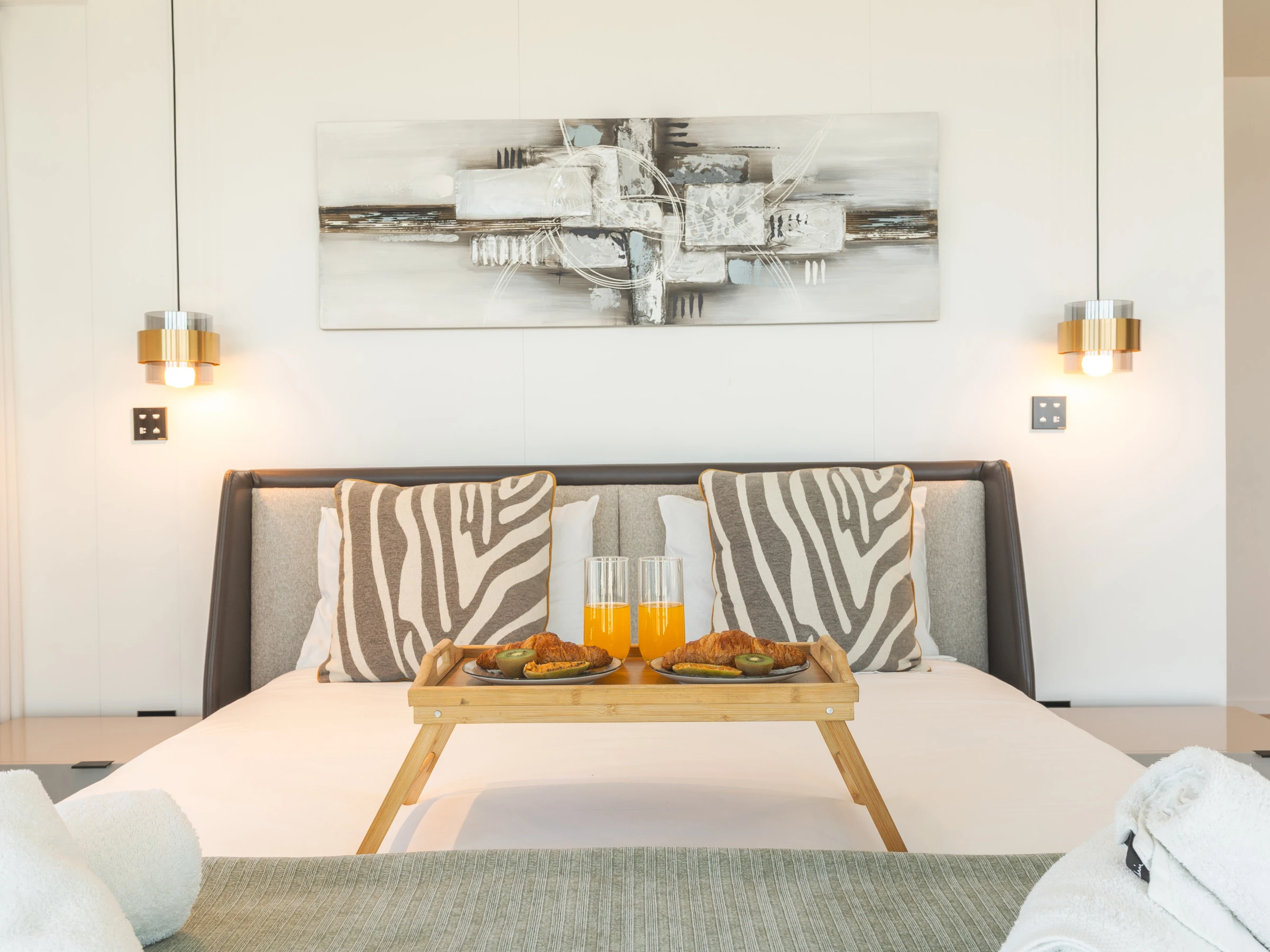The open-concept living area invites relaxation, featuring a smart TV for entertainment. Adjacent is a fully equipped kitchen with a fridge, freezer, microwave, hob, cutlery, plates, and all necessary cookware. A baby cot and chair are available for families with little ones.