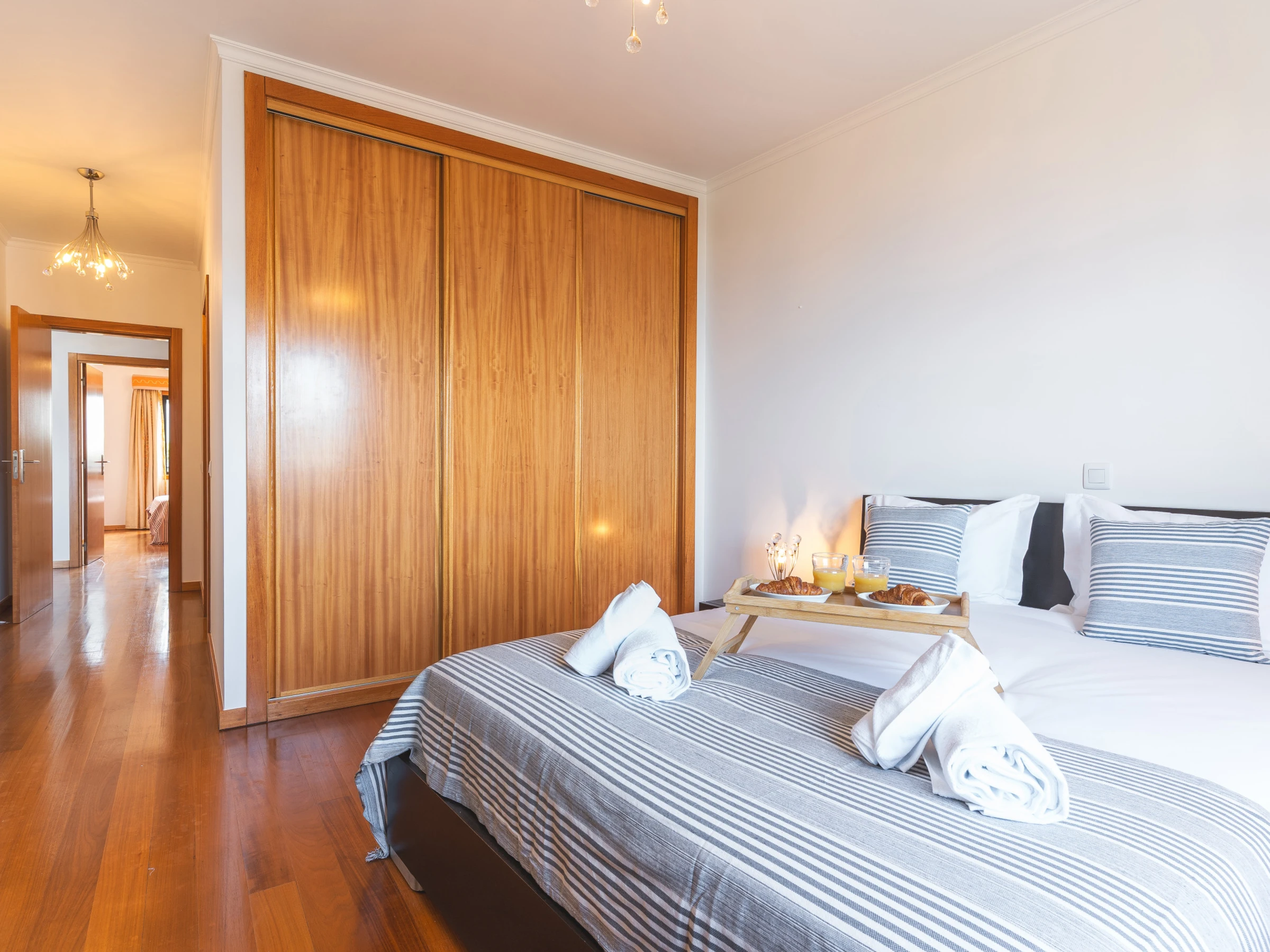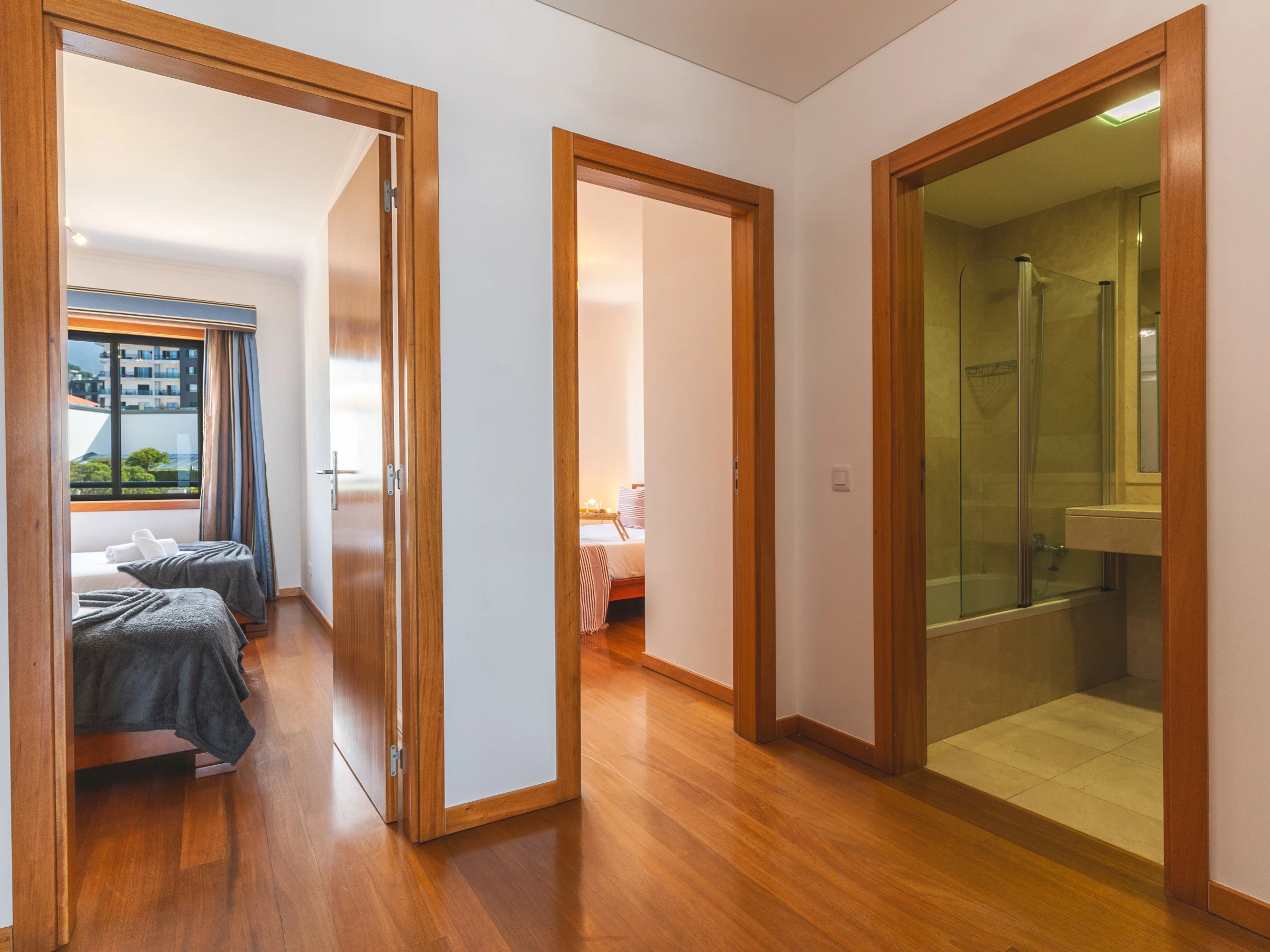 The apartment accommodates up to 6 guests. It offers two bedrooms with queen-size beds and a third bedroom with two single beds, ideal for a range of travel groups. There are two full bathrooms, each with a bathtub, including one en-suite to the master bedroom.