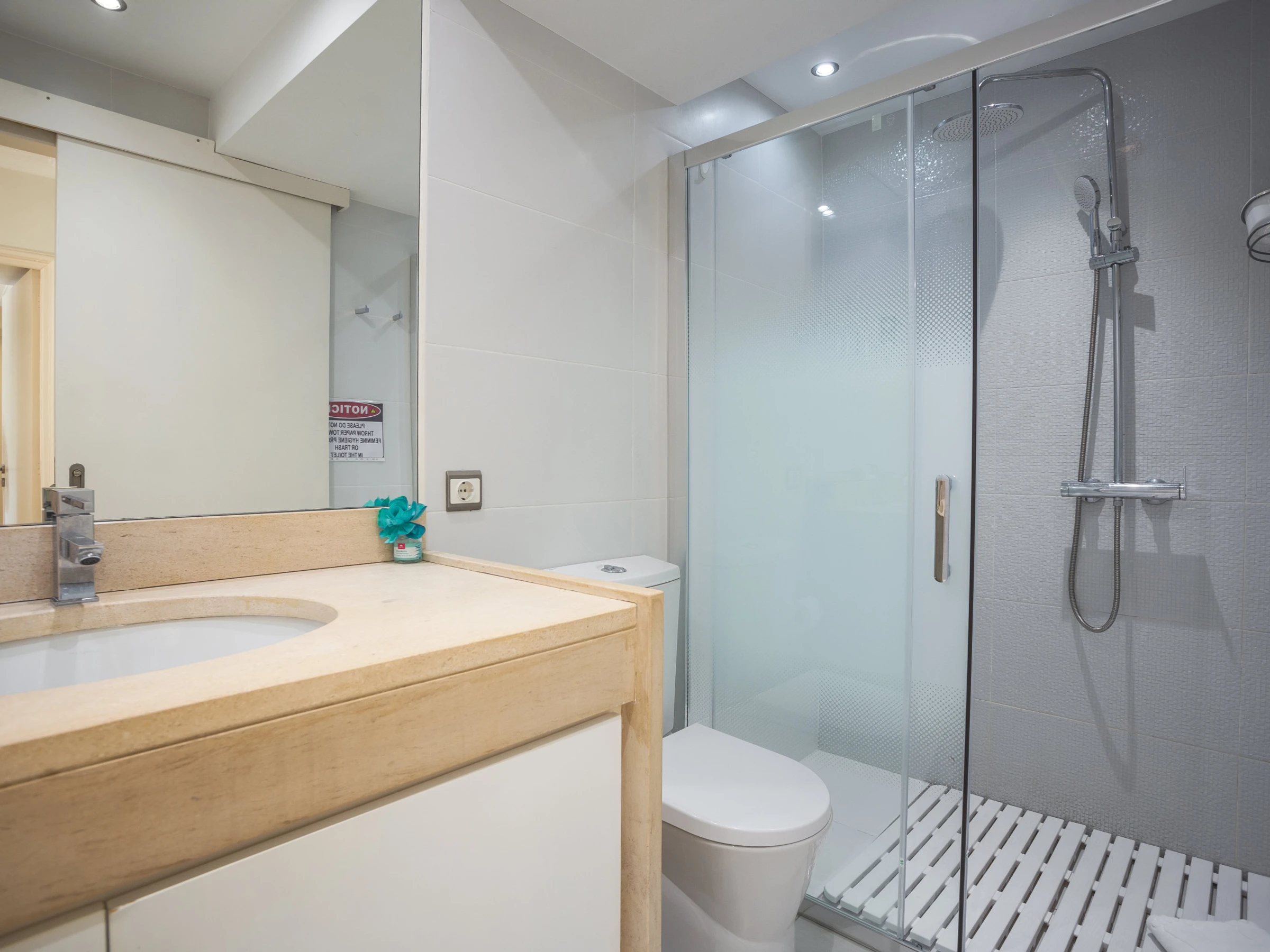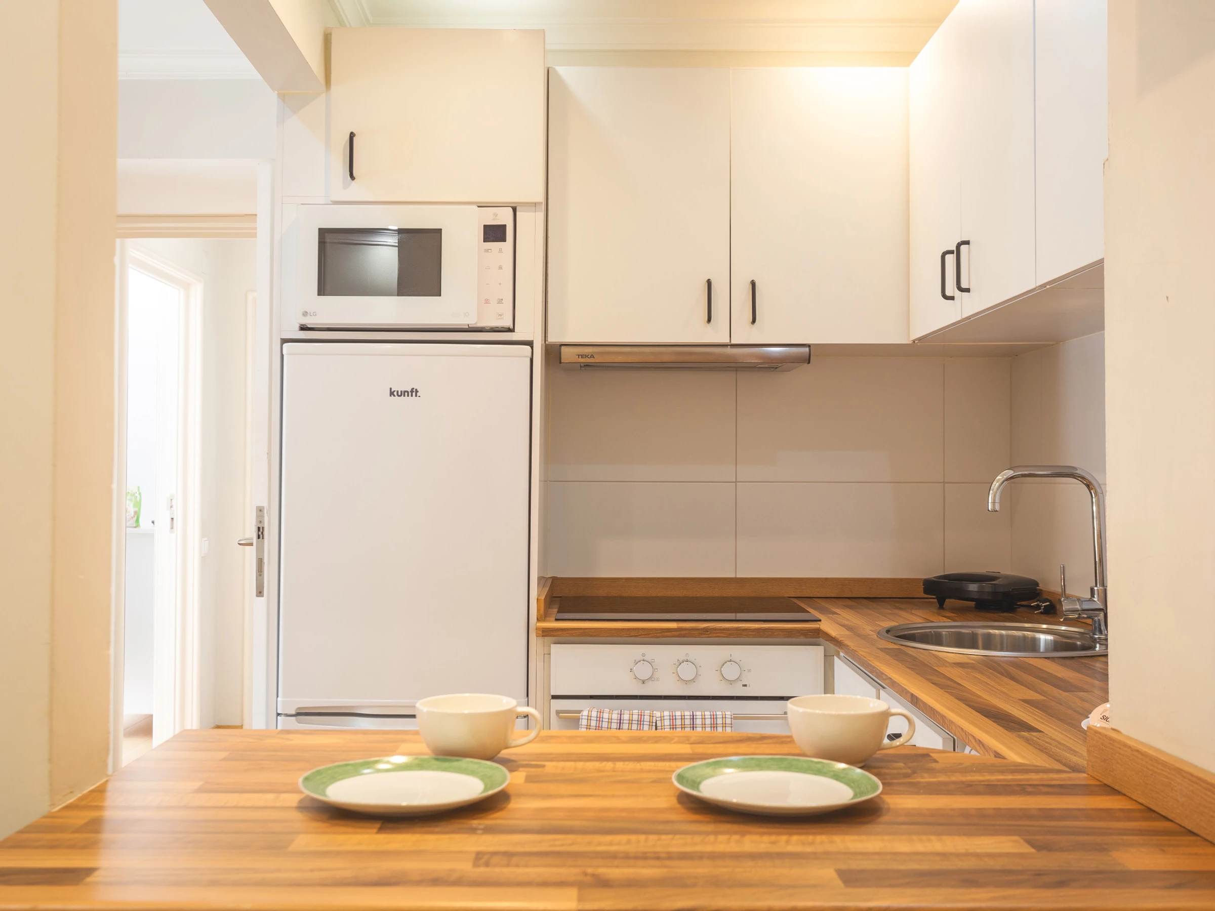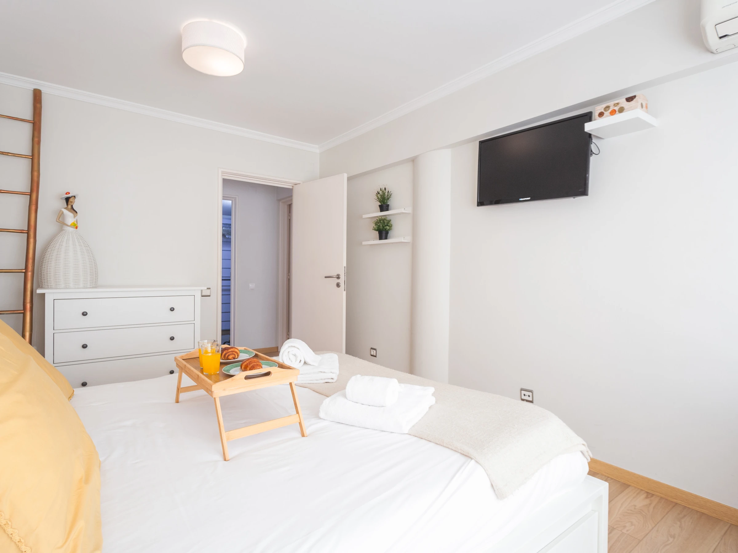 The bathroom is modern, featuring a walk-in shower, and we provide bed linen and bath towels for your stay. Additional amenities include a washing machine and a hairdryer for your convenience. Families traveling with young children can request a baby cot and high chair in advance.