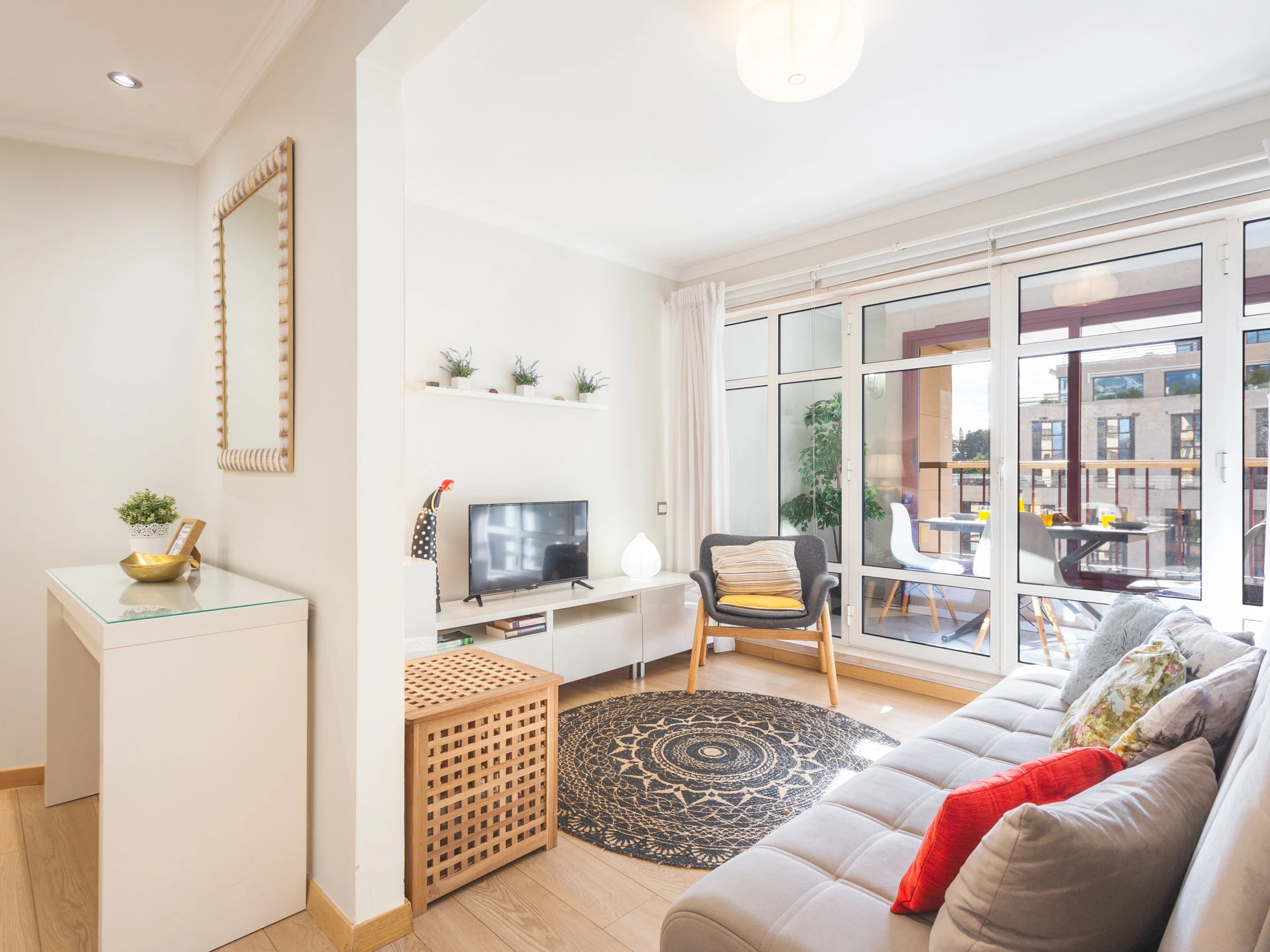 The apartment accommodates up to 4 guests and features a spacious bedroom with a queen-size bed. The living area is inviting and functional, with a smart TV and a comfortable sofa bed for additional guests. The fully equipped kitchen includes all essentials for preparing meals, such as a fridge, freezer, microwave, hob, cutlery, and plates.