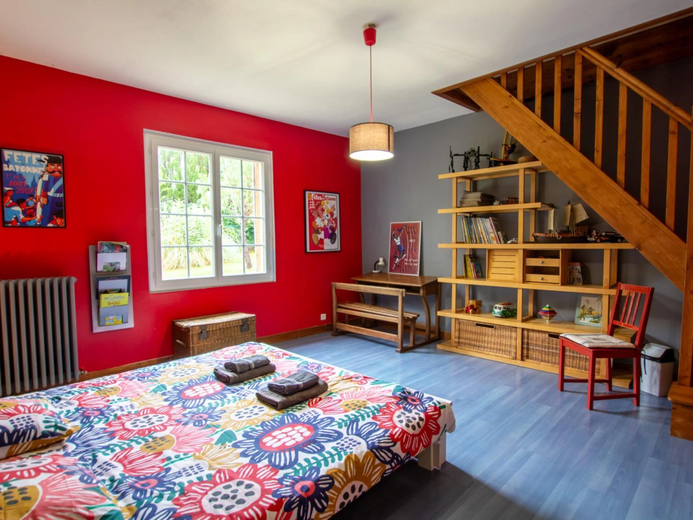 Across the hallway, you will find two ground-floor bedrooms, each with a queen-size bed (one of which can be converted into a single bed in the mezzanine), a bathroom with bathtub and sink, a separate WC, and a utility room equipped with a washing machine and dryer.