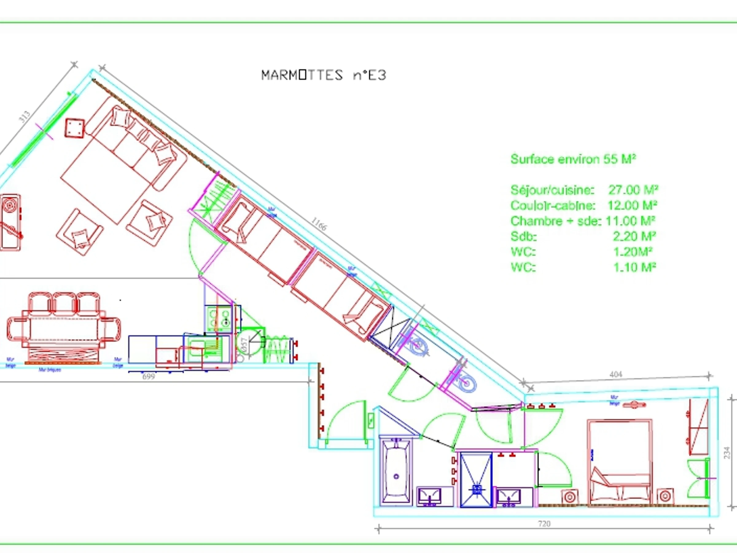 LES MARMOTTES residence, 2-room apartment with sleeping area for 8 people, 3rd floor, view of the slopes, 55m², south-facing, balcony, electric heating.