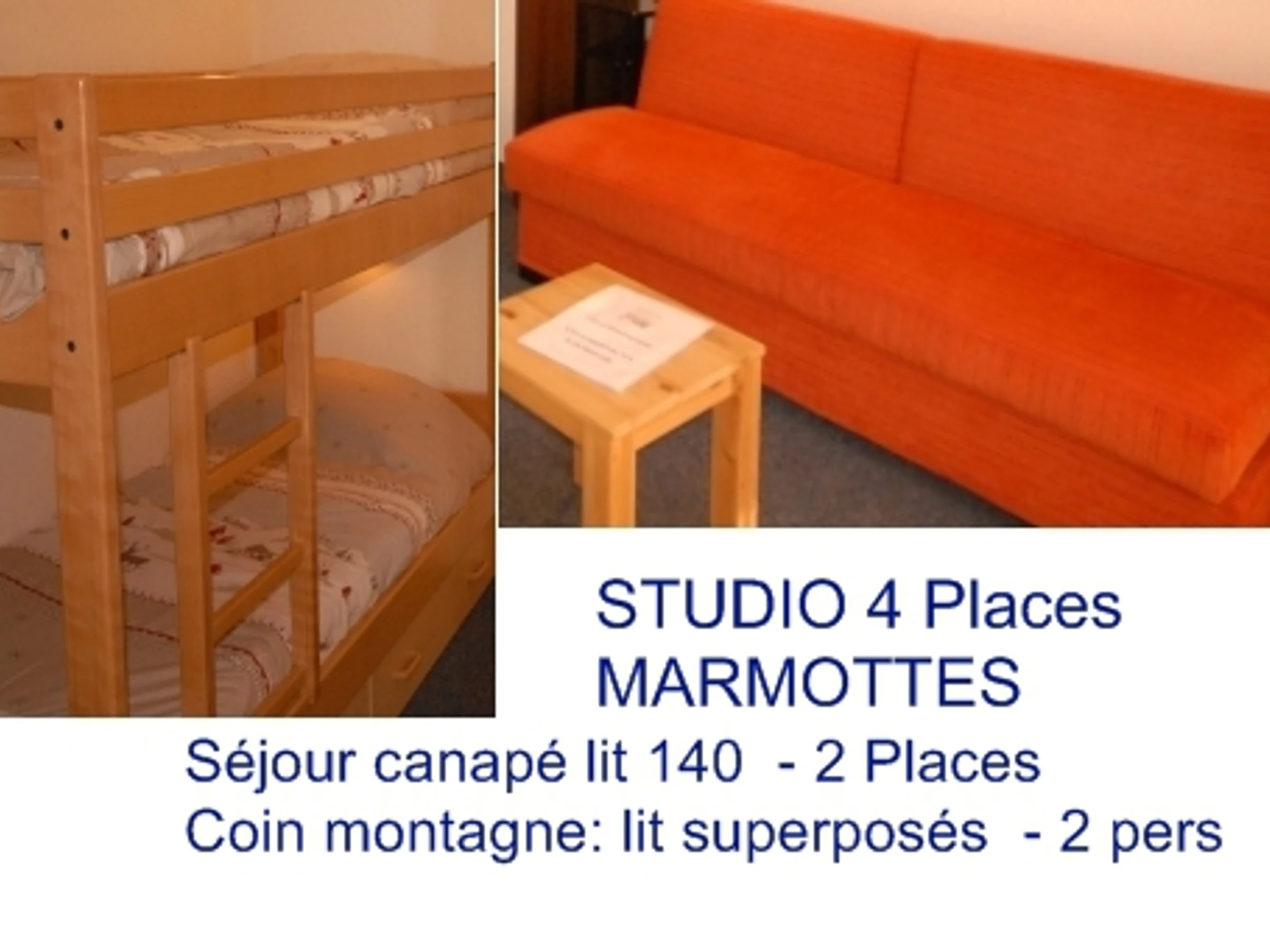 LES MARMOTTES residence, comfortable furnished studio apartment for 4 people, 1st floor without lift, view of the slopes, 24m², south-east facing, electric heating.