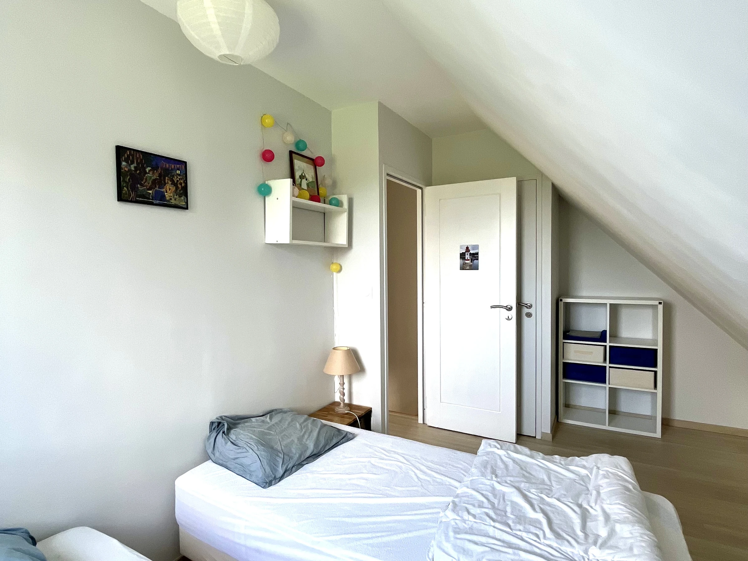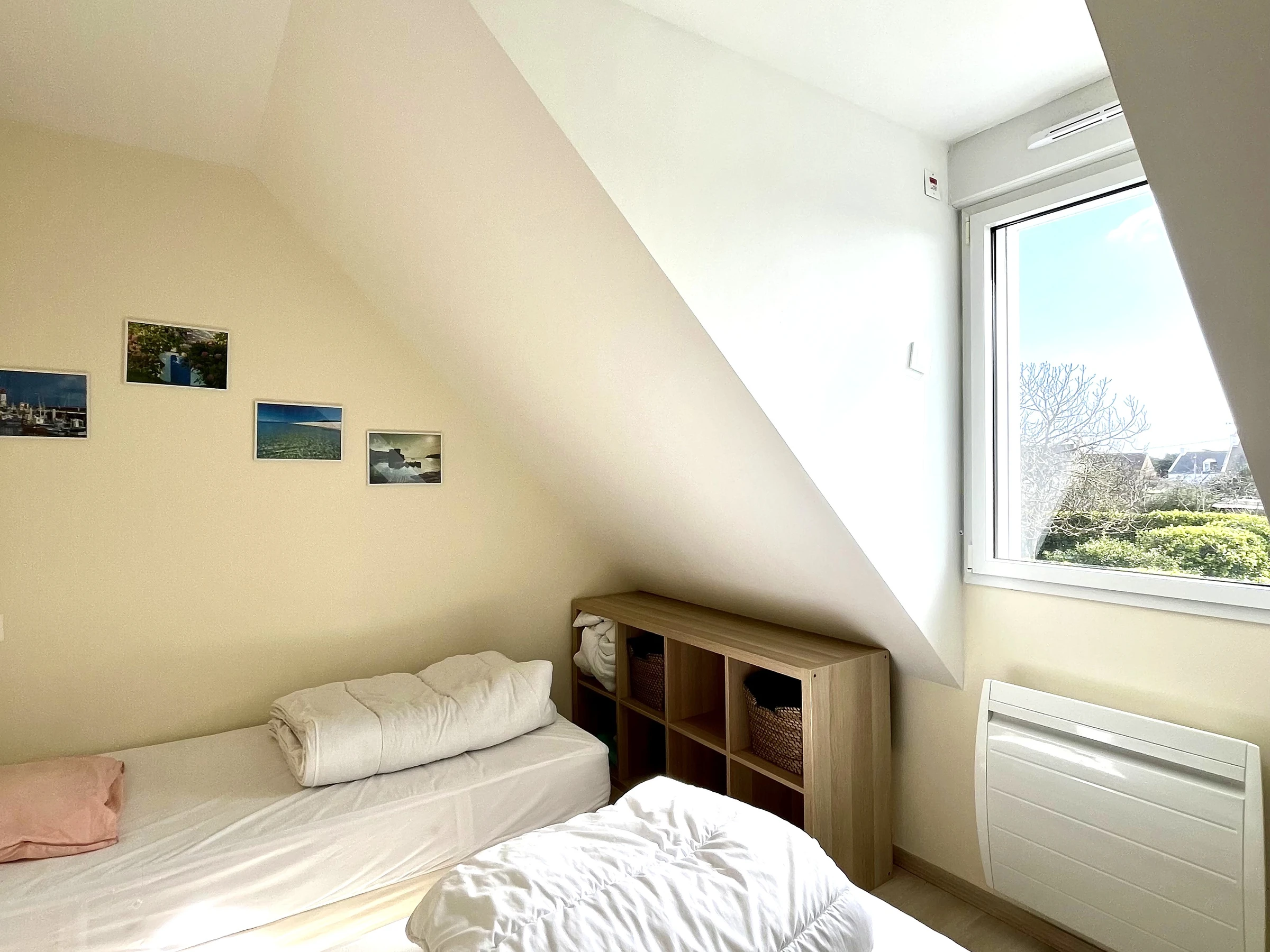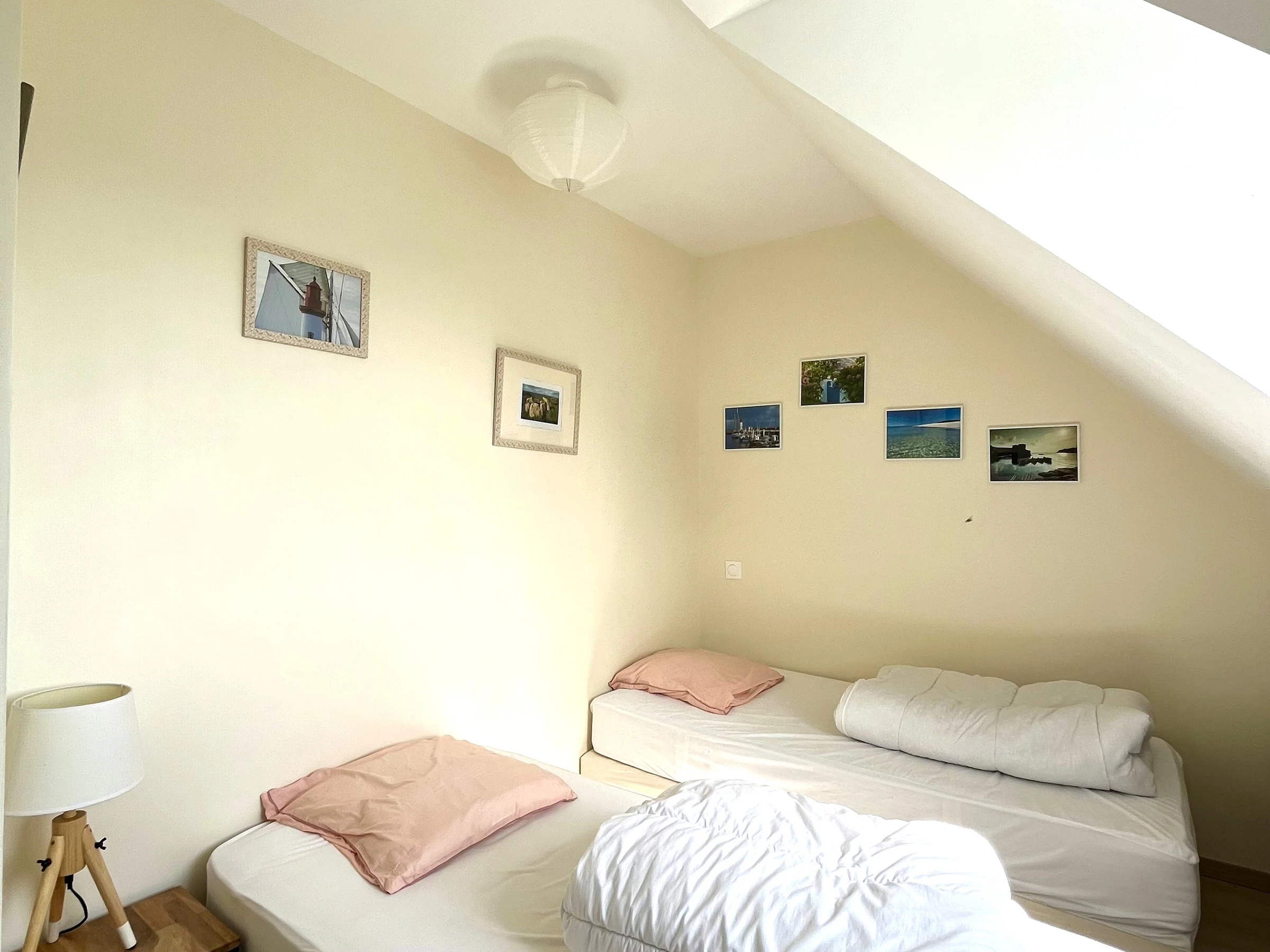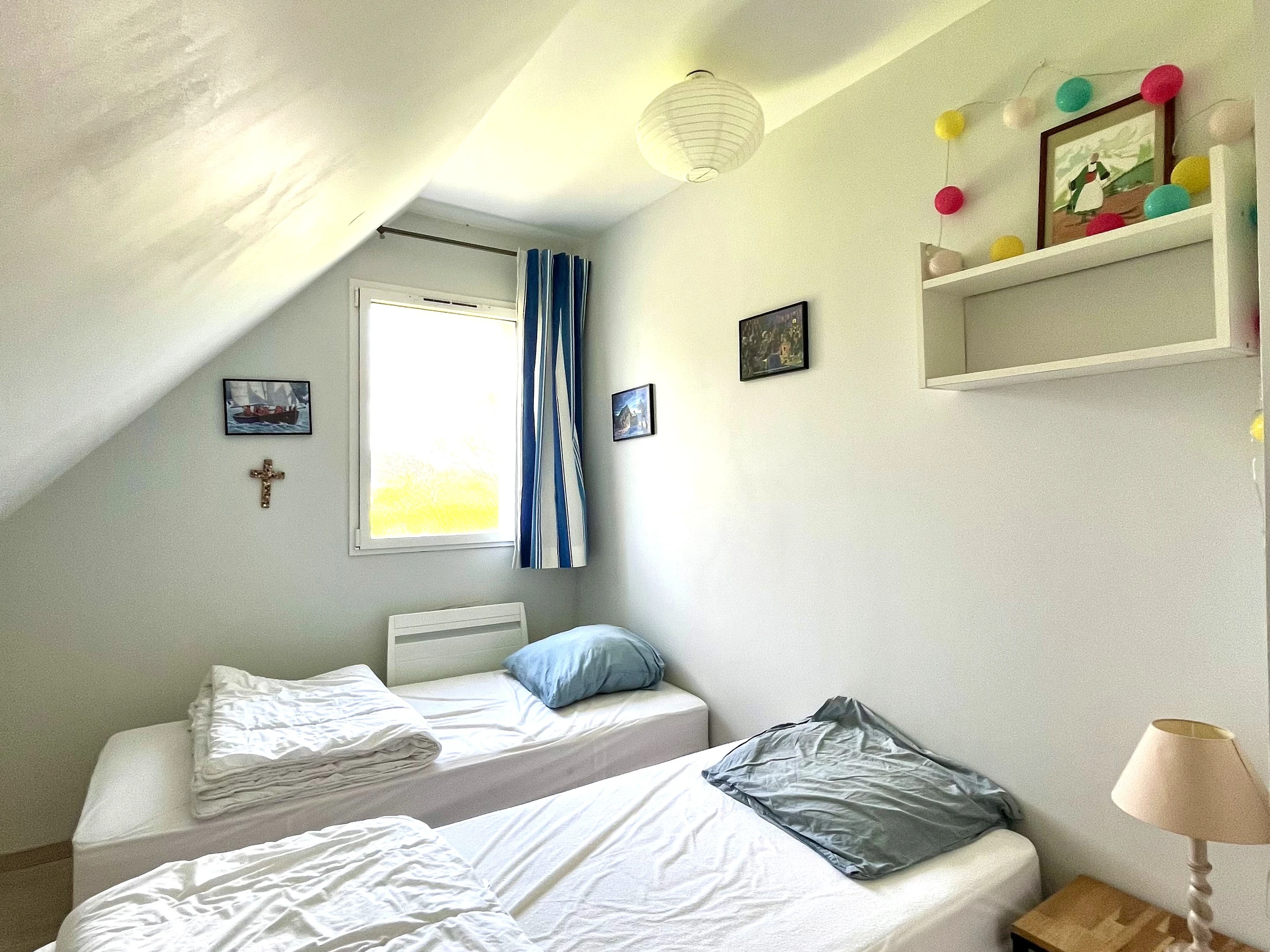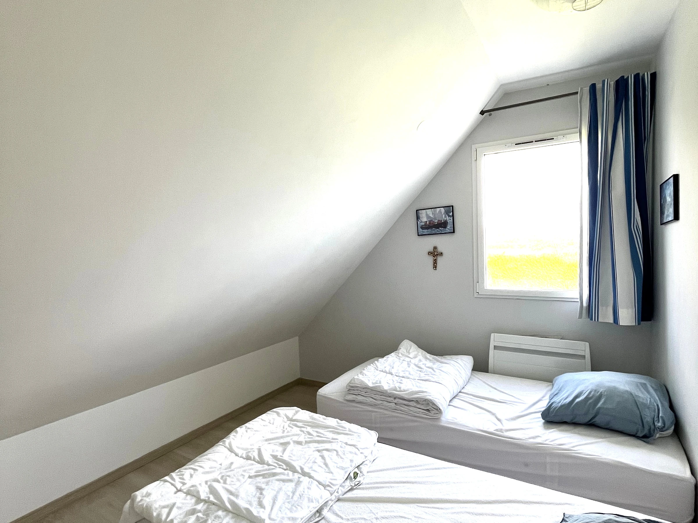 Upstairs: two bedrooms, each with two single beds (90x200 cm) that can be joined to make a king-size bed (180x200 cm).