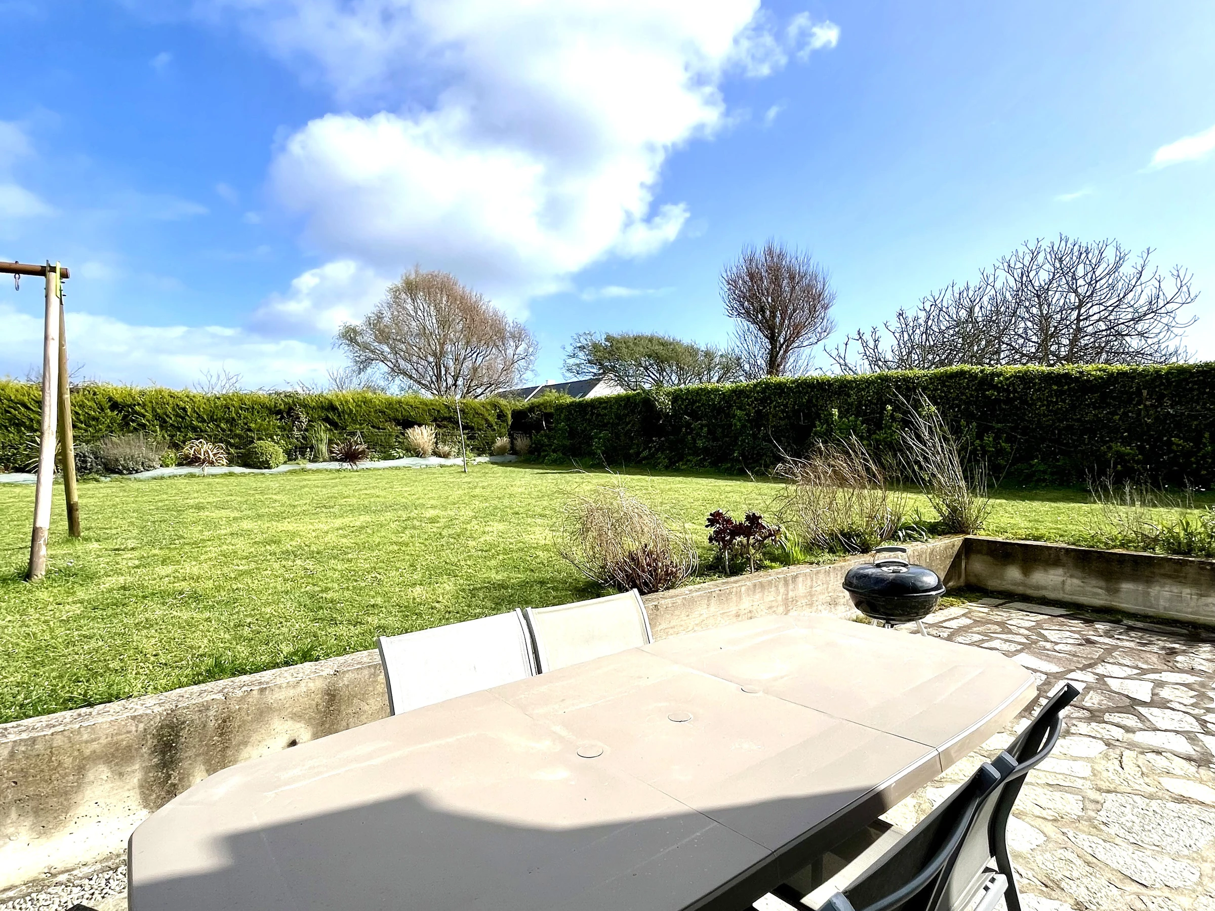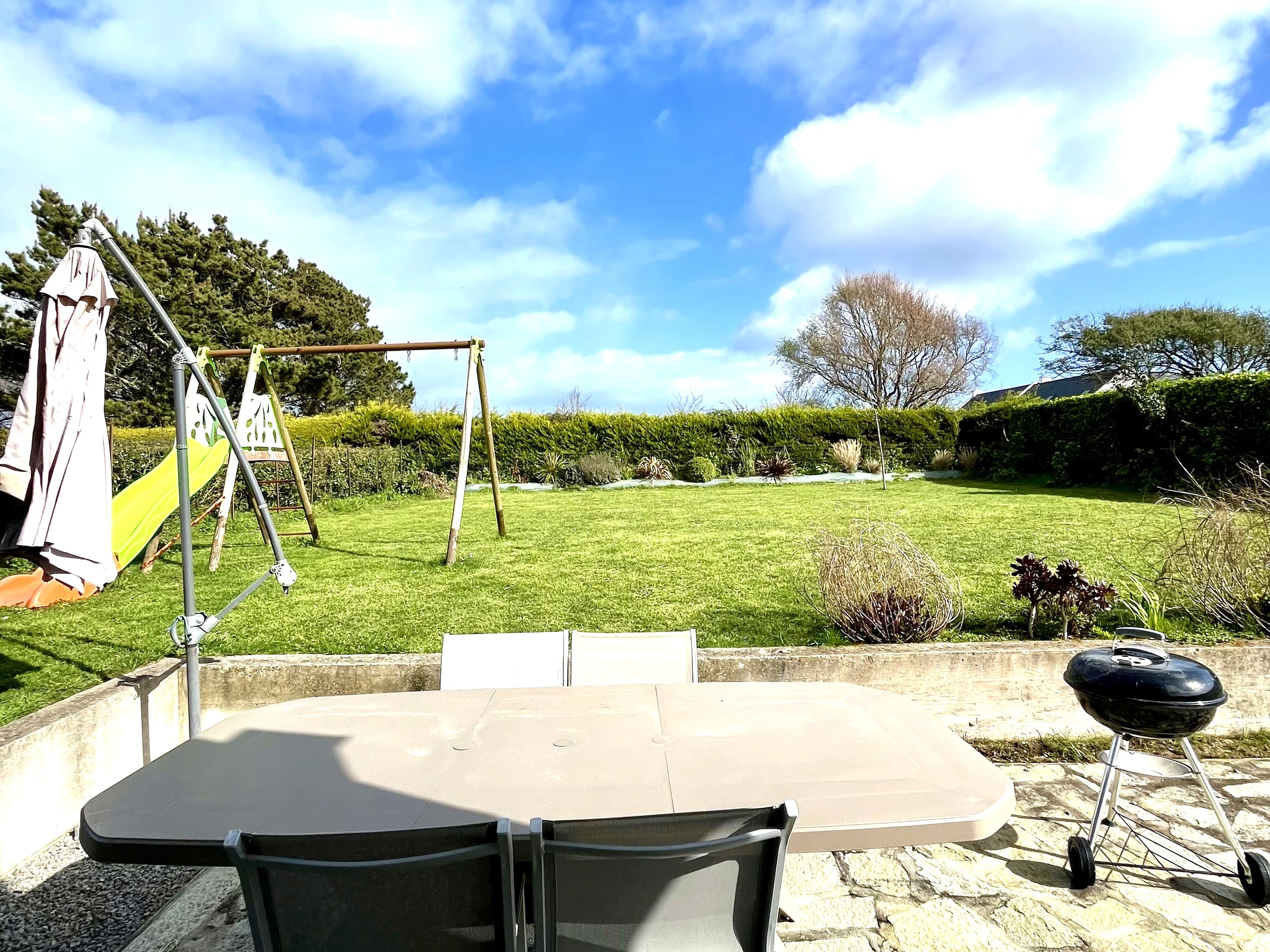 The garden features a large south-facing terrace equipped with a dining table, barbecue, parasol, and sun loungers.