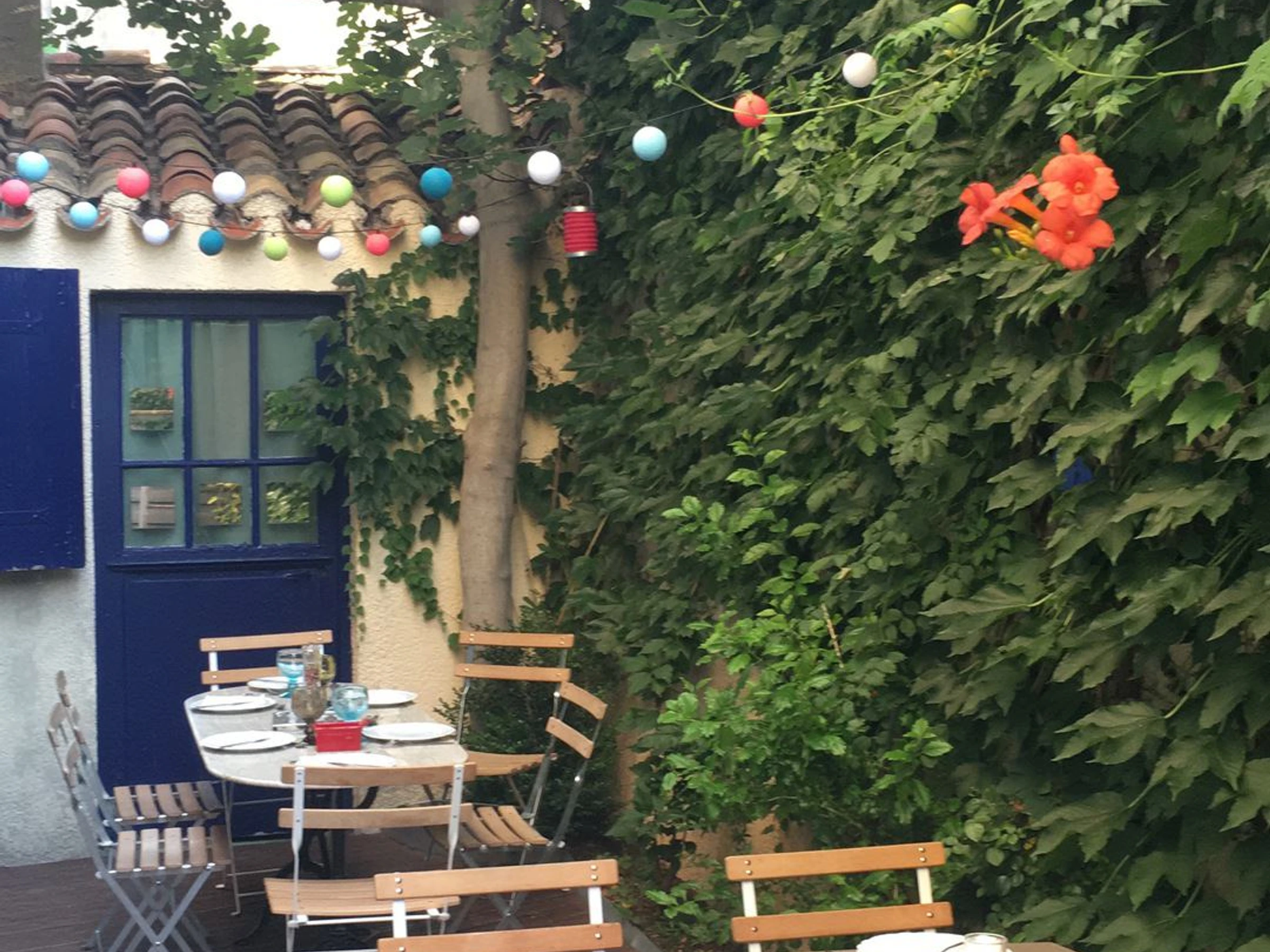 Patio avec salon de jardin, wc extérieur.